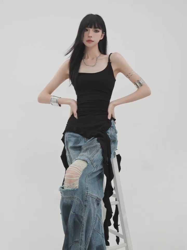Schwarzes asymmetrisches Band -Gurt -Tanktop mit Rüschenkantendesign