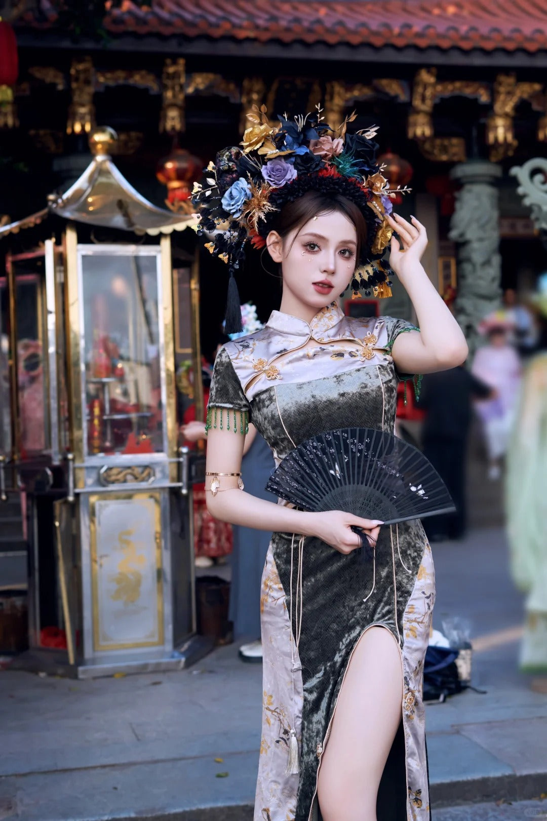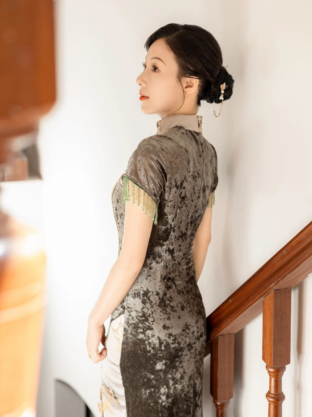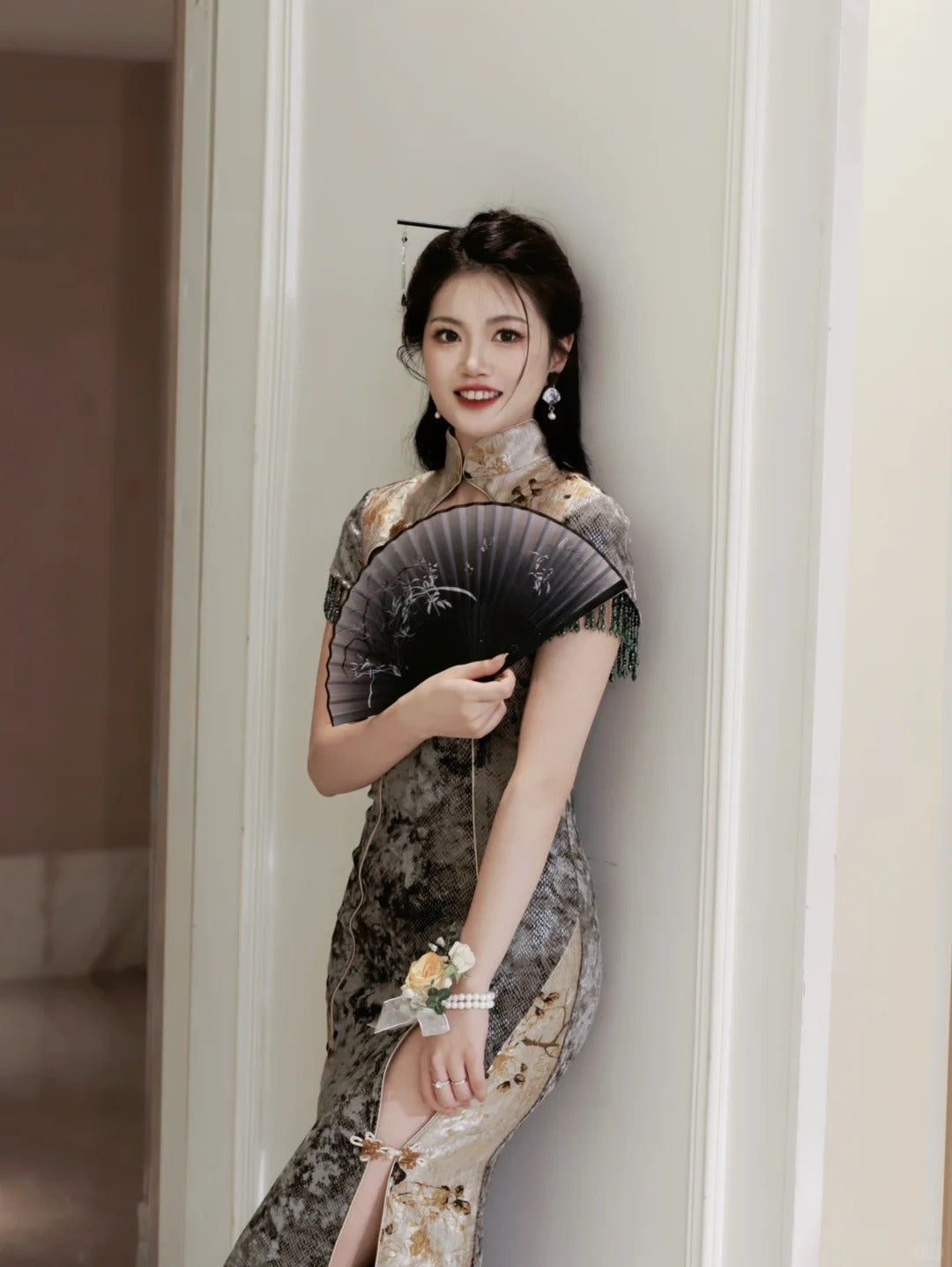 Produktbeschreibung: Diese exquisite Cheongsam wird aus hochwertigen Samtstoffen von Jacquard und Crystal Snake-Print-Velvet hergestellt, wobei ihr raffiniertes und luxuriöses Gefühl betont wird. Das Design enthält Elemente traditioneller Cheongsam -Kragen mit Picot Edge, um ein delikativeres Aussehen zu erzielen. Der Ausschnitt verfügt über akribisch handgefertigte Perlenkettenschleifen. Die lange Silhouette zeigt die weibliche Figur elegant, während der Fischschwanzsaum einen Hauch von Vintage -Charme verleiht. Ein hochschlitzes Design verbessert Bewegung und Atmungsaktivität und enthüllt die Beinkonturen wunderschön. Die Ärmel haben einen einzigartig gekrümmten Umriss, der die Oberarme effektiv verbirgt. Mit polygonaler Kristallperlenverkleidung verziert dieses Kleid mit jeder Bewegung Anmut und Raffinesse.
