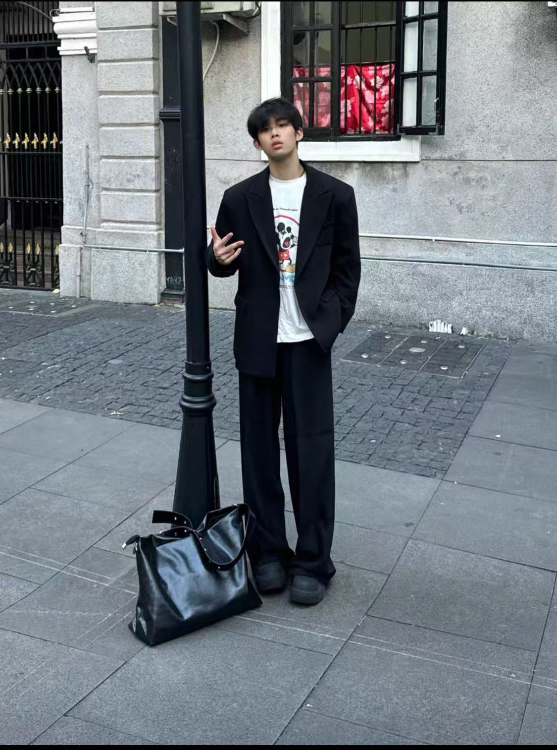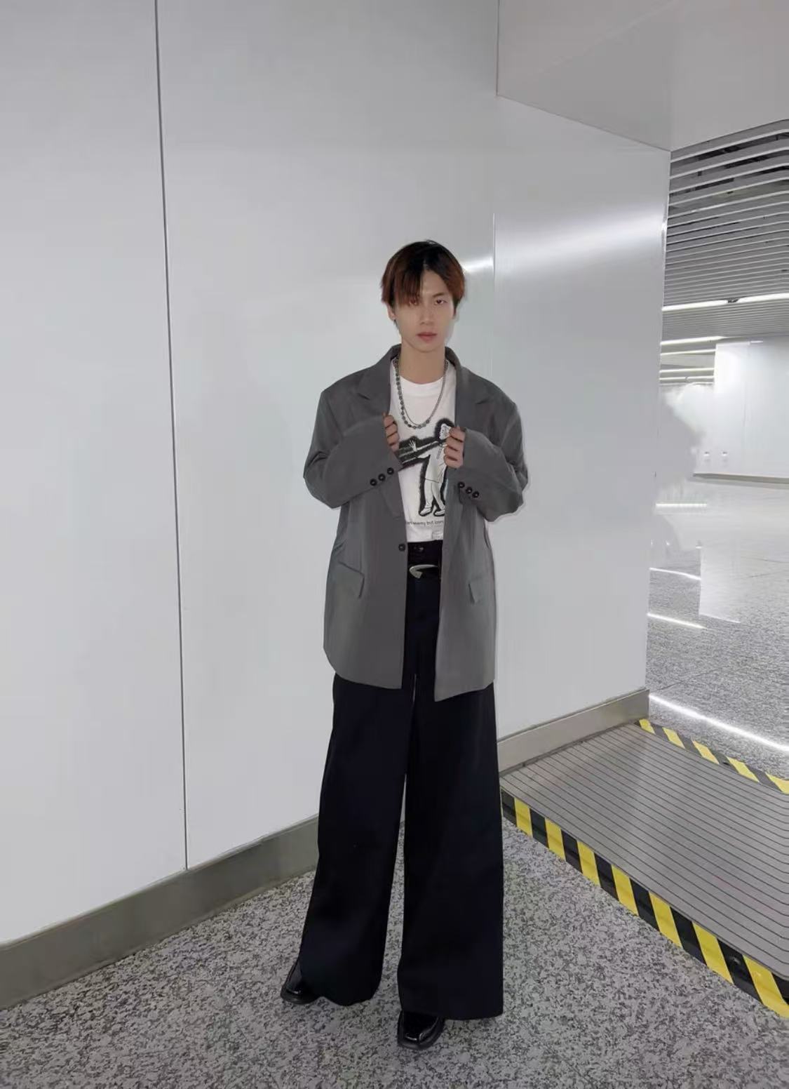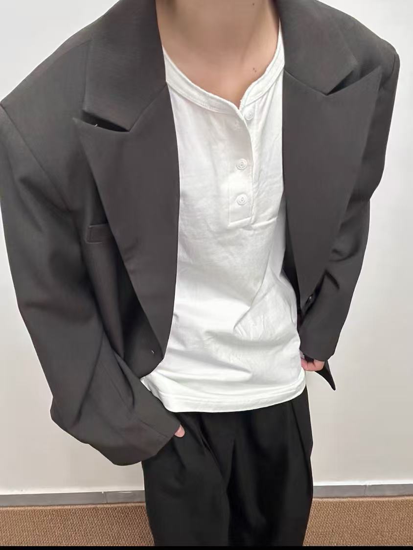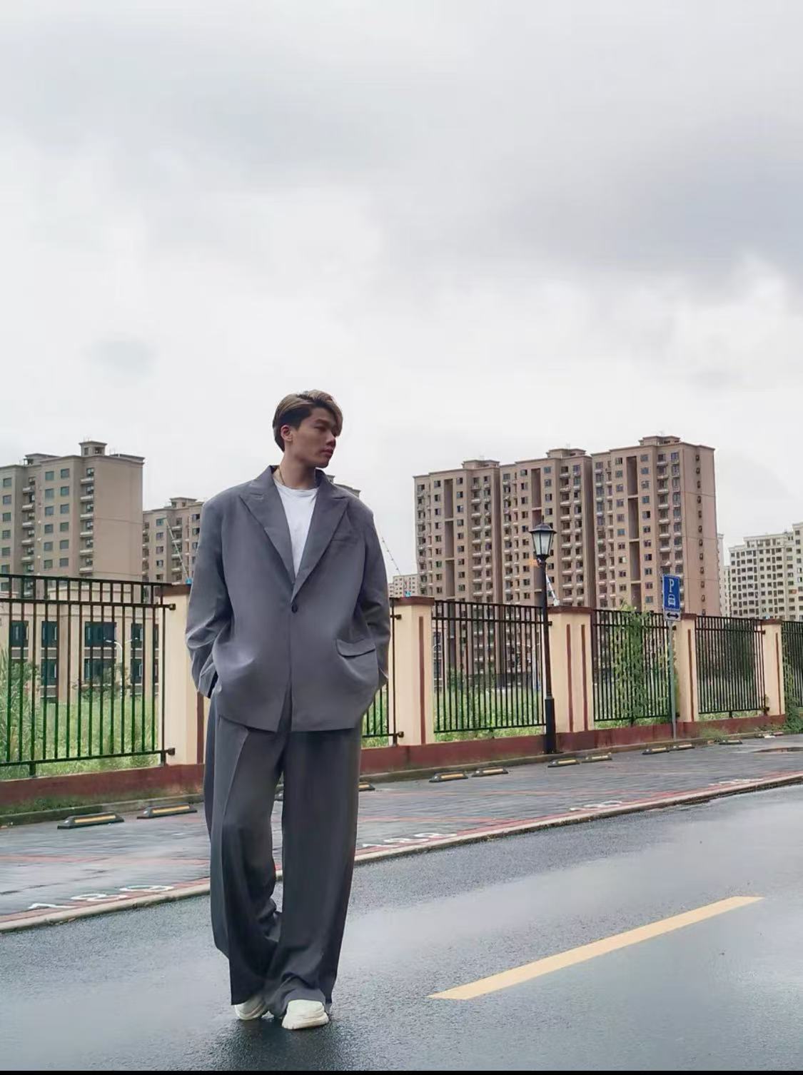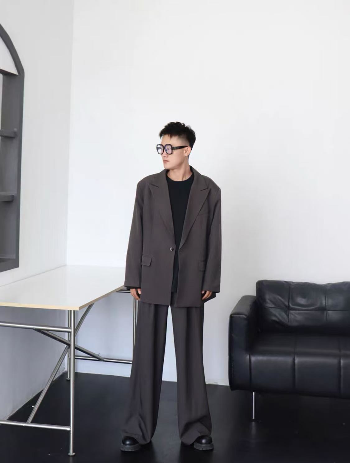 Oversized charcoal grey suit set with a relaxed, draped silhouette. The blazer features wide, structured shoulders, a single-button closure, notch lapels, and flap pockets. The matching trousers are high-waisted and wide-legged, creating a modern and effortless look. Styled with a white T-shirt and white shoes for a striking contrast.