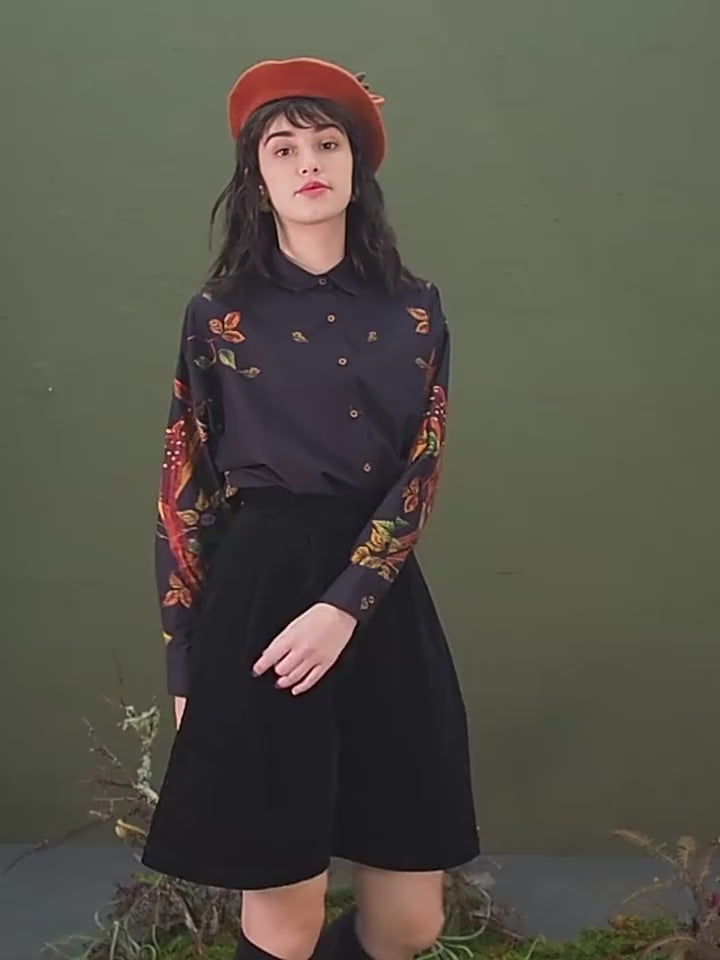 Sumergirse en la encantadora belleza del bosque con nuestro Blusa bordada de ciervos forestales encantados. Los ciervos, a menudo venerados en mitología e historias, encarnan una sensación de misterio y gracia. Esta blusa presenta bordados pintados a mano de un elegante cervatillo que juega en el bosque, con características delicadamente expresadas y flora vívidamente representada que capta la atención. El diseño, aunque simple, conlleva un encanto rústico y una sensación de profundidad, por lo que es una adición única a su guardarropa.