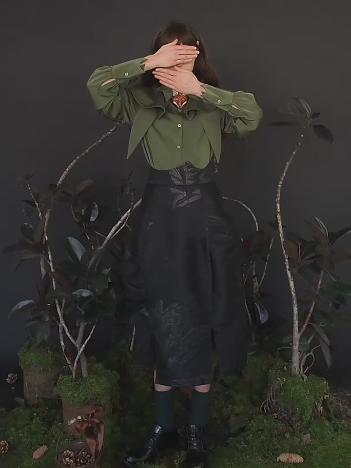 Entrar en un mundo de elegancia con nuestro Blusa de volante de encanto de zorro. Esta blusa presenta un zorro bordado bellamente detallado en el collar, agregando un toque de fantasía de bosque a su conjunto. Diseñado para parecerse a una capa cubierta sobre los hombros, la blusa tiene puntas de cuello puntiagudas y una estructura de collar de múltiples capas, con puños de diseño único. Disponible en tres colores sofisticados: verde oscuro, blanco y azul marino, esta blusa trae un ambiente adorable pero maduro a su guardarropa.