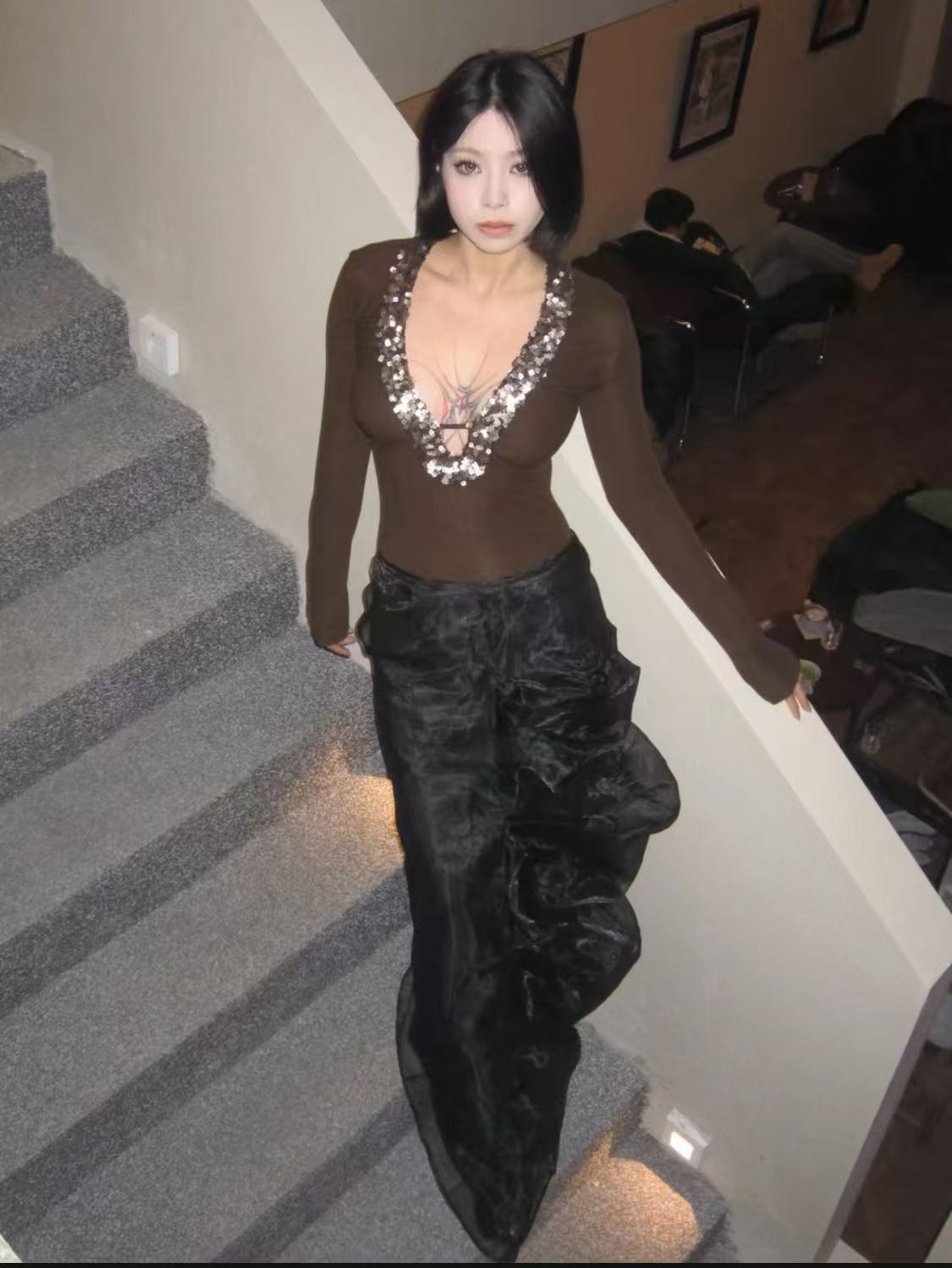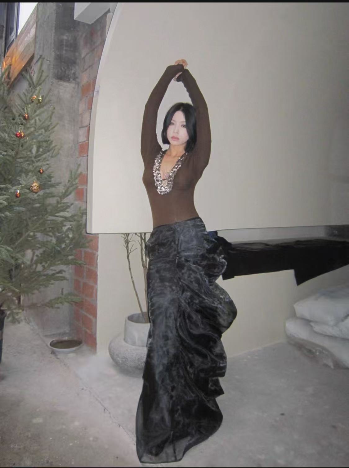 El elegante set Maxi Skirt Set de Jnylon Studio es un vestido negro para mujeres con una superposición transparente y una subestimación sólida. Este set sofisticado combina la elegancia de una falda maxi con la versatilidad de un diseño de dos piezas. Hecho de tela transpirable de alta calidad, garantiza la comodidad y el estilo para cualquier ocasión especial.