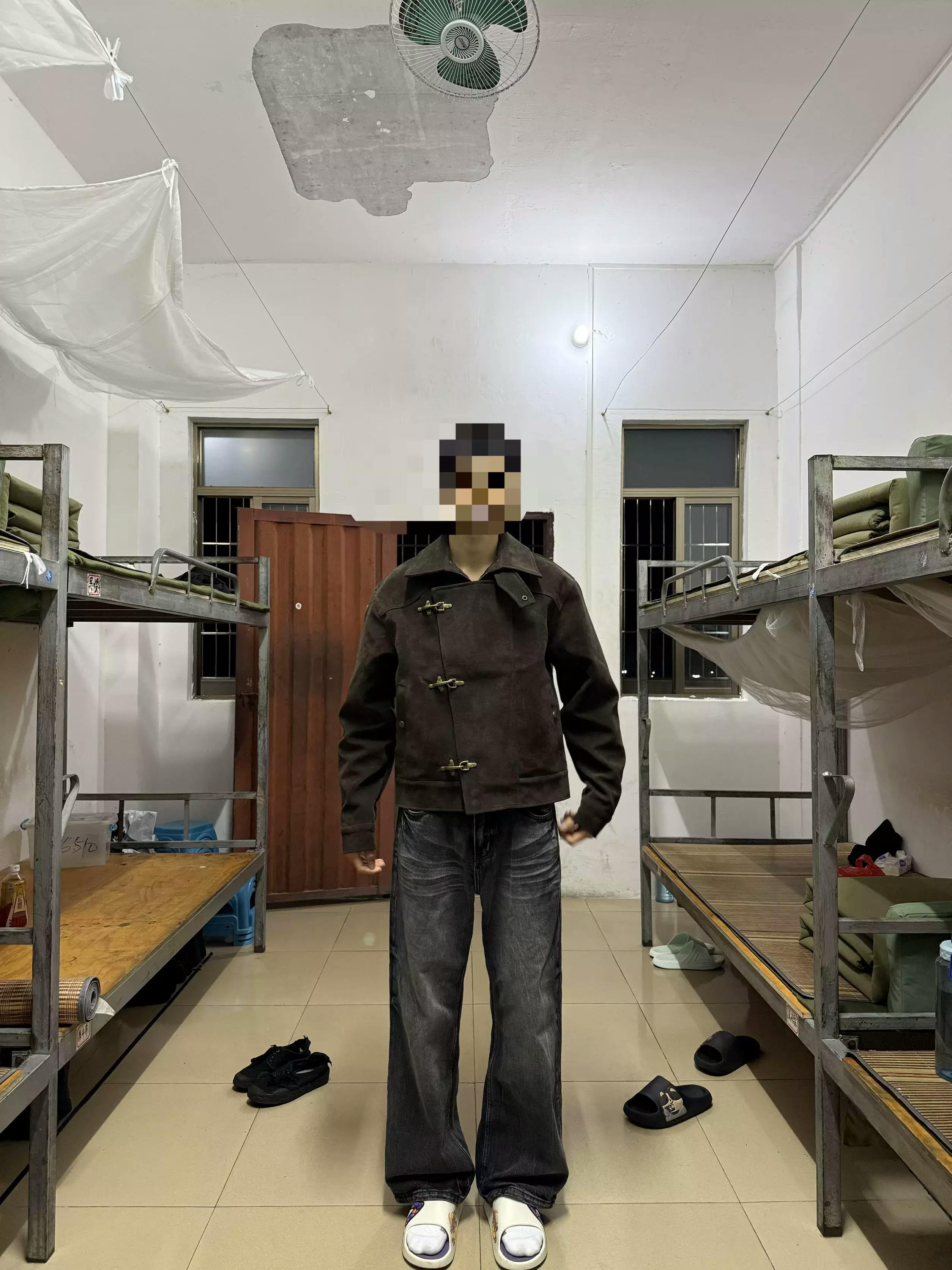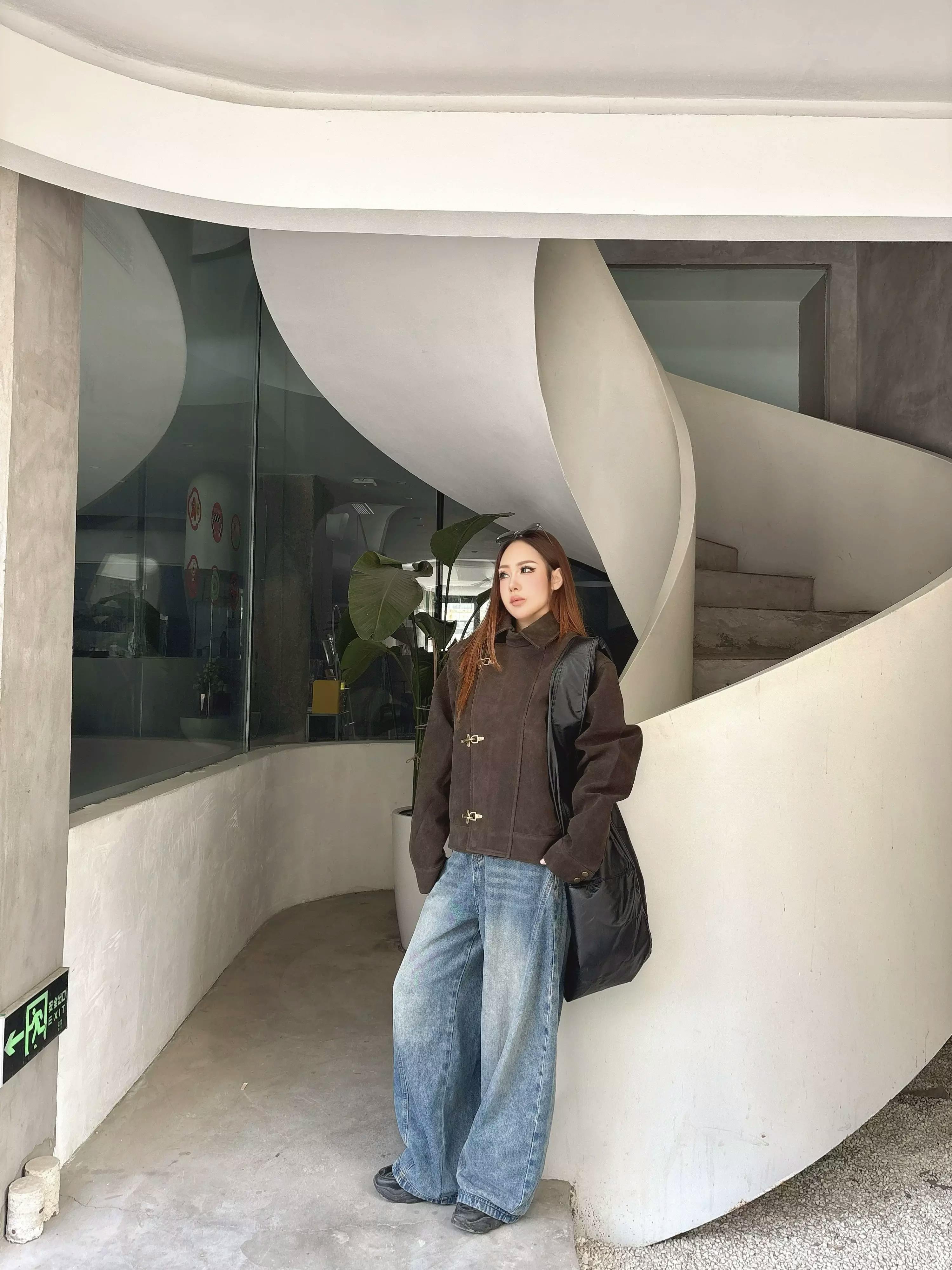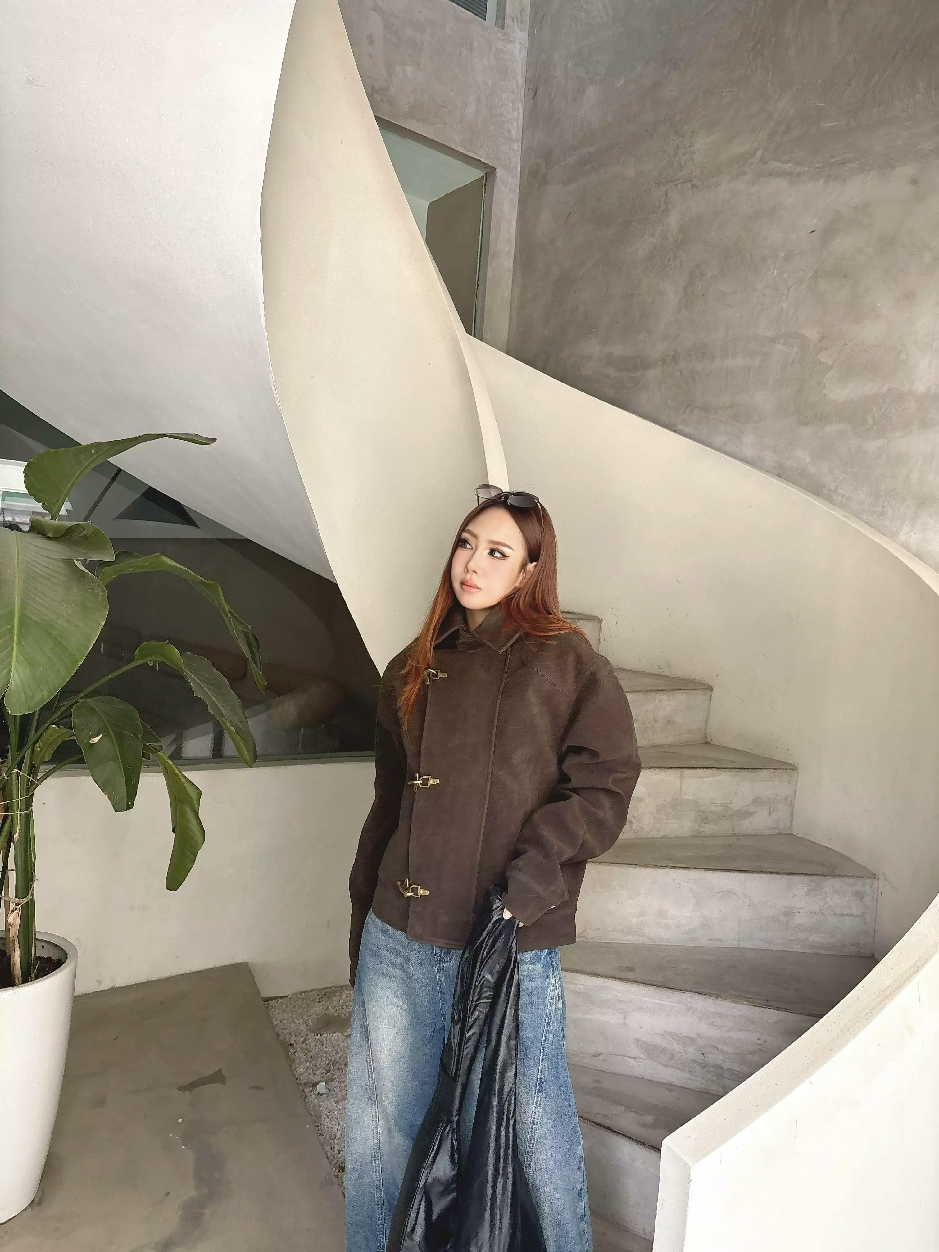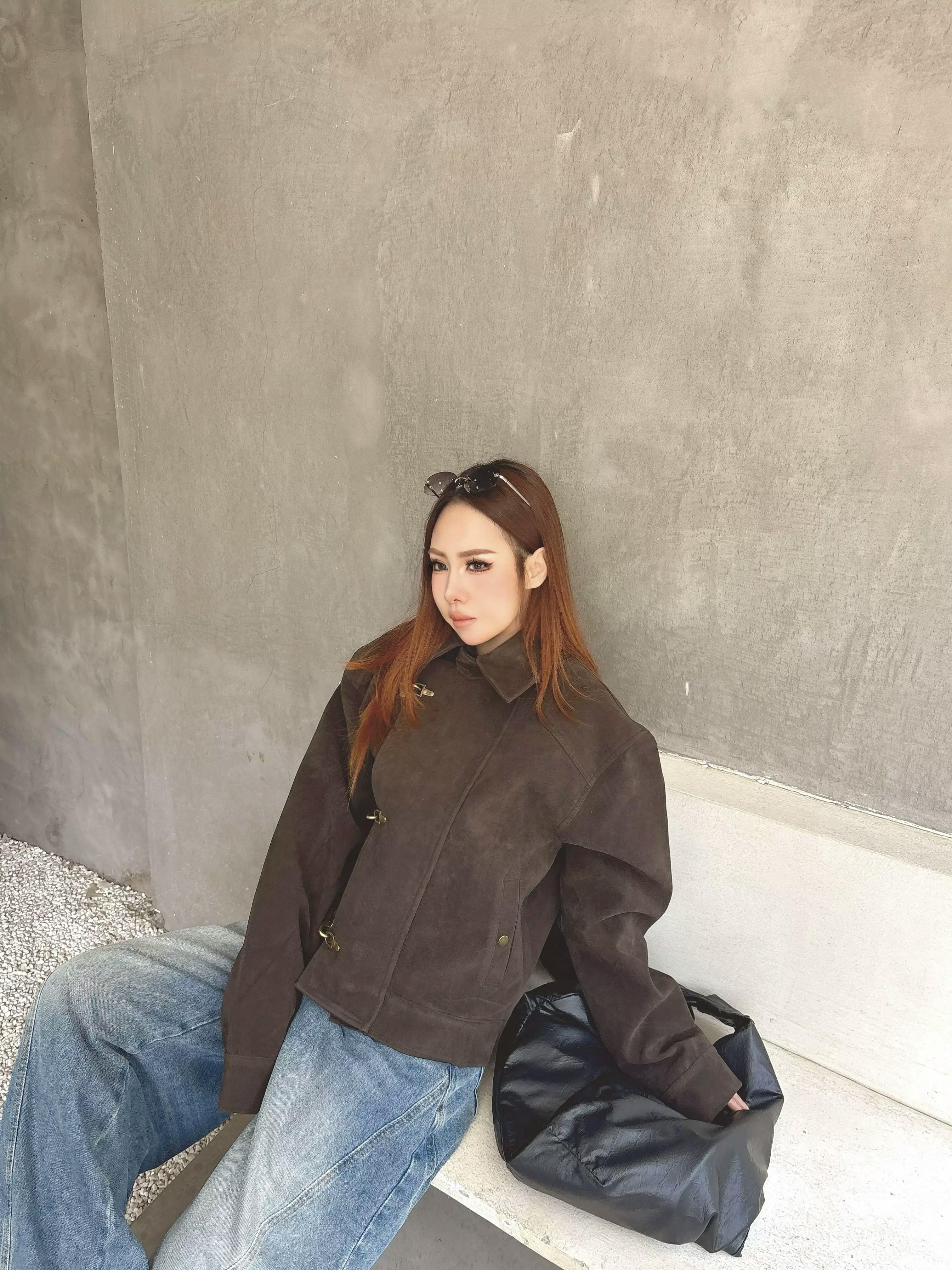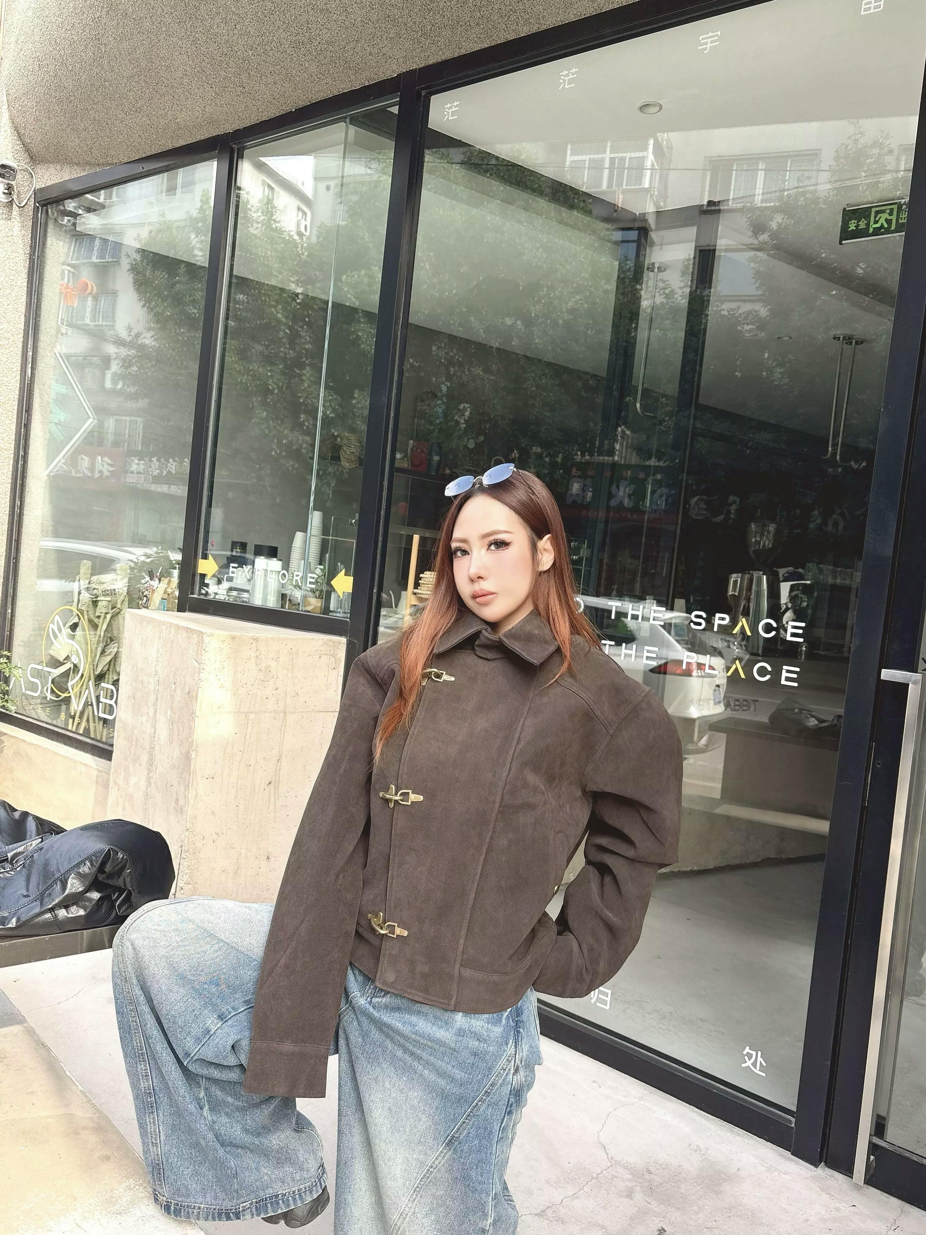 This look showcases a cropped, vintage-inspired dark brown jacket featuring unique toggle fastenings, a structured collar, and a suede-like texture for a premium appearance. The jacket combines retro aviator elements with modern streetwear flair, making it a standout layering piece for everyday wear.