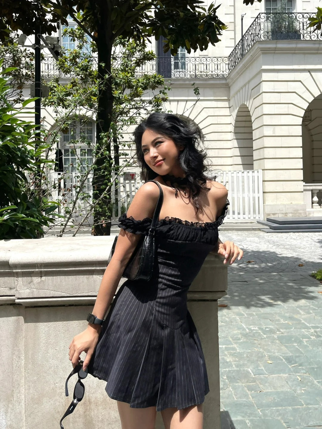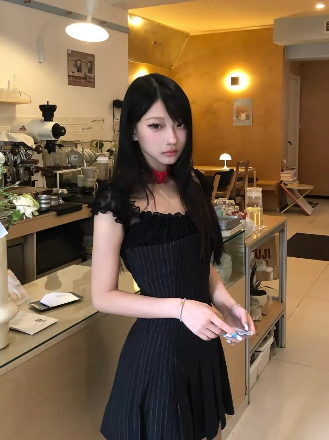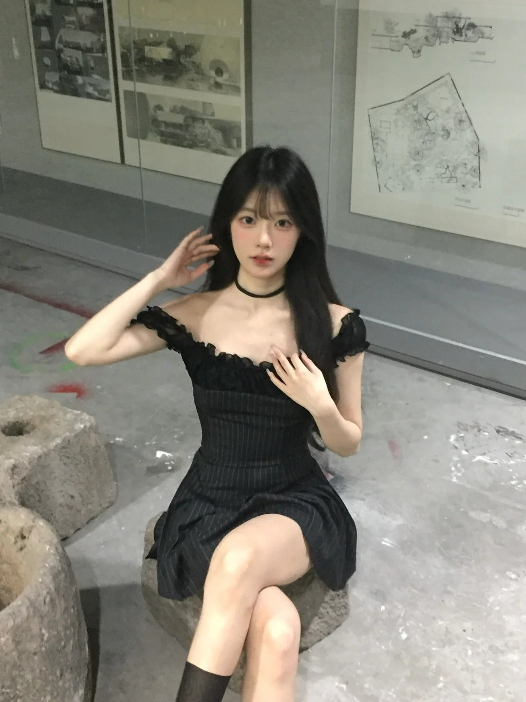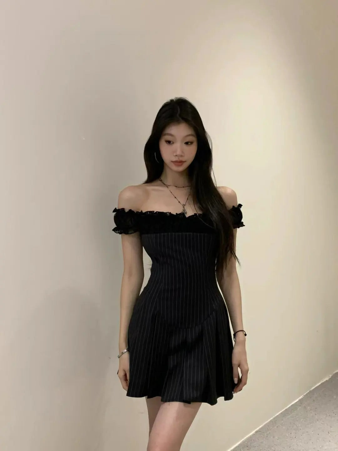 Este es un vestido que combina tela de traje con tela de encaje. El diseñador realizó múltiples mejoras para lograr un mejor efecto de pliegue. Cuenta con una forma de plisado única que acentúa mejor la relación cintura-cadera. El material contrastante en los hombros agrega riqueza a toda la prenda sin crear conflictos, ya que todas las telas están en colores profundos. Este diseño es sofisticado y único, transformándolo instantáneamente en una chica caliente.