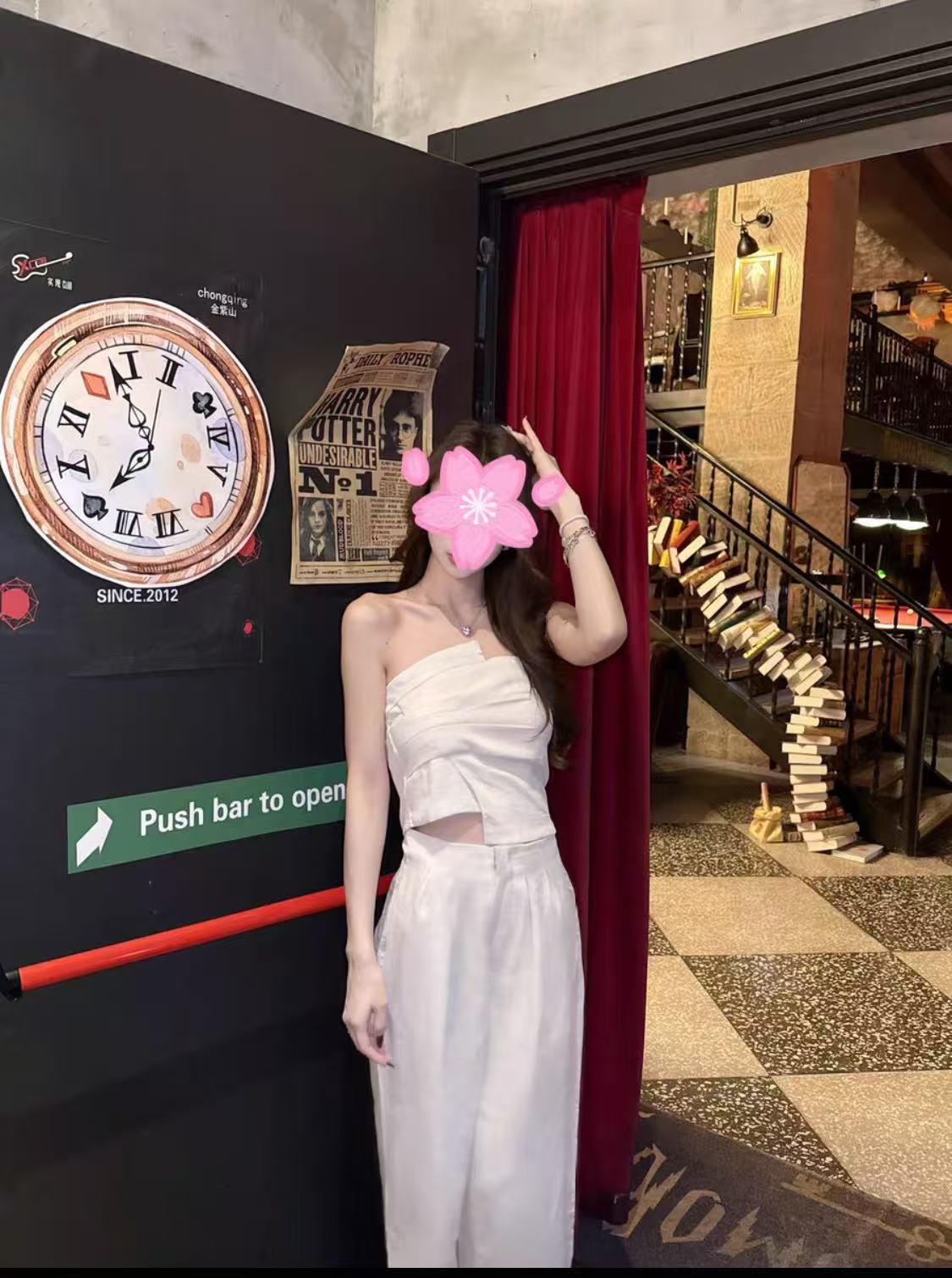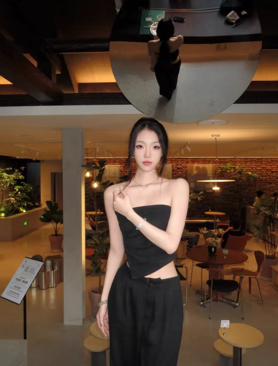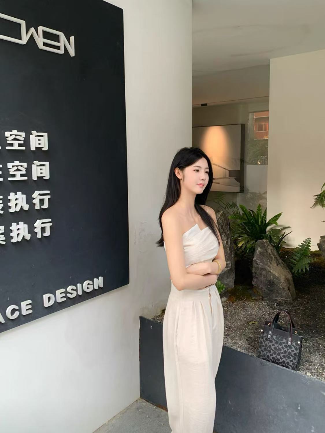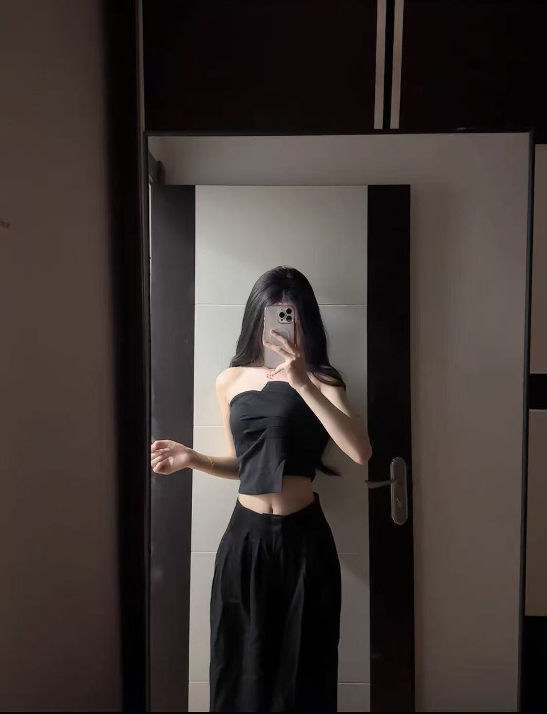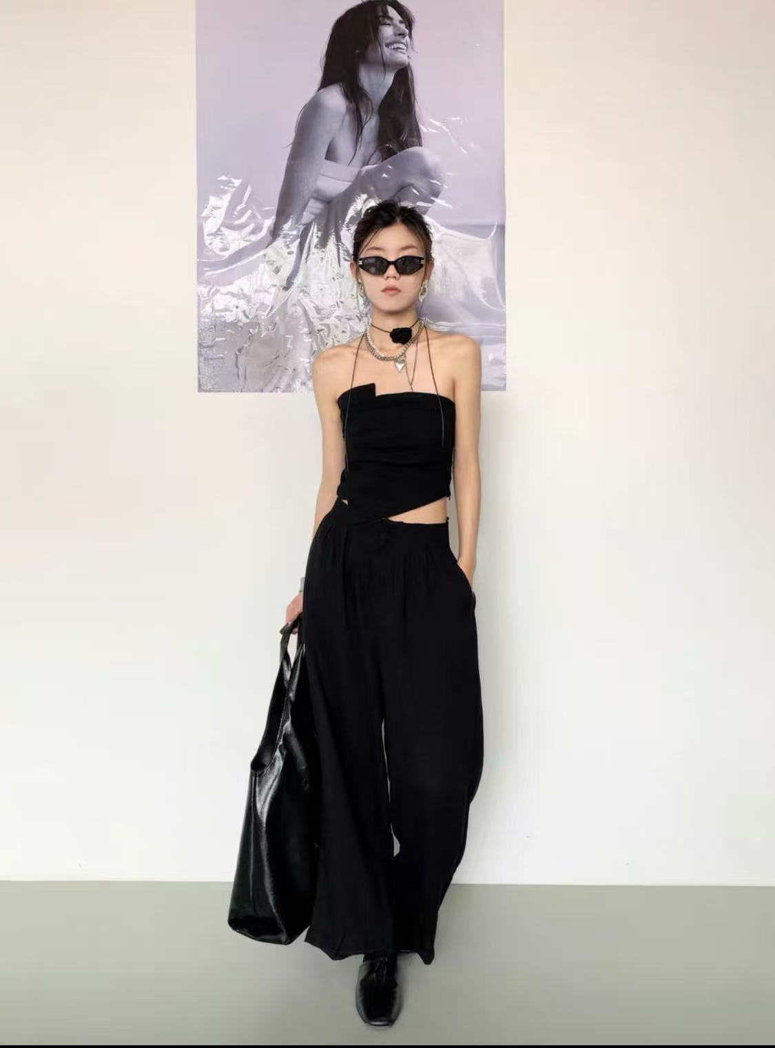 • Two-Piece Set: Strapless top and wide-leg pants.