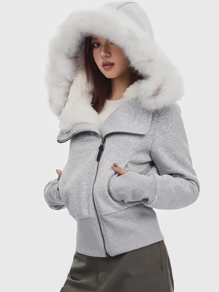 Zip-Up Hoodie with White Faux Fur Hood Trim