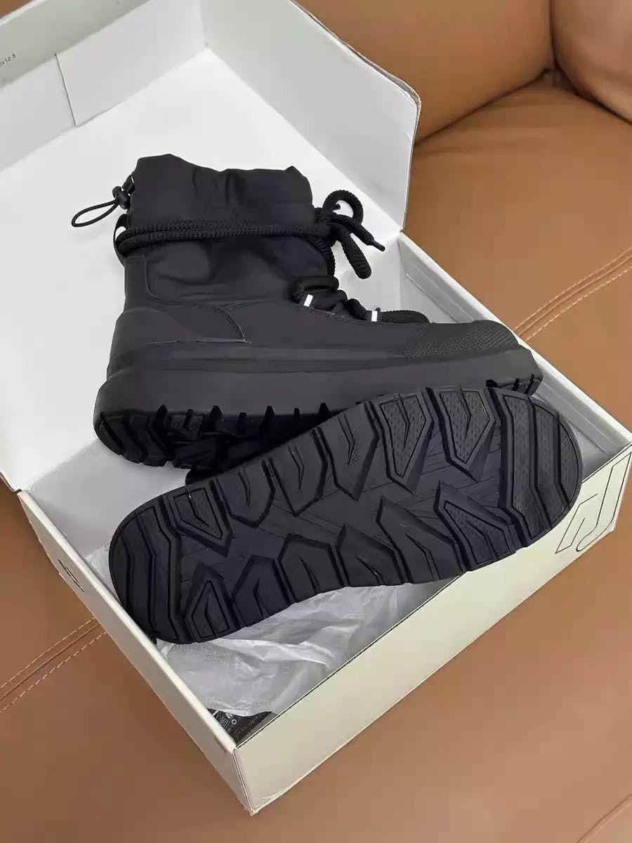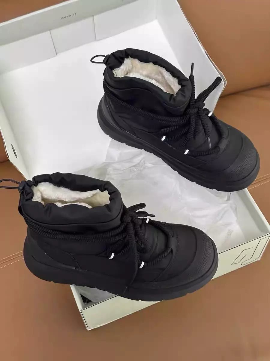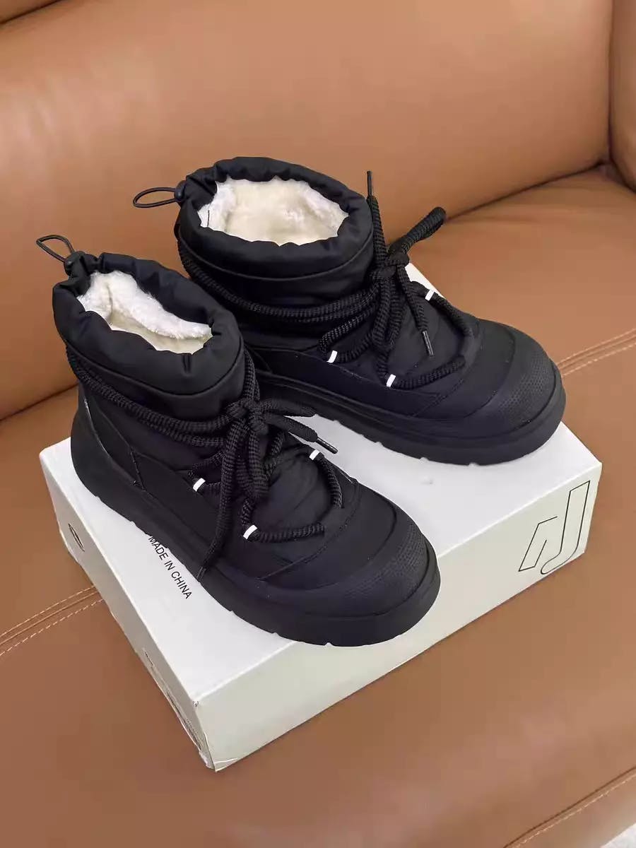 These boots blend utilitarian function with a bold, street-ready aesthetic. Designed for winter urban adventures, they feature a chunky, high-traction rubber sole and a round toe for comfort and stability. The upper is constructed from a mix of durable synthetic materials, while the interior is fully lined with plush, faux long wool for exceptional warmth. The short boot shaft (10–20cm) is padded and finished with an adjustable drawstring collar, ensuring a secure, insulated fit that keeps out the cold. Minimalist in appearance but substantial in build, these boots are ideal for those who want both practical protection and a statement look in harsh winter conditions.