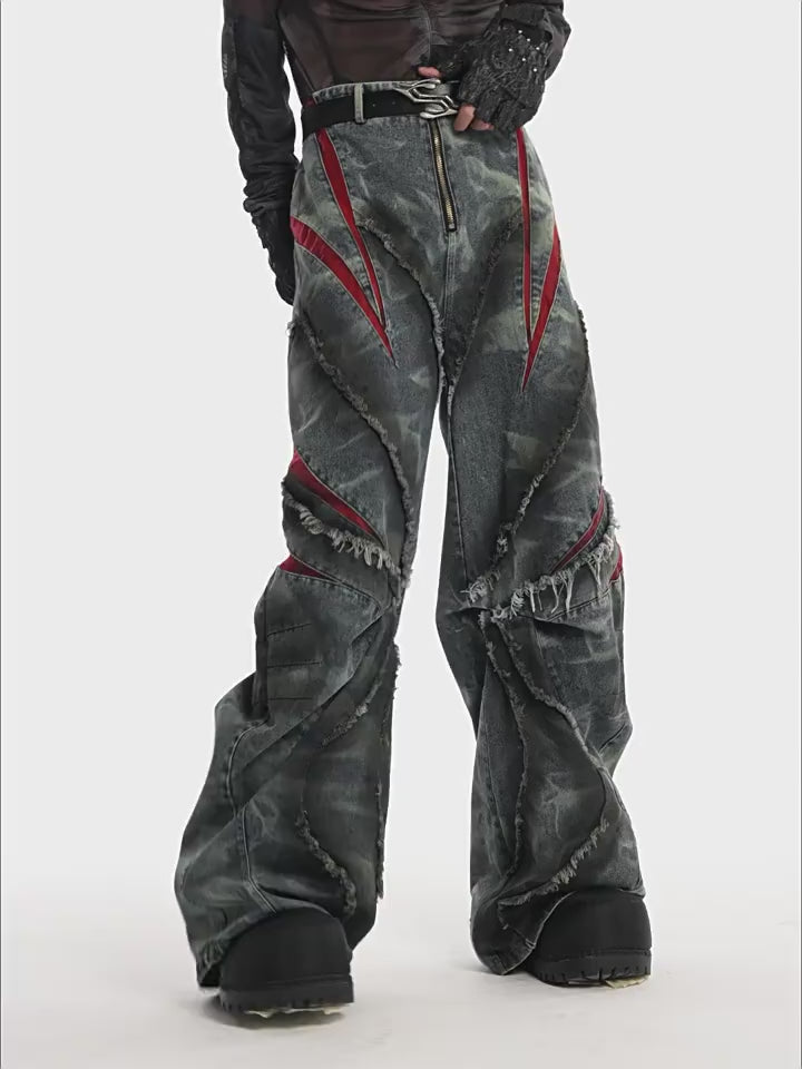 Distressed Wide-Leg Jeans with Leather Inlay Pattern