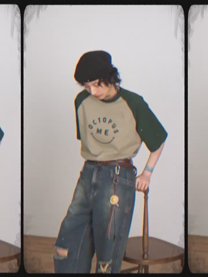 Ce t-shirt présente une conception de manches Raglan contrastée, qui ne met pas l'accent sur la largeur des épaules et fournit un effet visuellement riche. La typographie du visage Smiley Octopusme imprime sur la poitrine et les manches, coordonnée en couleur, présente le style et l'attitude de la marque.