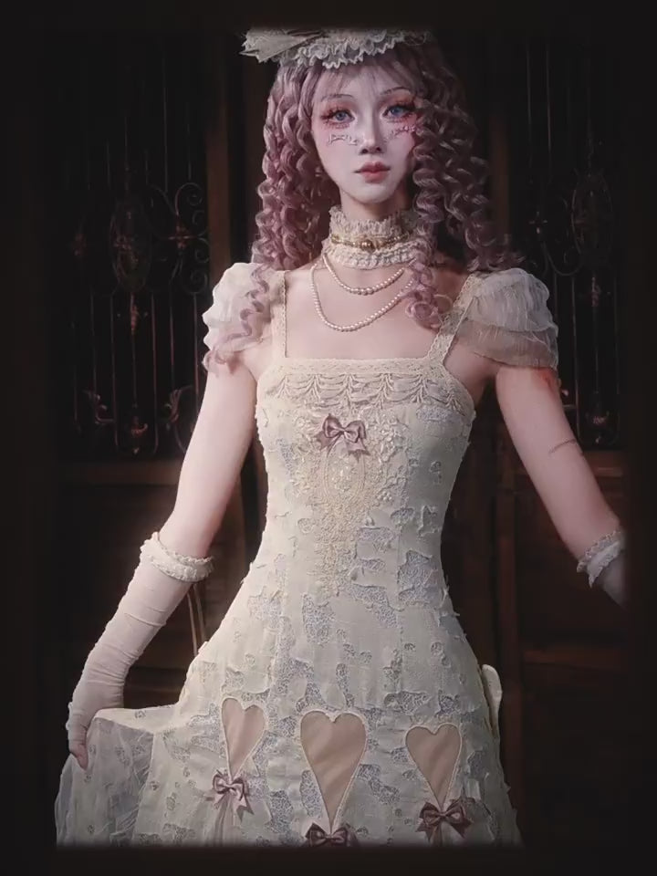 Vintage cream lace dress with heart-shaped cutouts, pink ribbon bow accents, delicate embroidery, and sheer ruffled mesh detailing. The dress has a fitted bodice, flared skirt, and soft off-shoulder mesh sleeves, embodying a romantic and whimsical aesthetic.