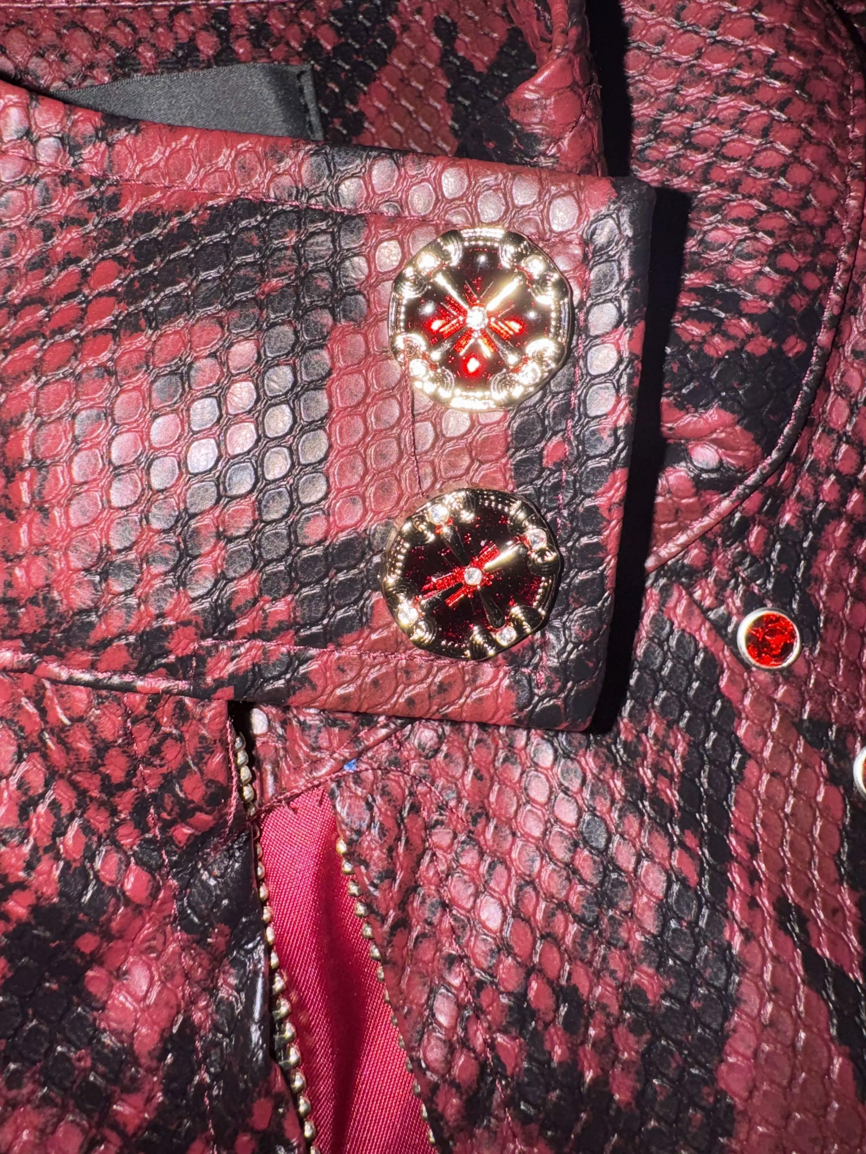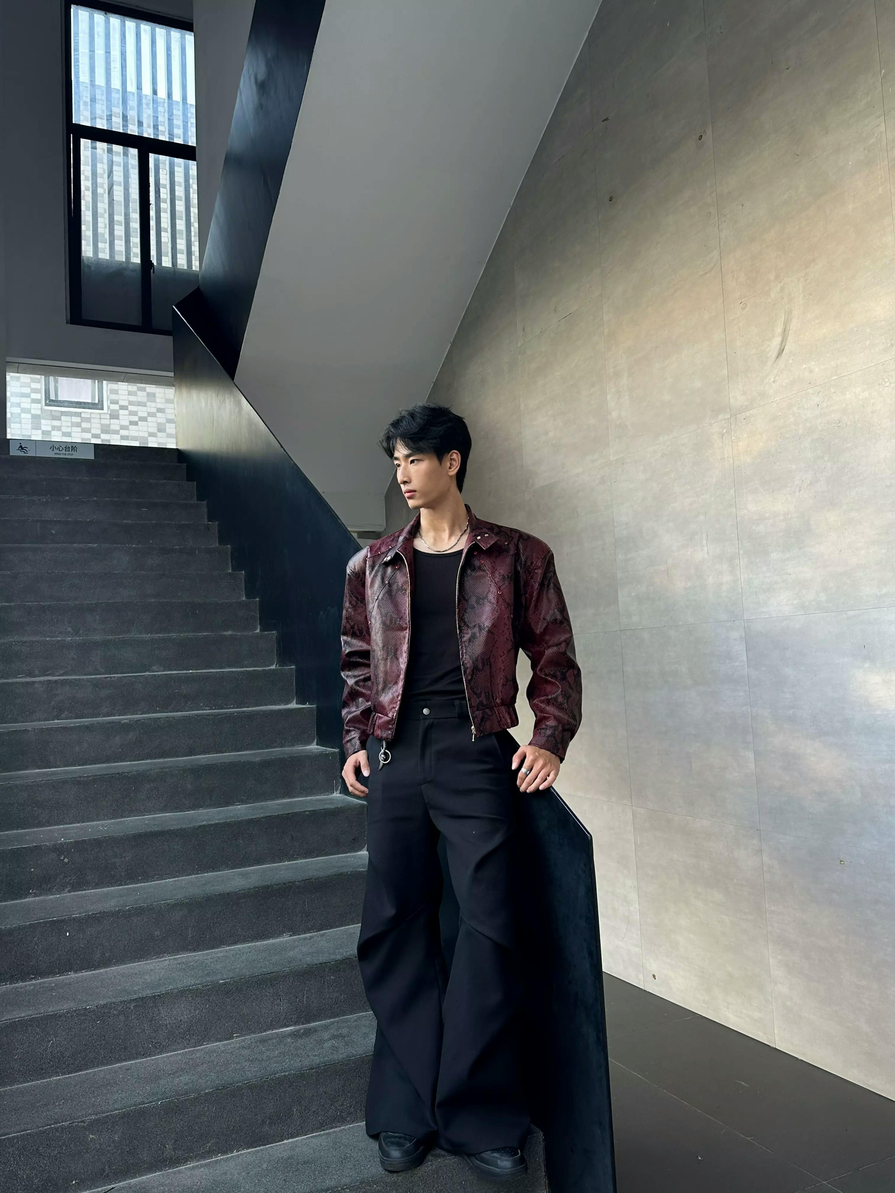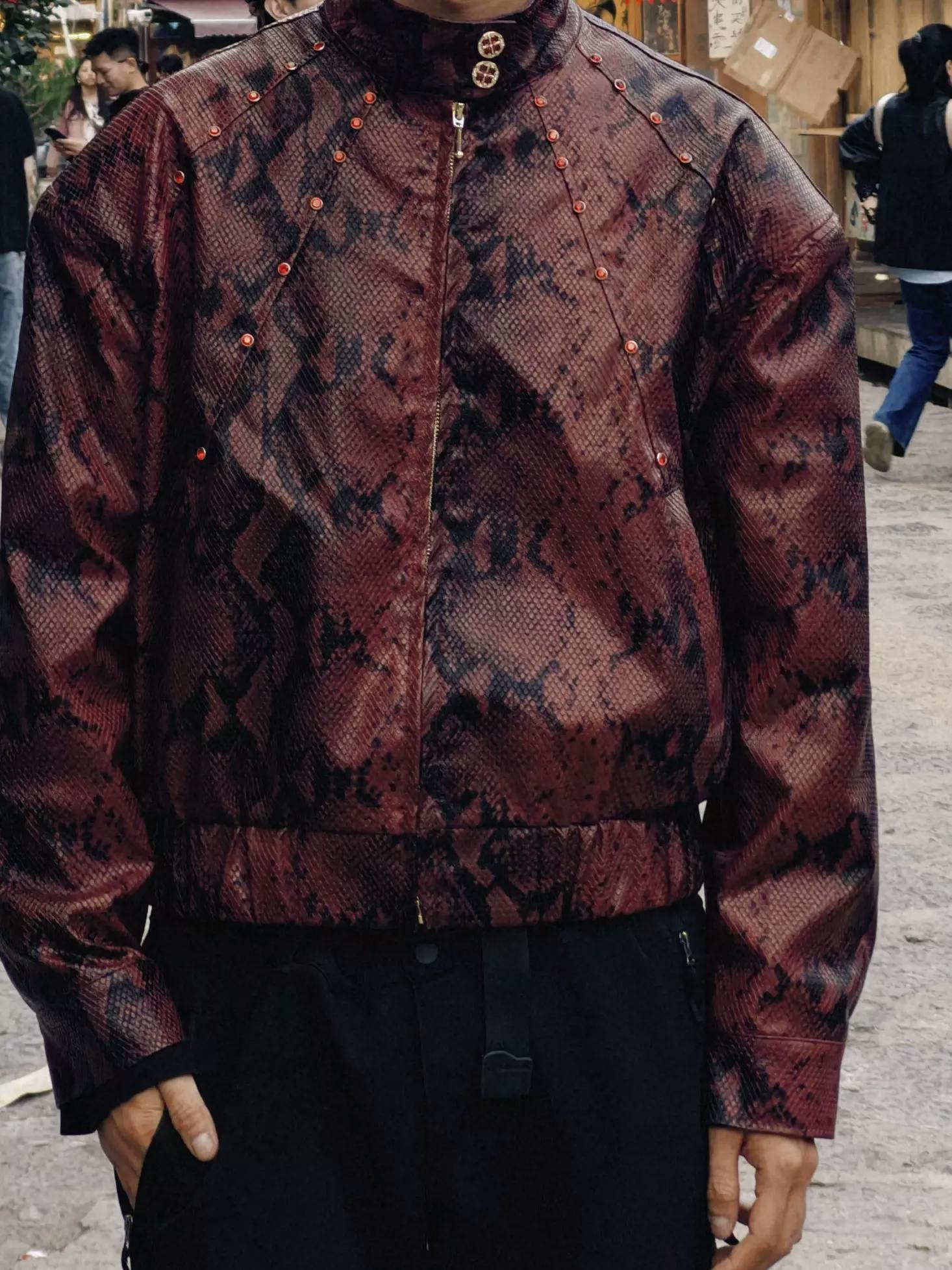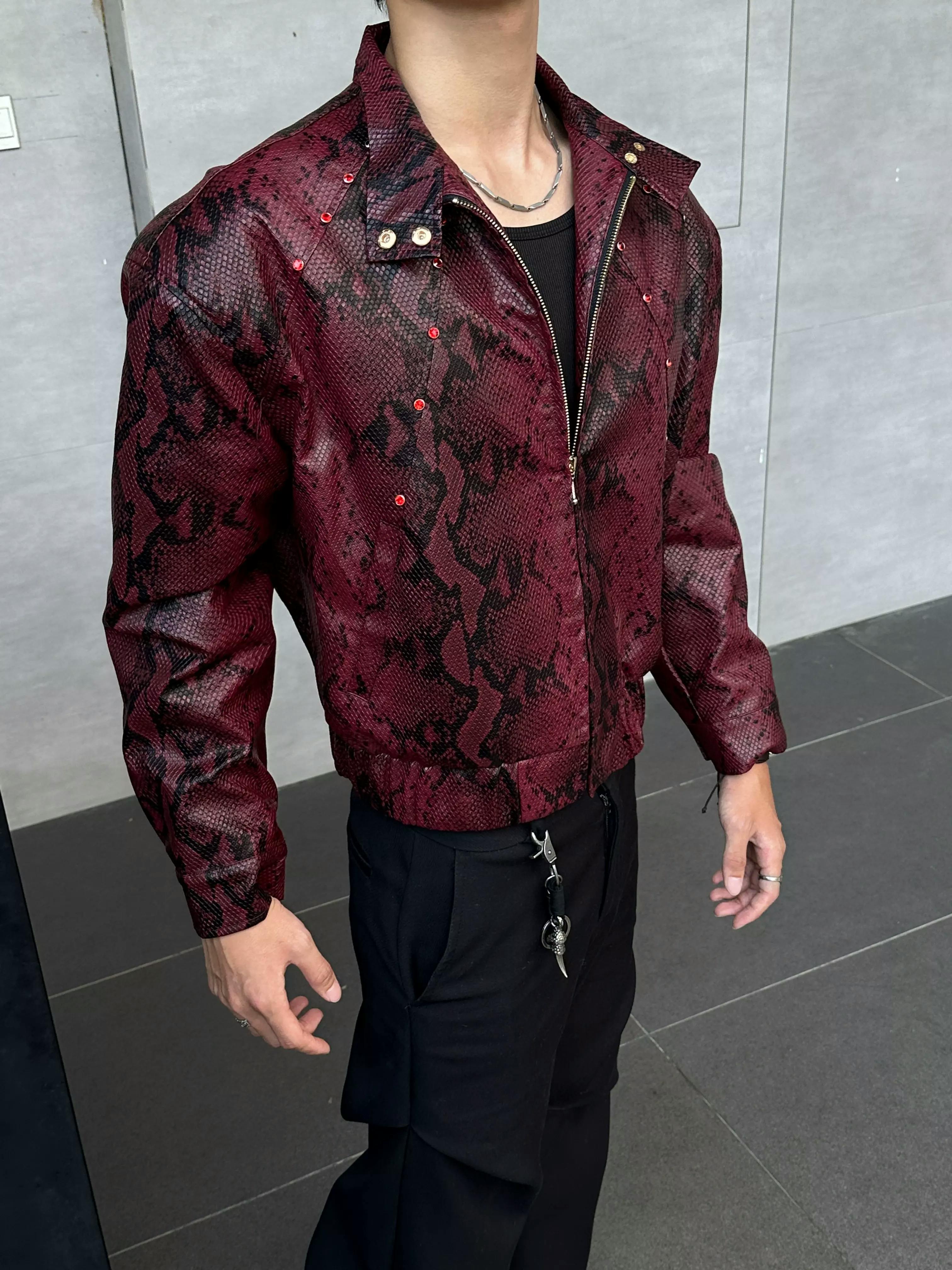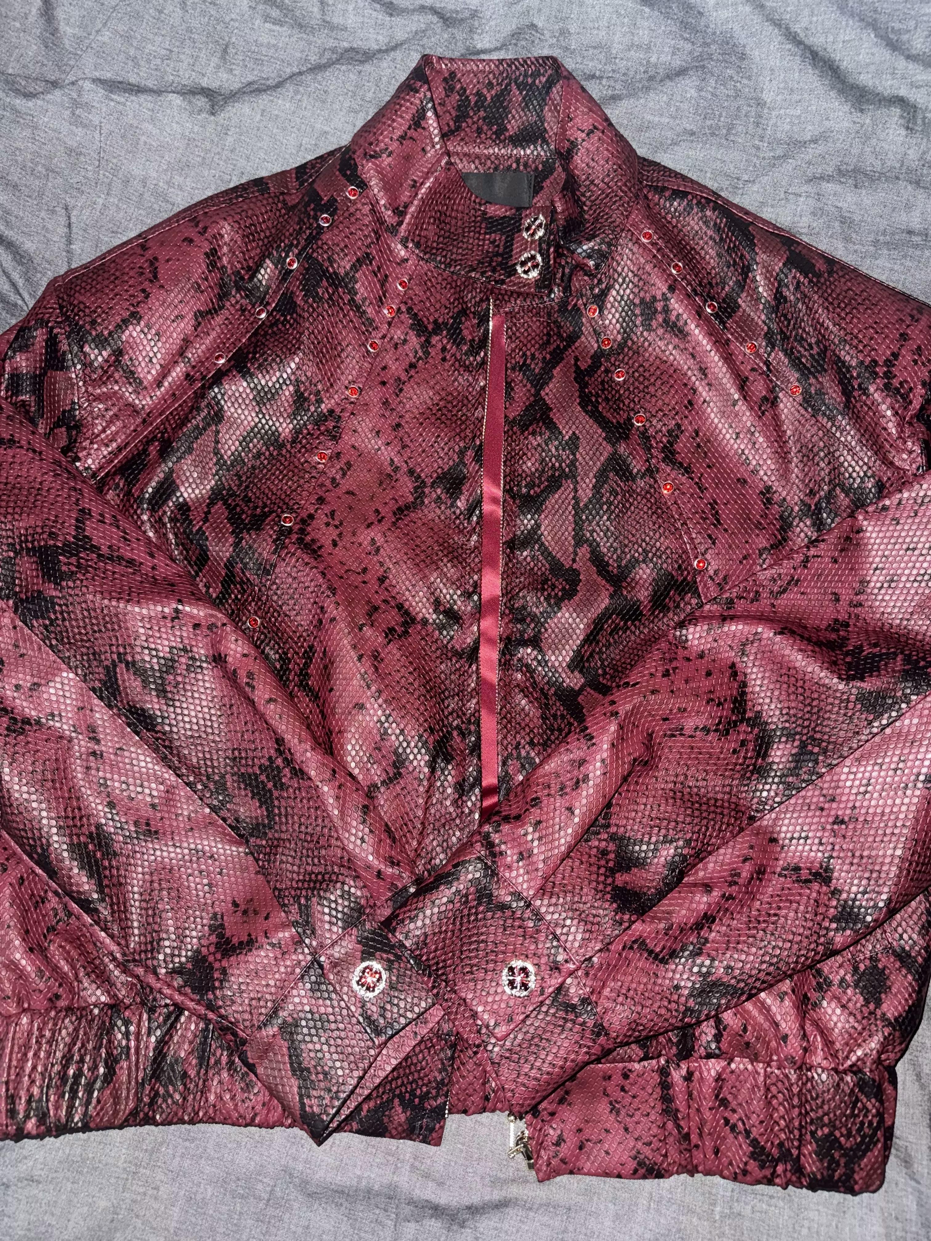 This standout bomber jacket is crafted in a bold burgundy snakeskin-print faux leather, blending avant-garde attitude with classic streetwear edge. The structured silhouette features a high collar, zip front, and subtle metal stud detailing for added dimension. Paired with wide-leg black pants and a sleek tie, this look channels runway drama and contemporary cool.