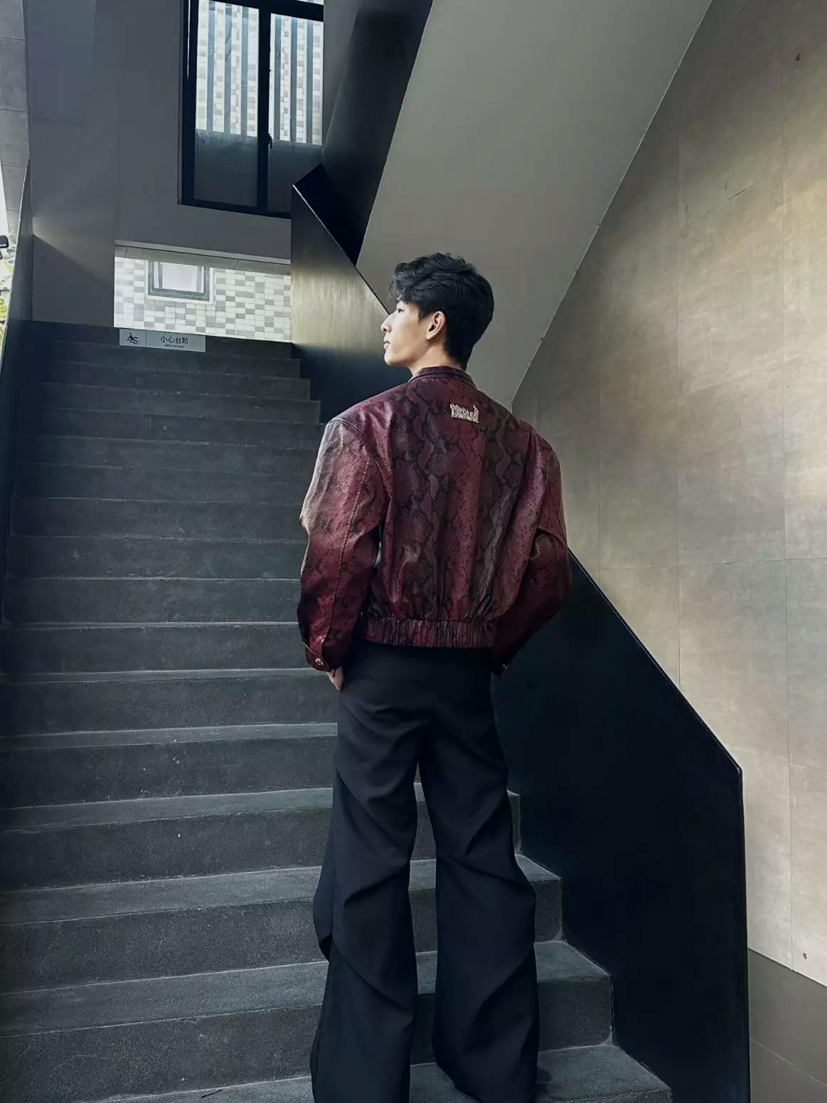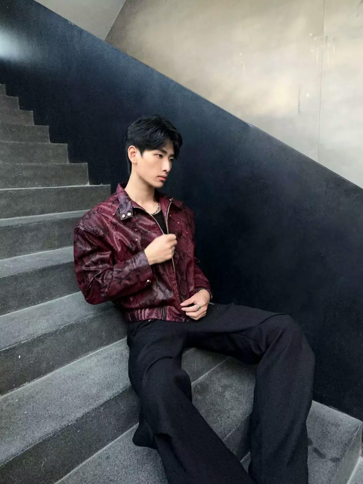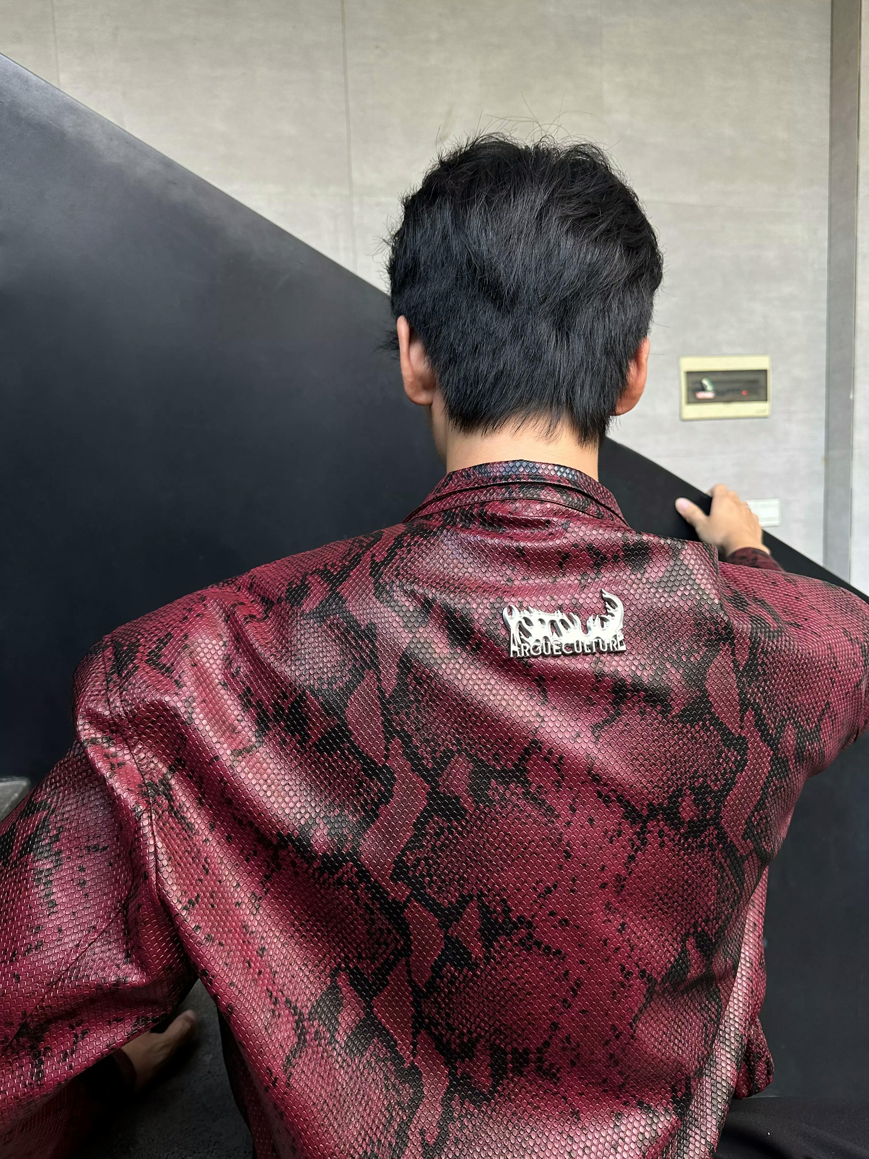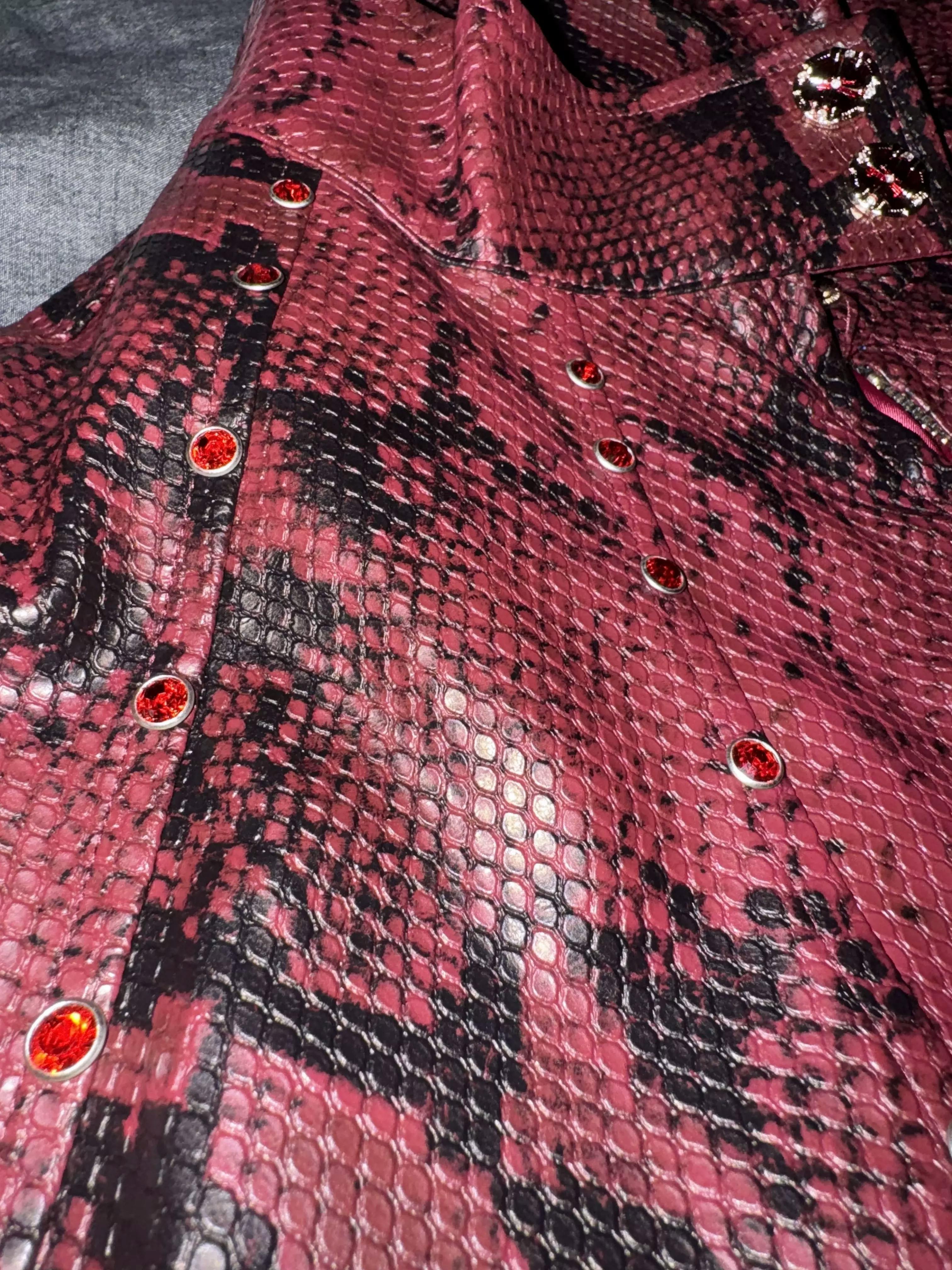 This standout bomber jacket is crafted in a bold burgundy snakeskin-print faux leather, blending avant-garde attitude with classic streetwear edge. The structured silhouette features a high collar, zip front, and subtle metal stud detailing for added dimension. Paired with wide-leg black pants and a sleek tie, this look channels runway drama and contemporary cool.