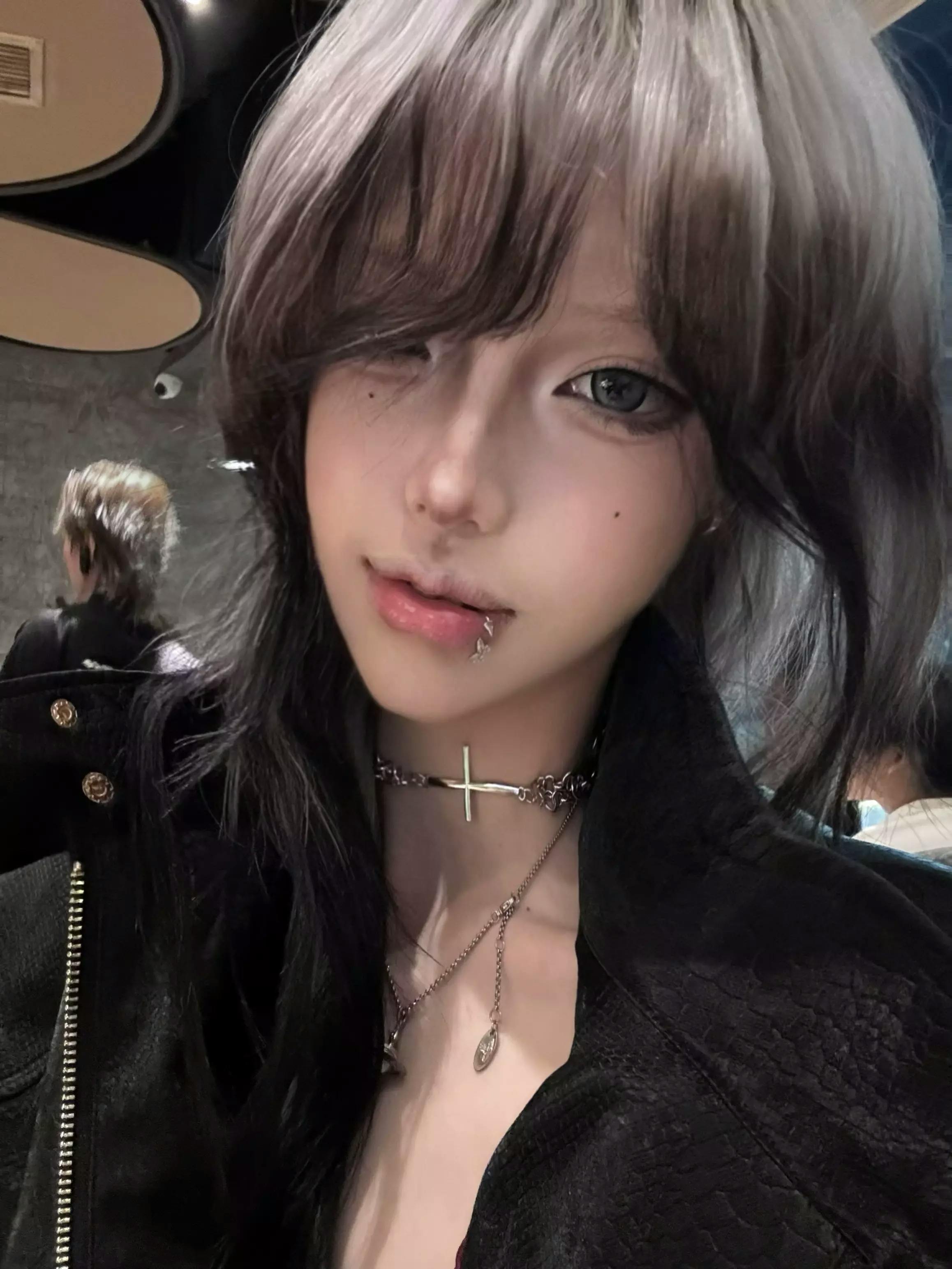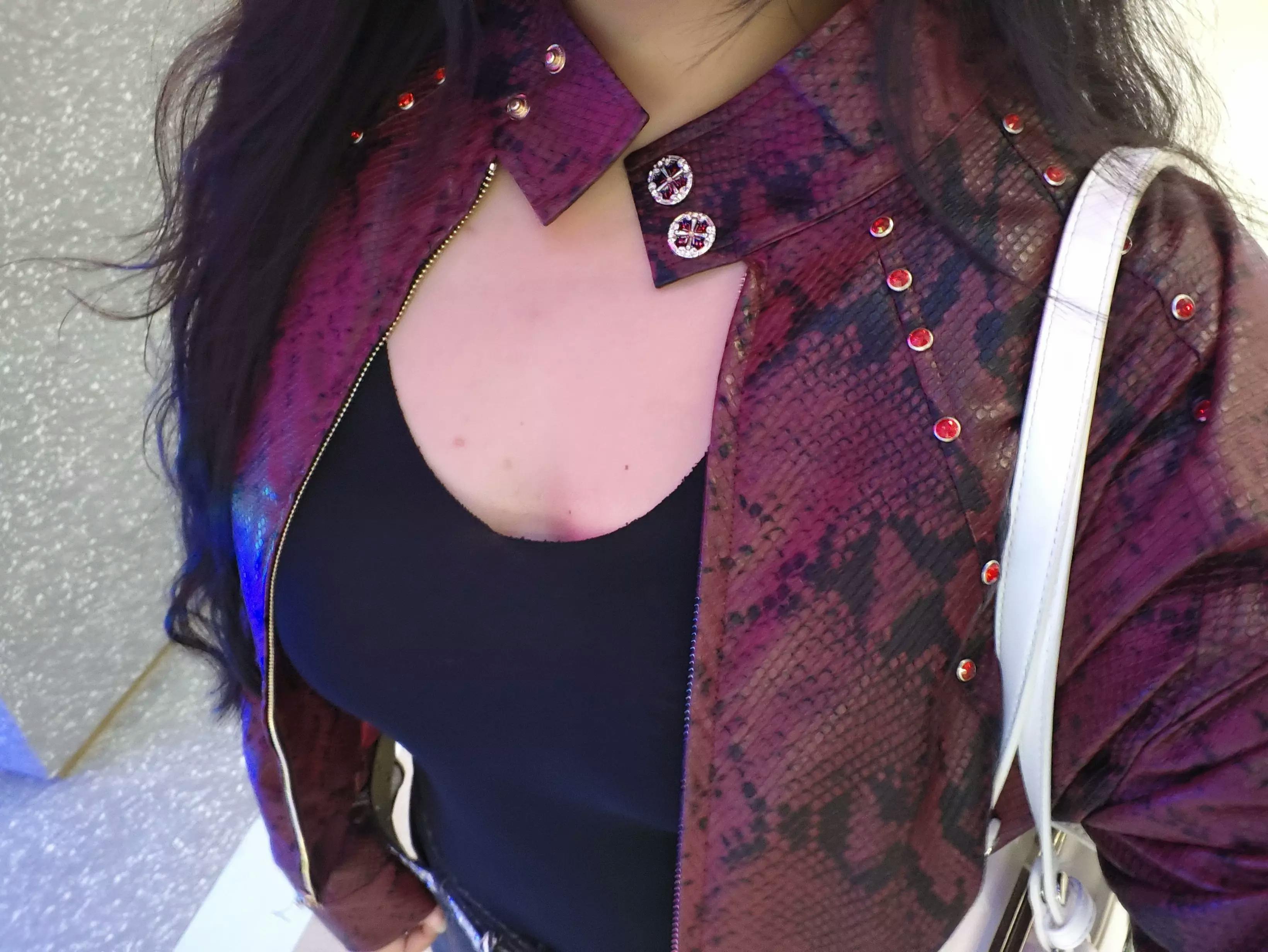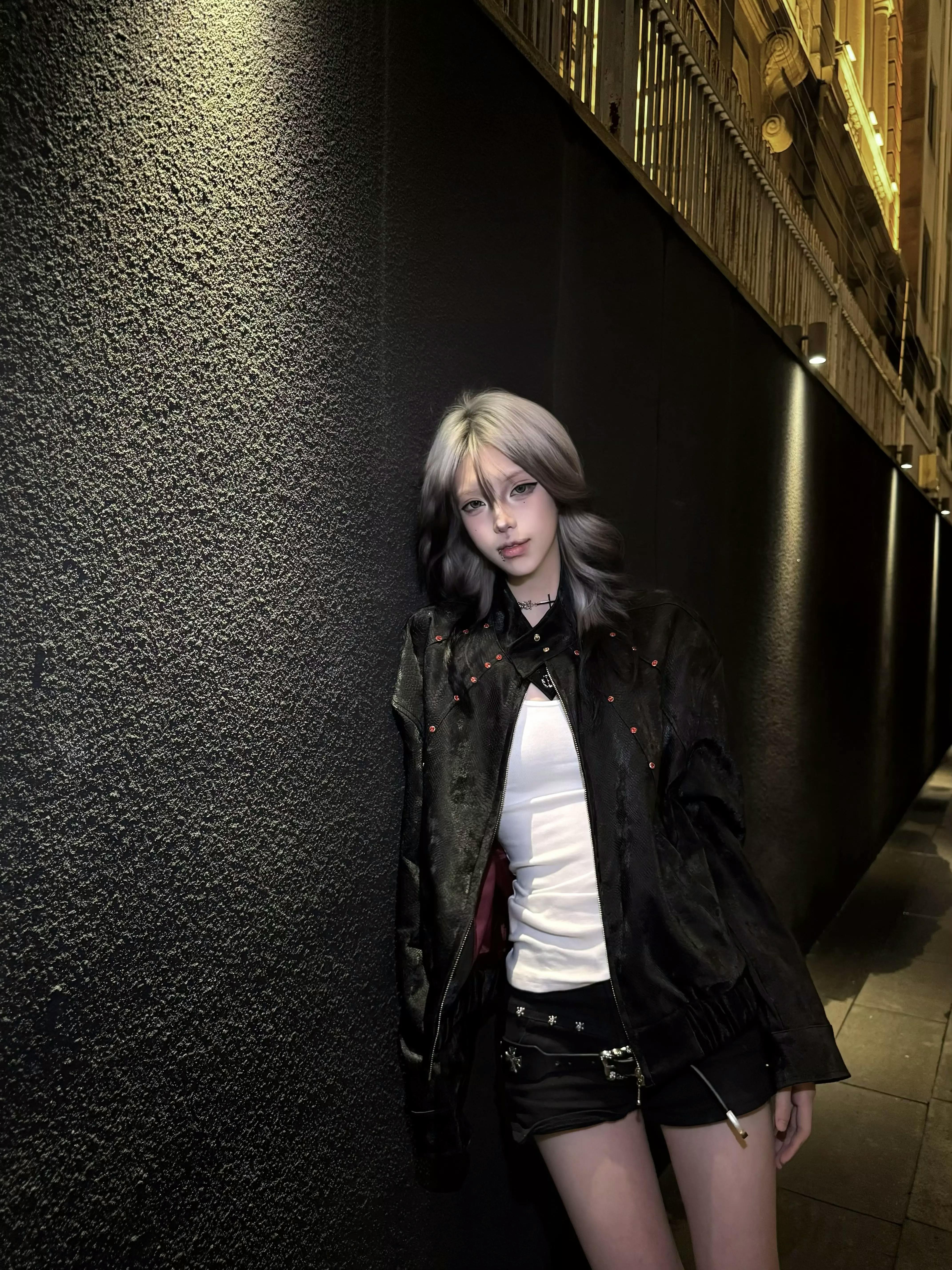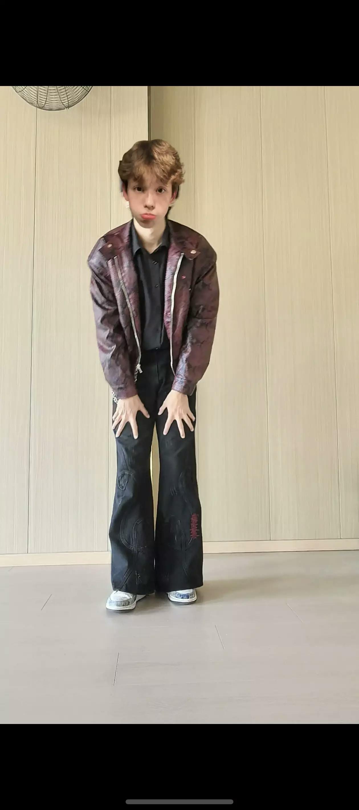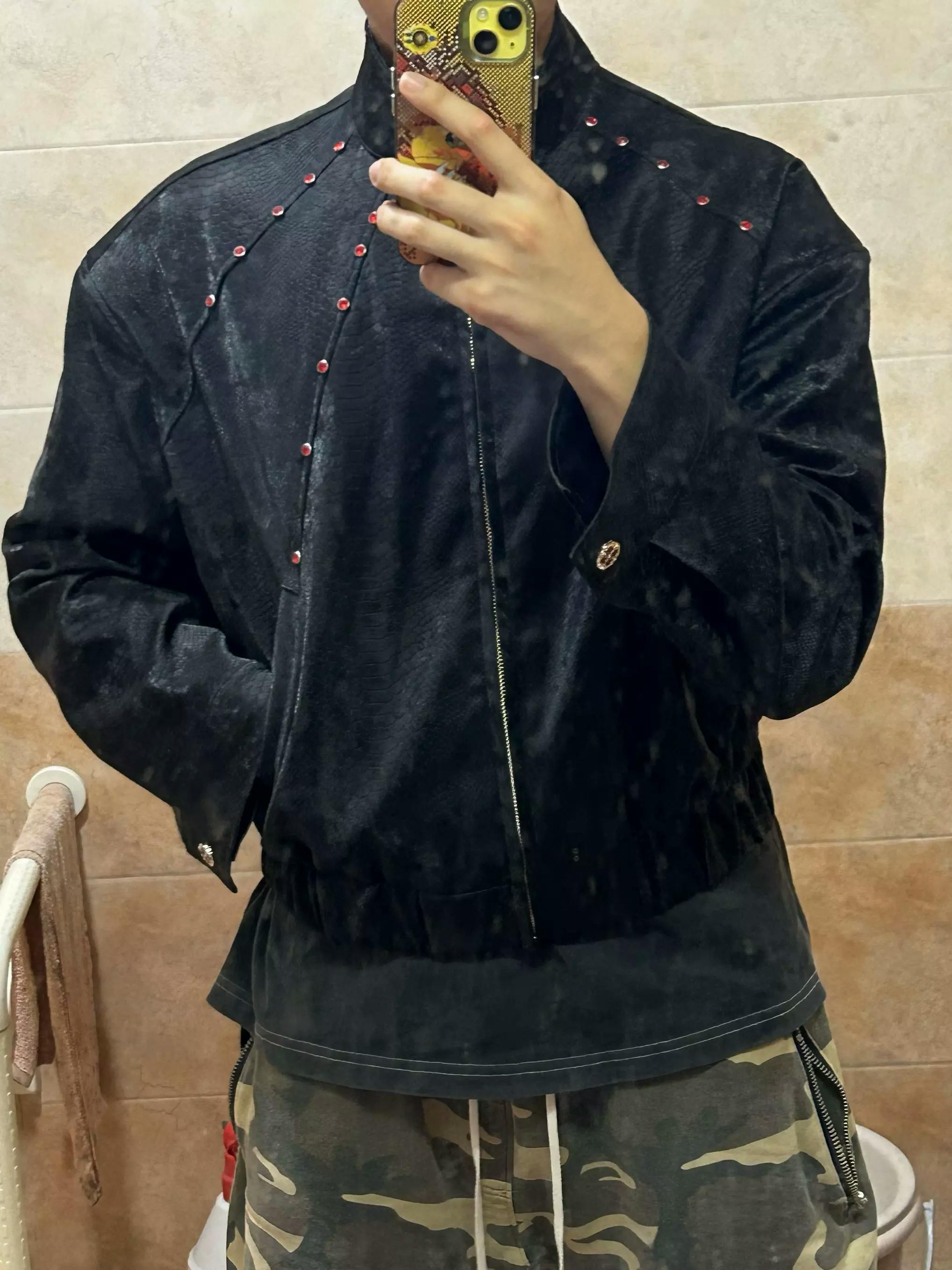 This standout bomber jacket is crafted in a bold burgundy snakeskin-print faux leather, blending avant-garde attitude with classic streetwear edge. The structured silhouette features a high collar, zip front, and subtle metal stud detailing for added dimension. Paired with wide-leg black pants and a sleek tie, this look channels runway drama and contemporary cool.