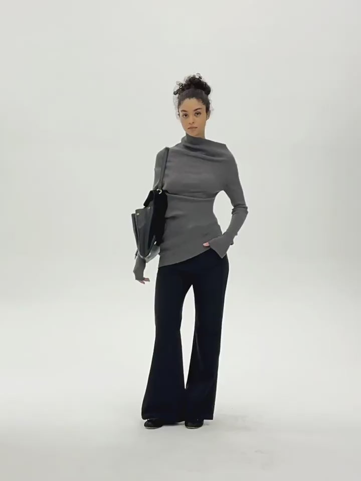Designed for autumn and winter, indicating it is likely to be warmer. Soft and stretchy texture, emphasizing comfort and flexibility in fit. Multi-wear, suggesting the sweater can be styled in various ways or possibly worn reversibly. Curved scimitar cut, which could refer to a distinctive, curved shaping in the design, possibly in the hem or neckline. Knit top sweater, confirming the type of garment and its knit fabric construction.