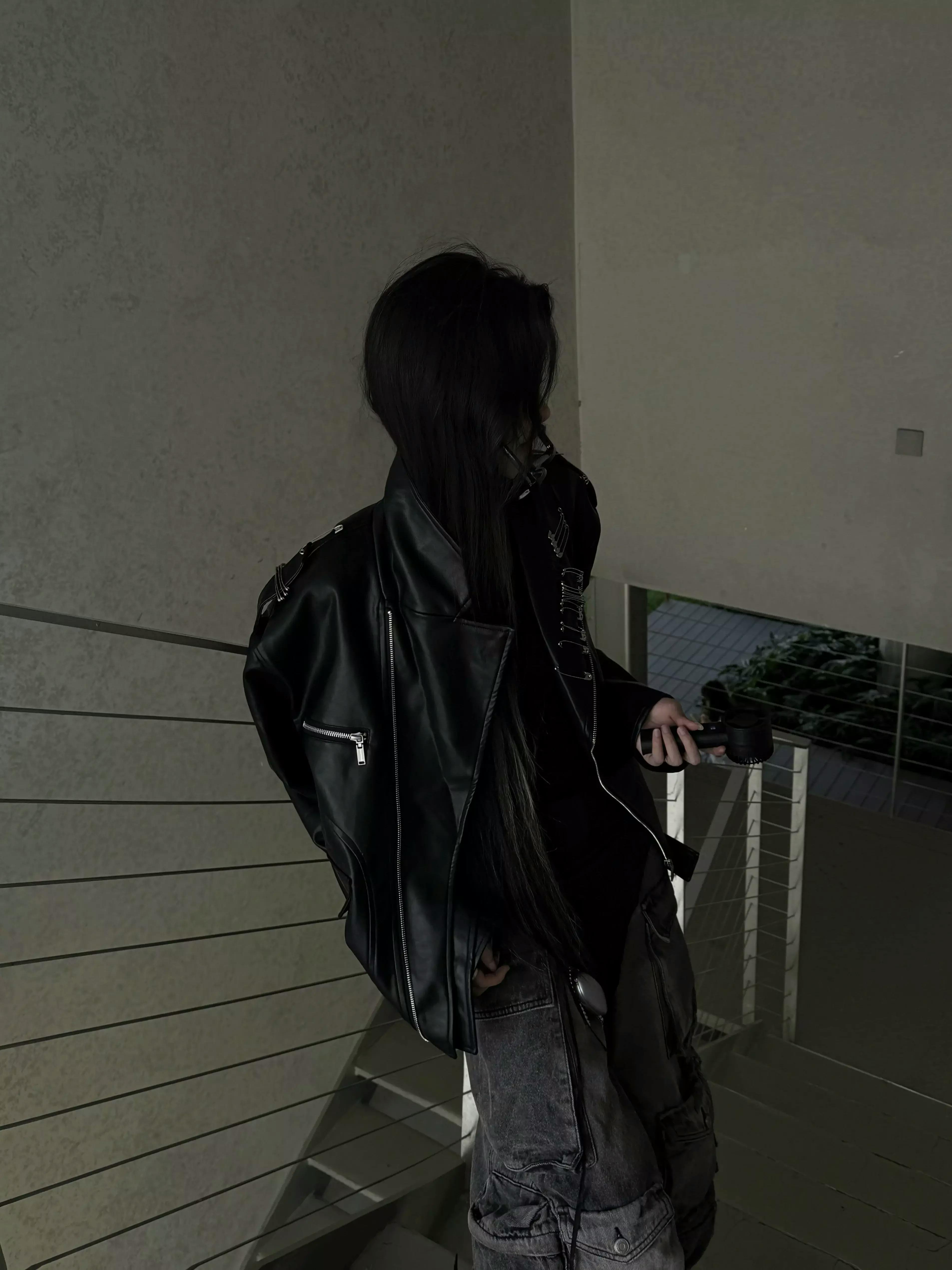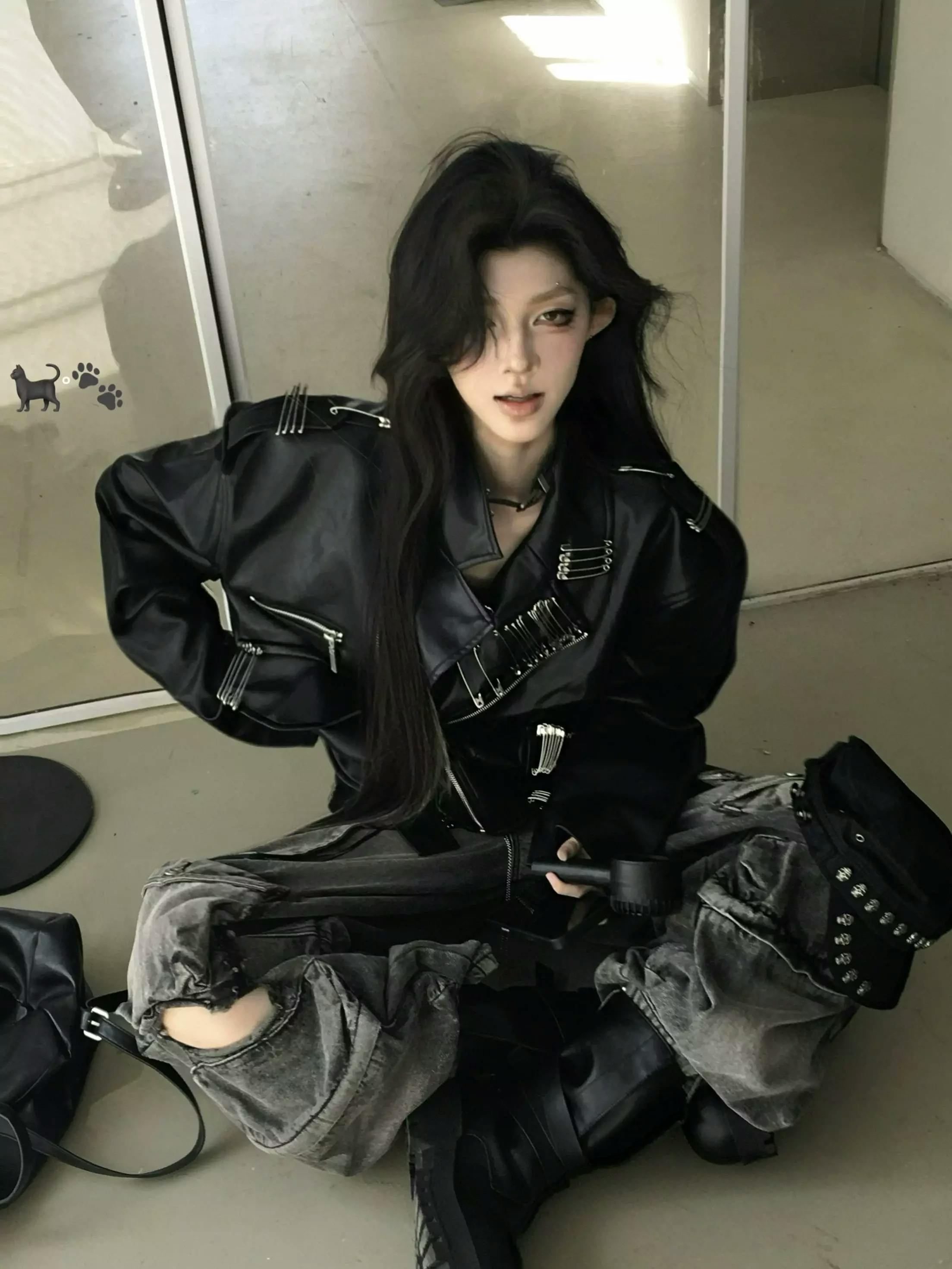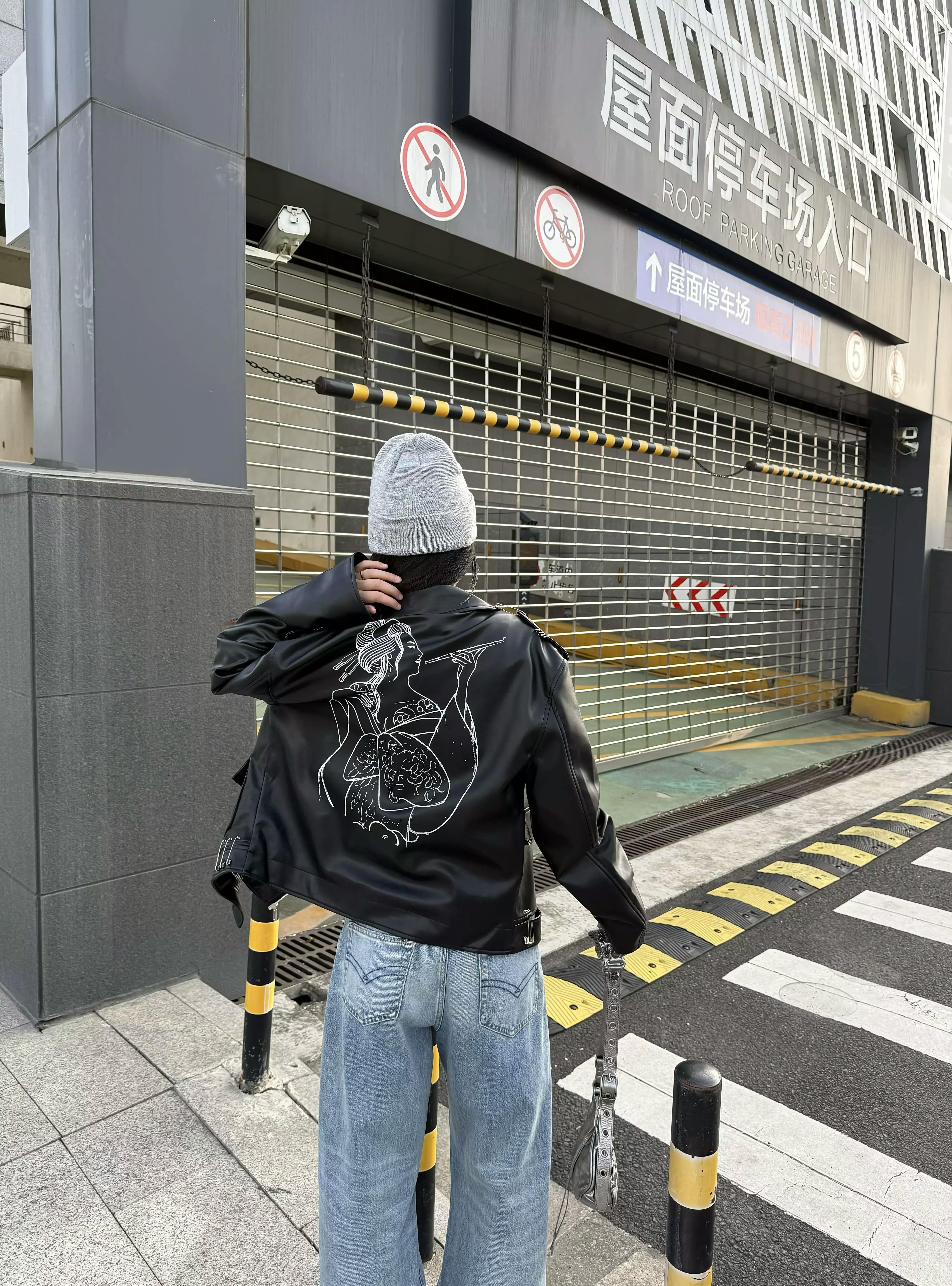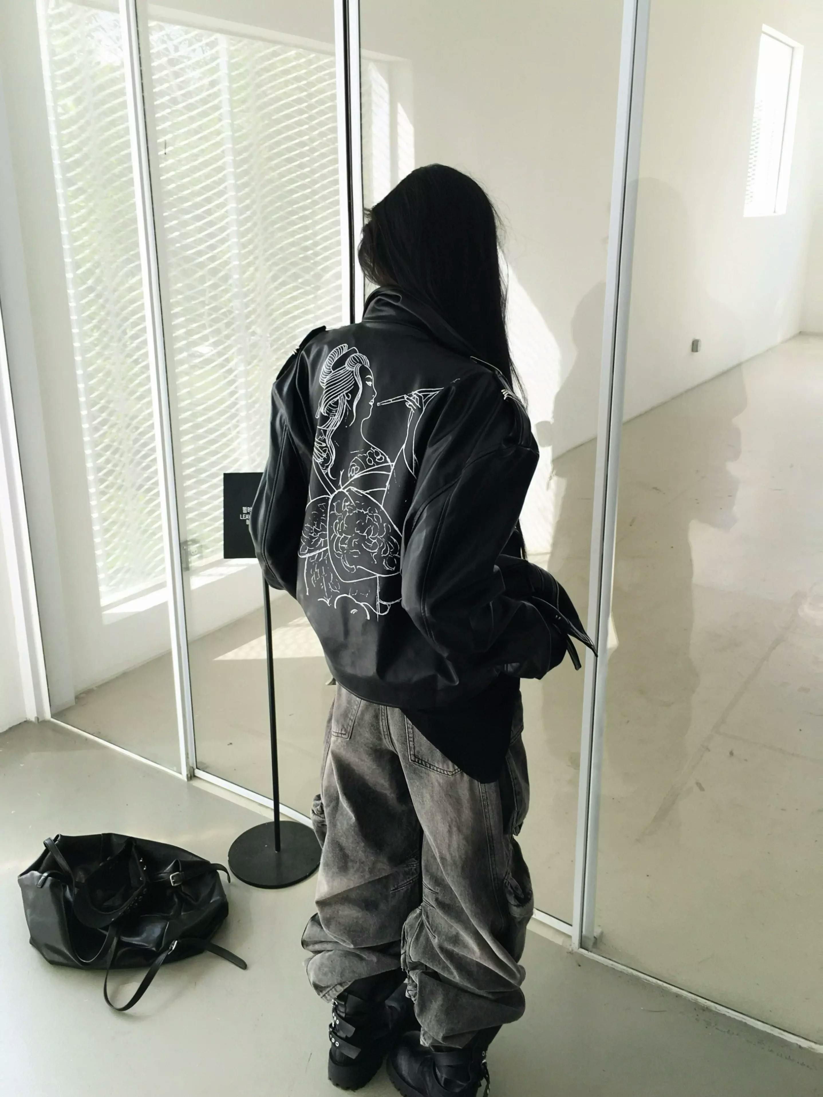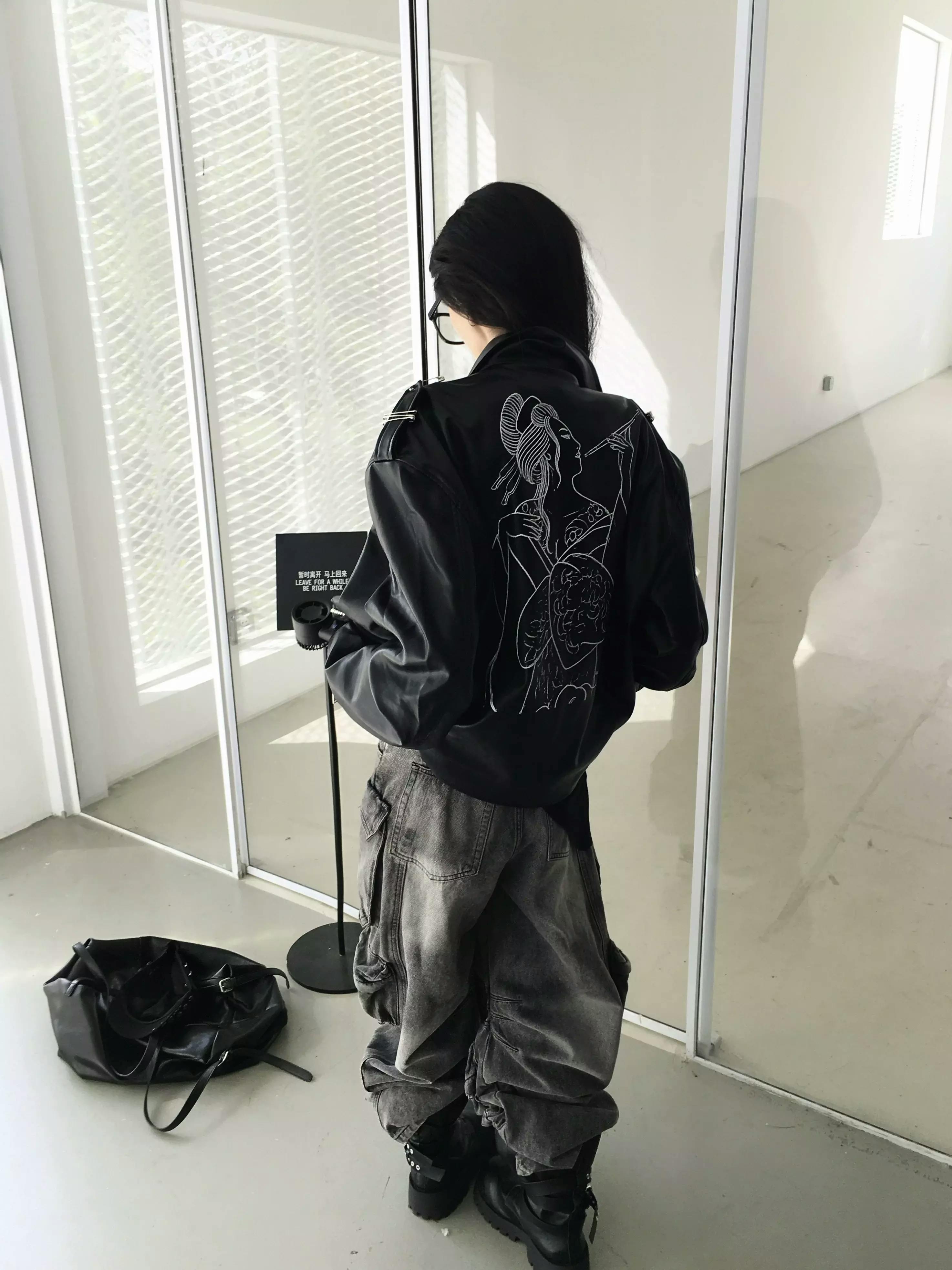 This statement biker jacket is crafted from PU fabric, replicating the refined texture and luster of genuine leather. The piece features striking asymmetric zippers and belted accents for a rebellious edge, while the back is finished with an intricate embroidered geisha motif for artistic flair. Special processing ensures the jacket is both wear-resistant and easy to maintain, providing good breathability and comfort for everyday wear.