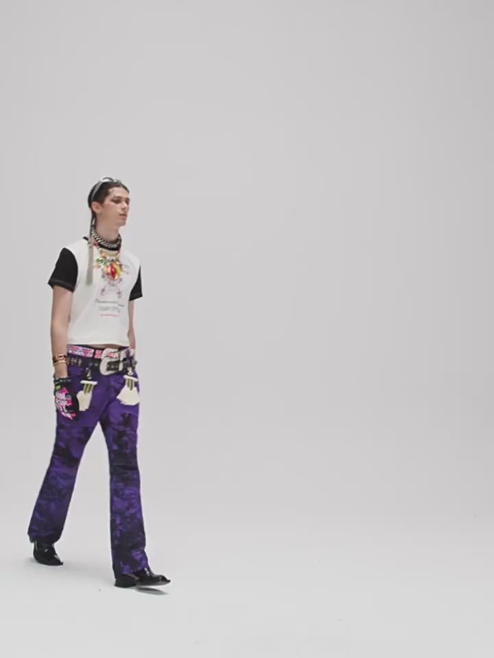 보라색 타이 다이로 염색한 검은색 헤링본 원단으로 제작된 이 바지는 반항적이고 퇴폐적인 분위기를 풍기는 퇴색되고 쇠퇴한 프린지 디테일을 자랑합니다. 혁신적인 더블 허리 디자인으로 액세서리 벨트와 장식 아이템을 추가할 수 있으며, 무릎 자수는 디자인의 초점을 강조합니다.