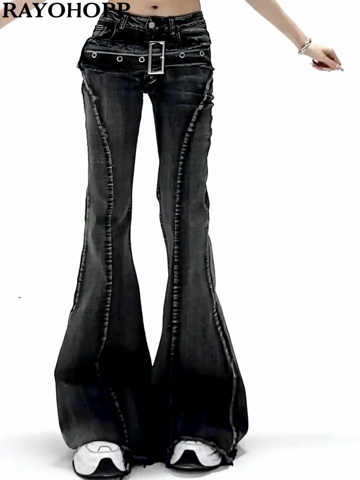 Rayohopp 레트로 플레어 데님 진 - 디스트레스드 그레이 워시, 분리형 벨트 및 원시 밑단