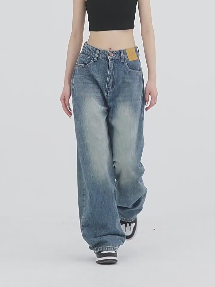 Blue Retro Loose Straight-Leg High-Waist Floor-Length Jeans