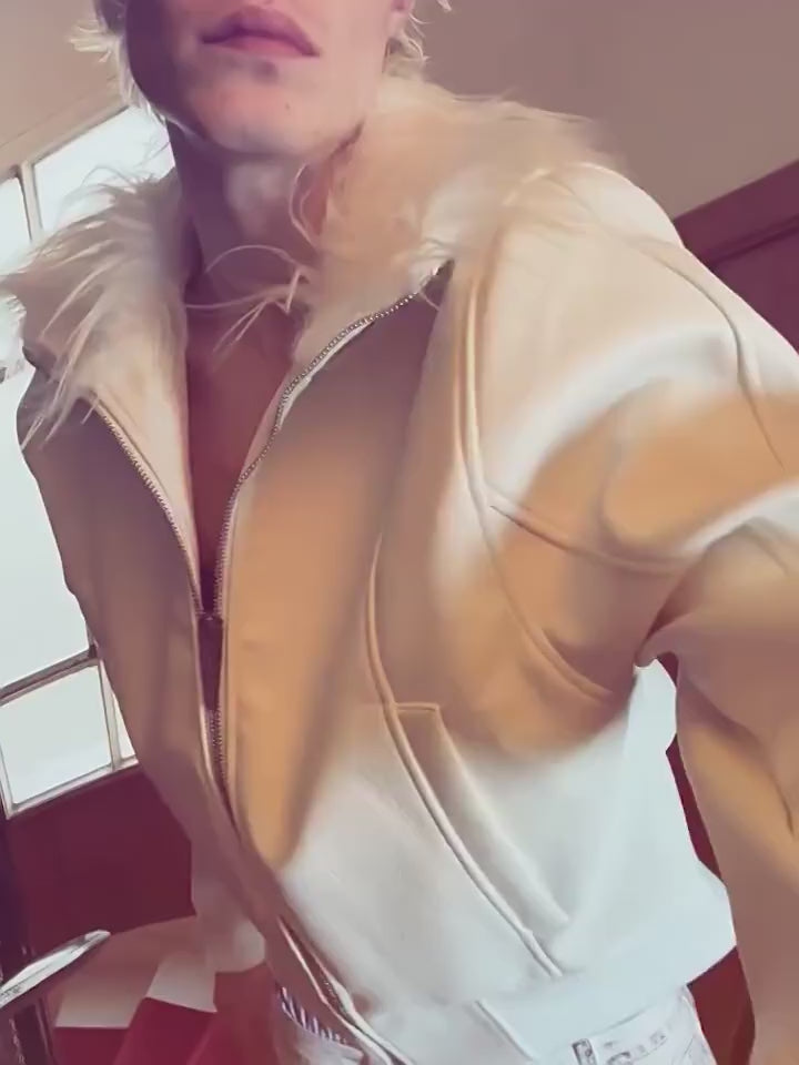 This striking jacket combines the edge of a classic bomber with luxurious details. Crafted from crisp white leather, it features a high, standing collar trimmed with plush white fur and secured with double buckle straps. The elasticated cuffs and hem create a structured, cropped silhouette.