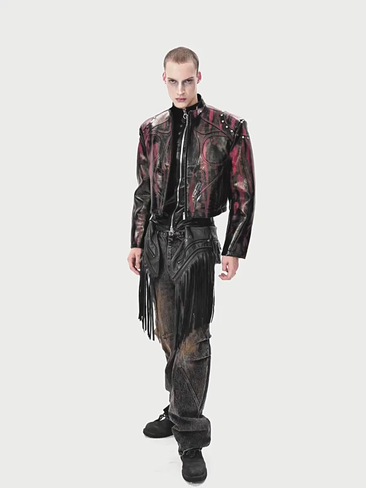 Cropped faux leather jacket with a stand collar, zipper front, and bold panel detailing for a layered look. Features a hand-painted, distressed finish.