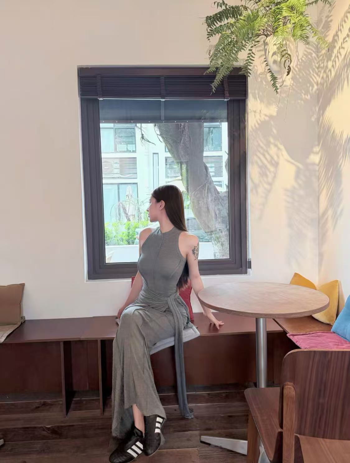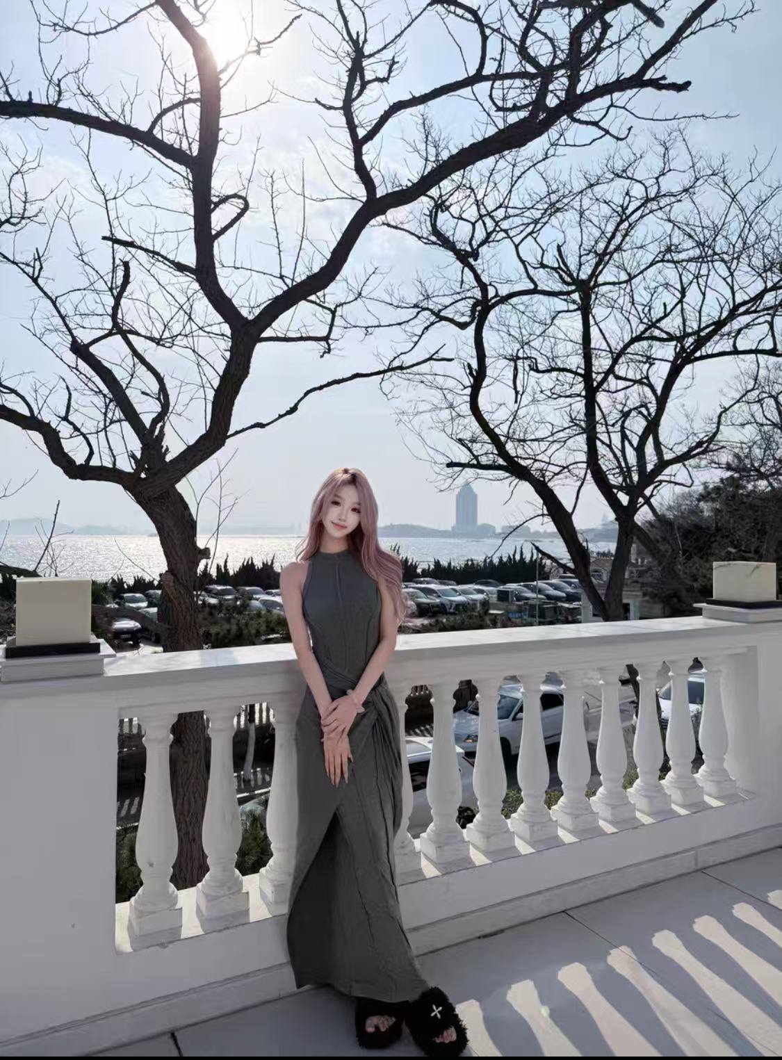 Make a sophisticated statement in this stunning heather gray maxi dress. Featuring a chic mock neck and a flattering sleeveless design, this dress accentuates your silhouette. The defining feature is the elegant tie-waist detail that creates a beautiful drape and adds a touch of modern flair. A subtle front slit allows for ease of movement and adds allure. Crafted from a comfortable, soft-touch fabric, this full-length dress is perfect for evening events, upscale dinners, or any occasion where you want to look effortlessly elegant.