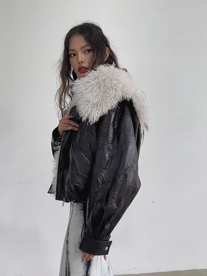 Faux Leather Jacket With Detachable Oversized Fur Collar