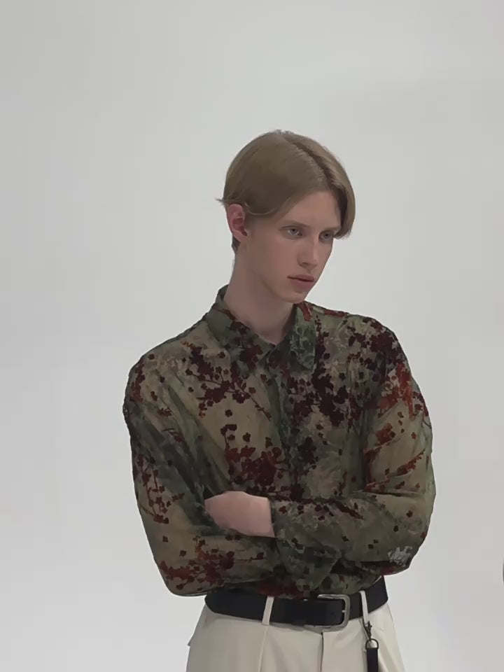 The Floral Print Semi-Sheer Button-Up Shirt adds a touch of elegance to your wardrobe with its delicate floral pattern on semi-sheer fabric. Made from high-quality, breathable material, this shirt ensures both comfort and style. Ideal for layering or wearing on its own, it features a button-up front and classic collar for a polished look.