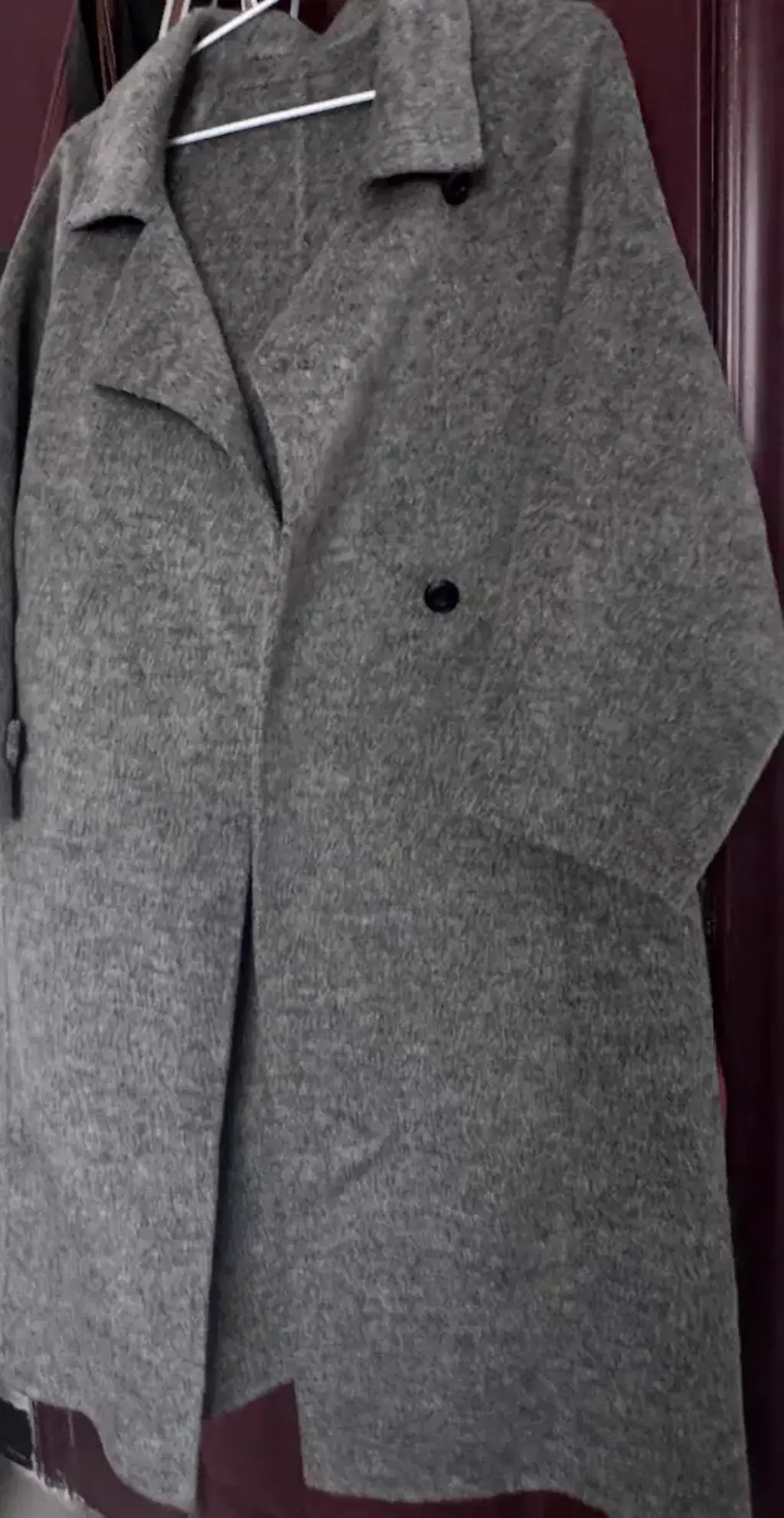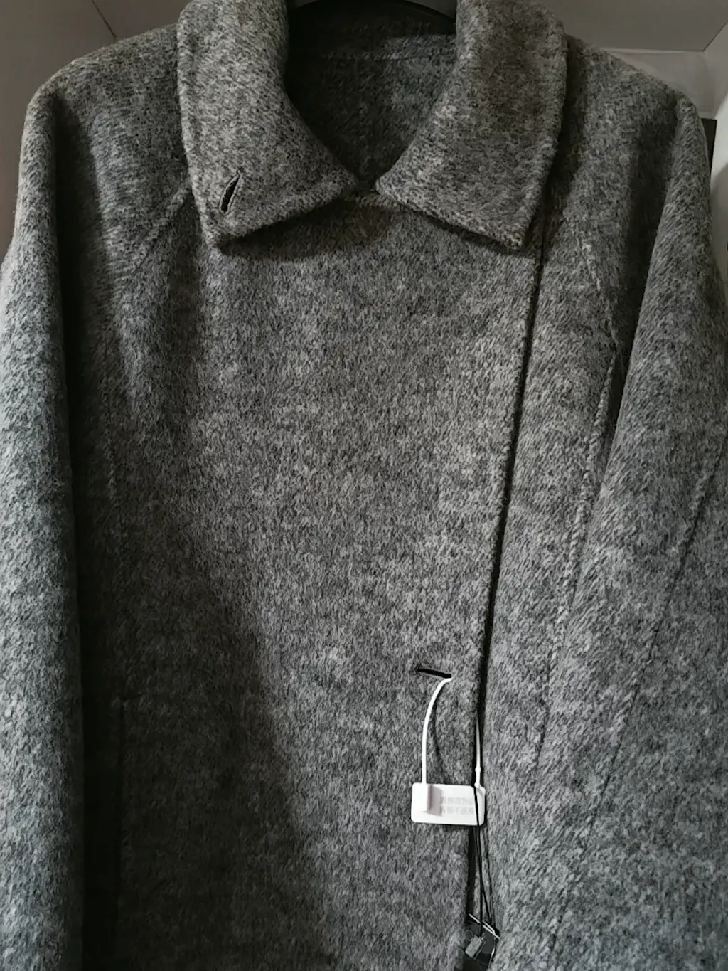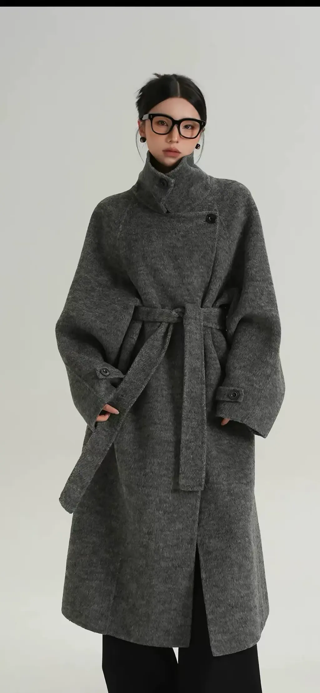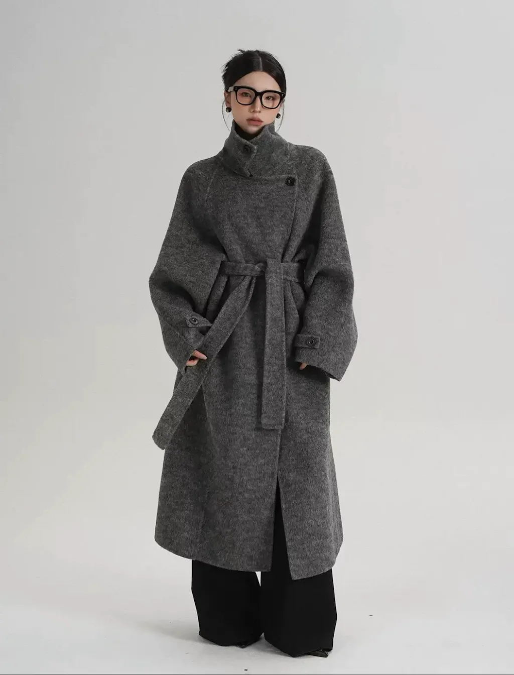 Long, sculptural winter coat in a soft marl charcoal grey, cut in a very relaxed, cocooned A‑line silhouette that falls to mid‑calf. The shoulders are dropped into wide raglan sleeves that drape generously and taper slightly at the cuffs, where buttoned tabs add subtle structure. A tall stand collar wraps high around the neck and closes asymmetrically with a single button, forming a dramatic funnel shape that can be worn fully fastened for warmth or left slightly open for a softer look. The front wraps over and is secured with a matching self‑tie belt that cinches the waist and creates volume through the body, while discreet side pockets keep the lines clean. The heavy wool‑blend fabric hangs with weight and movement over wide‑leg trousers, giving an understated, architectural feel.