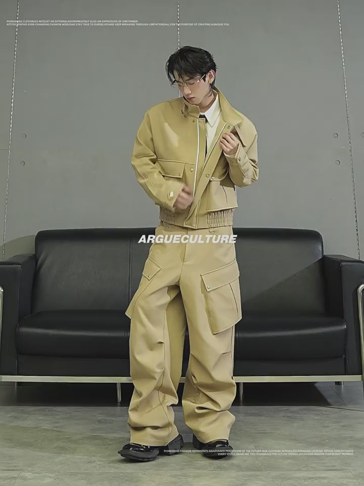 This jacket and pants set reinterprets classic tailoring with a futuristic edge. Crafted from 100% high-quality cotton, the fabric is soft, breathable, and naturally warm, with a subtle stiffness that holds the modern, structured silhouette. The standout feature is an allover “starry” embellishment—tiny sparkling details scattered across the grey surface, giving a shimmering, cosmic effect. The jacket features a sharp spread collar, clean zip front, and welted pockets, while the matching pleated trousers are wide-legged for a dramatic, fashion-forward fit. Available in both grey and khaki, this set is perfect for those who appreciate both comfort and standout style.