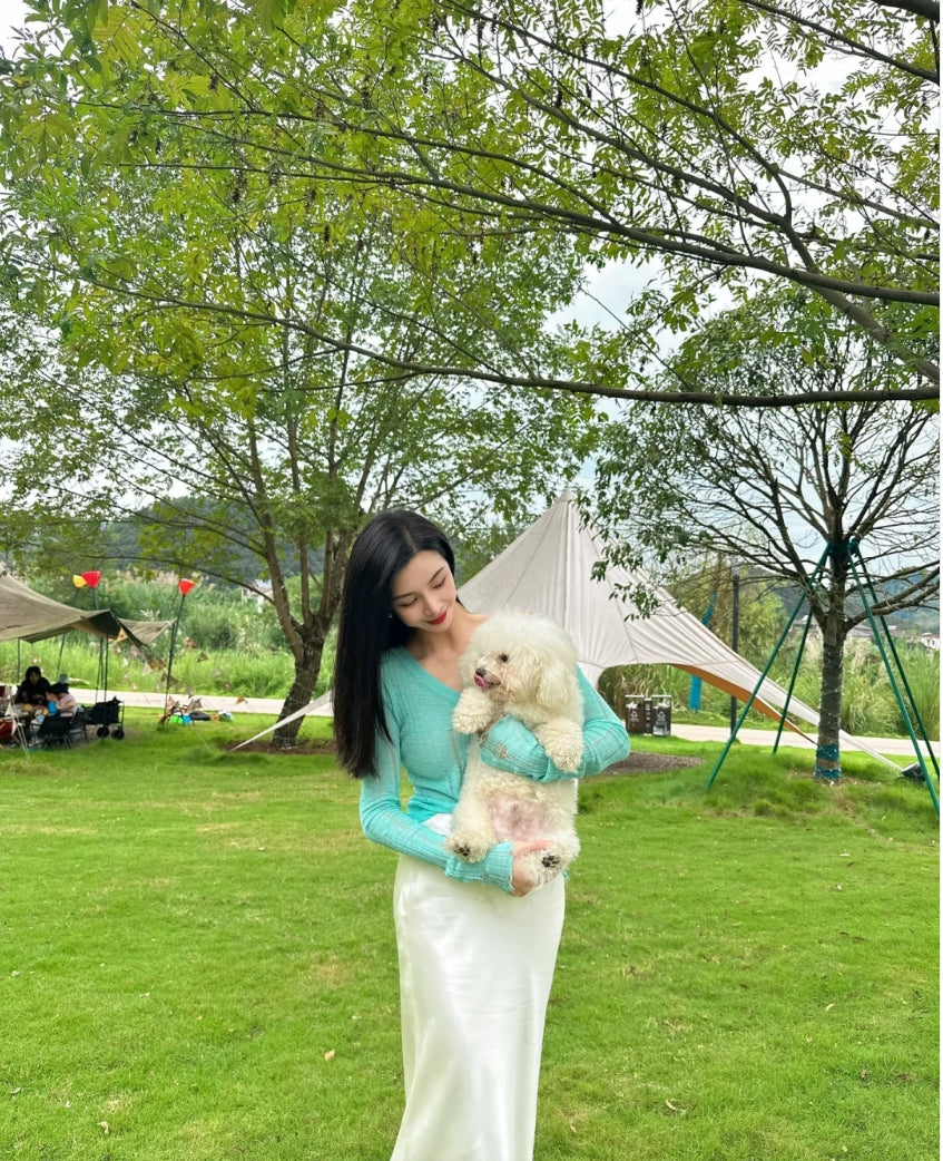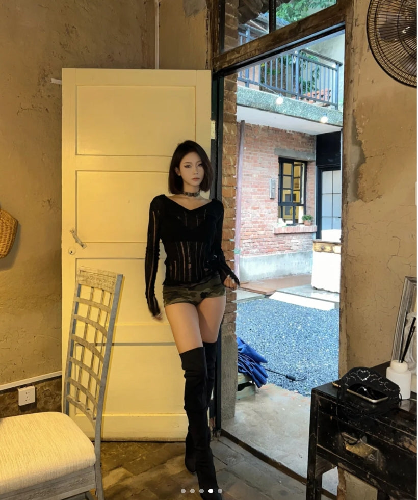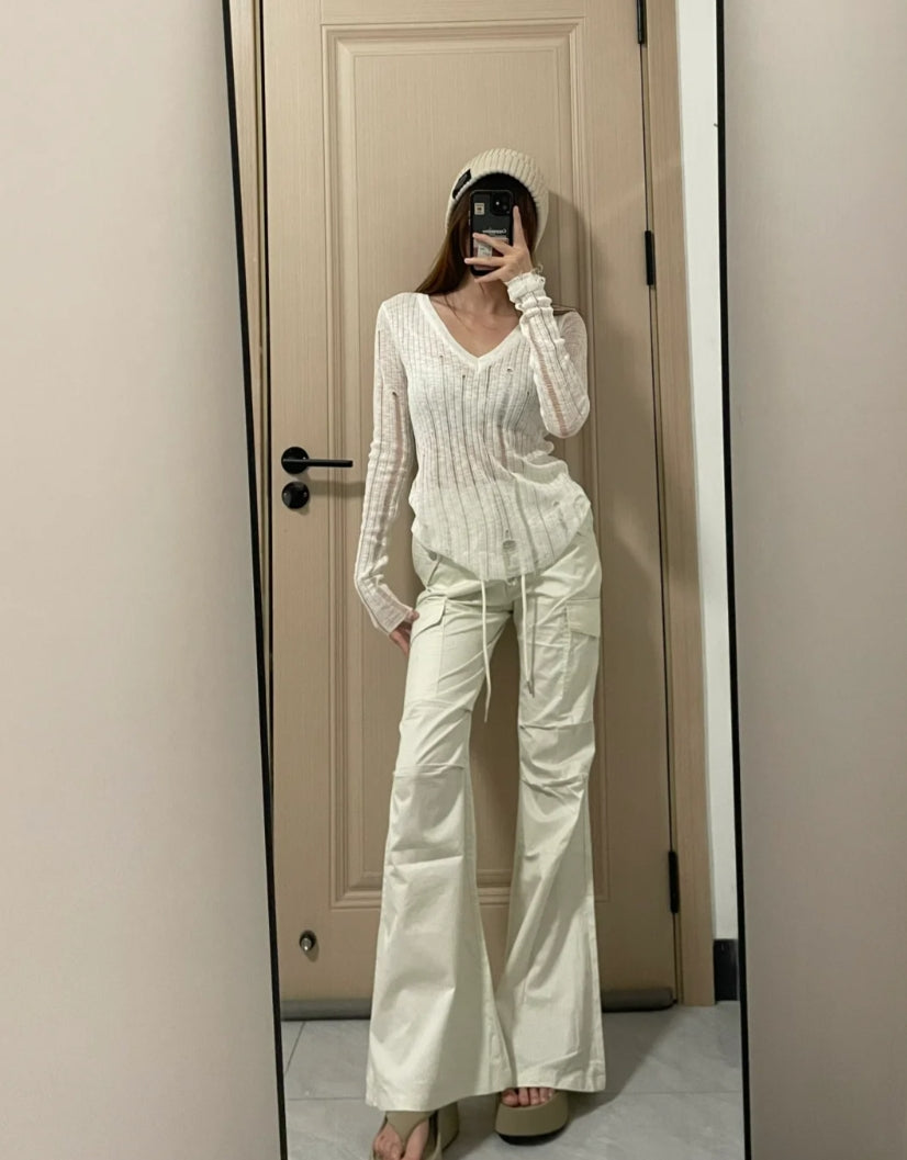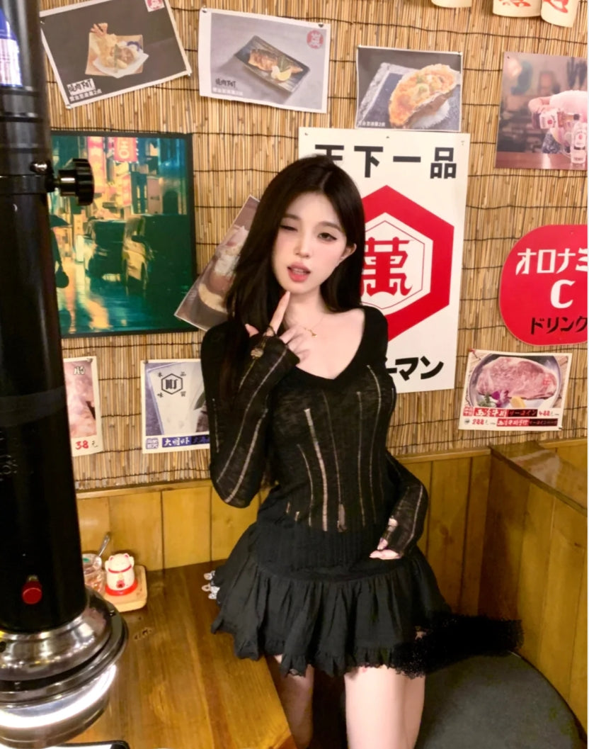 Introducing the dual charm of sophistication and edge with our "Hollow-Out V-Neck Thin Cardigan & Distressed Waist Knit Top." This ensemble is a celebration of refined detail and contemporary style. The cardigan, featuring delicate hollow-out patterns, creates a subtle allure, perfect for layering over our distressed waist knit top, which adds a touch of urban rebellion to the mix