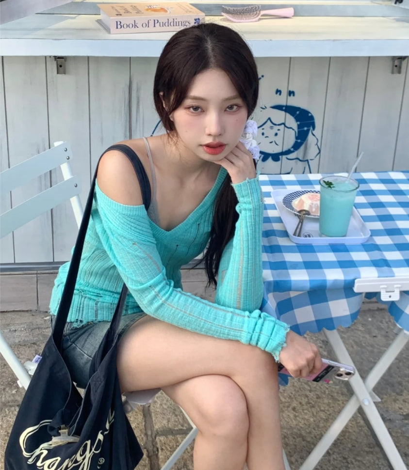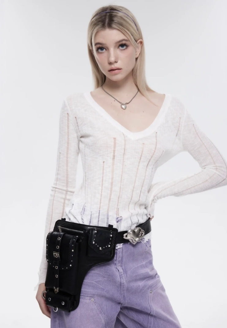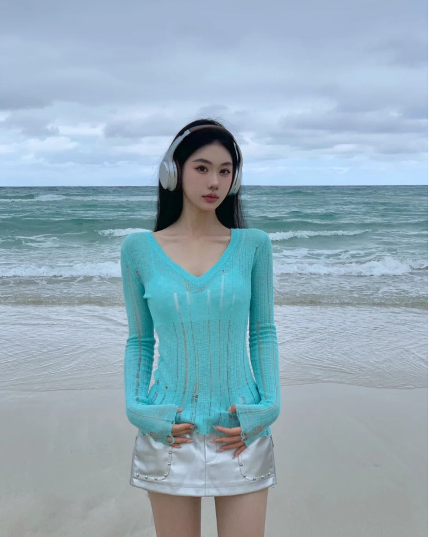 Hollow-Out V-Neck Thin Cardigan With Distressed Waist Knit Top