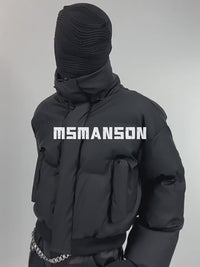 Cropped puffer jacket with a high stand collar and matte finish, designed for warmth and structure.