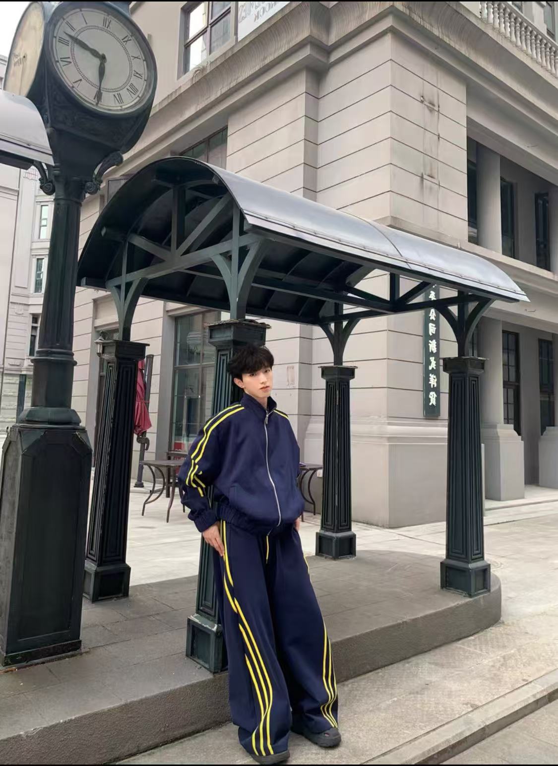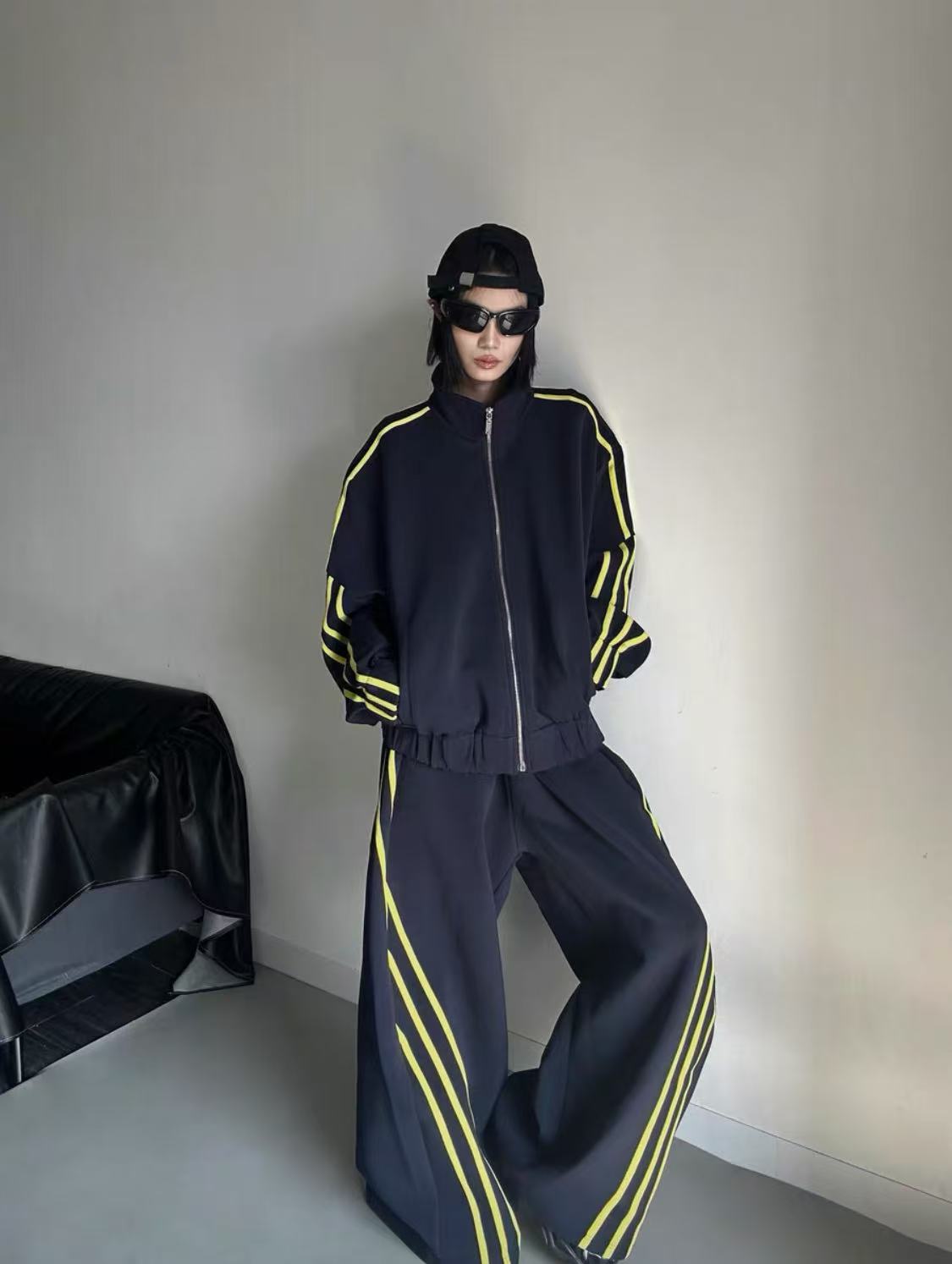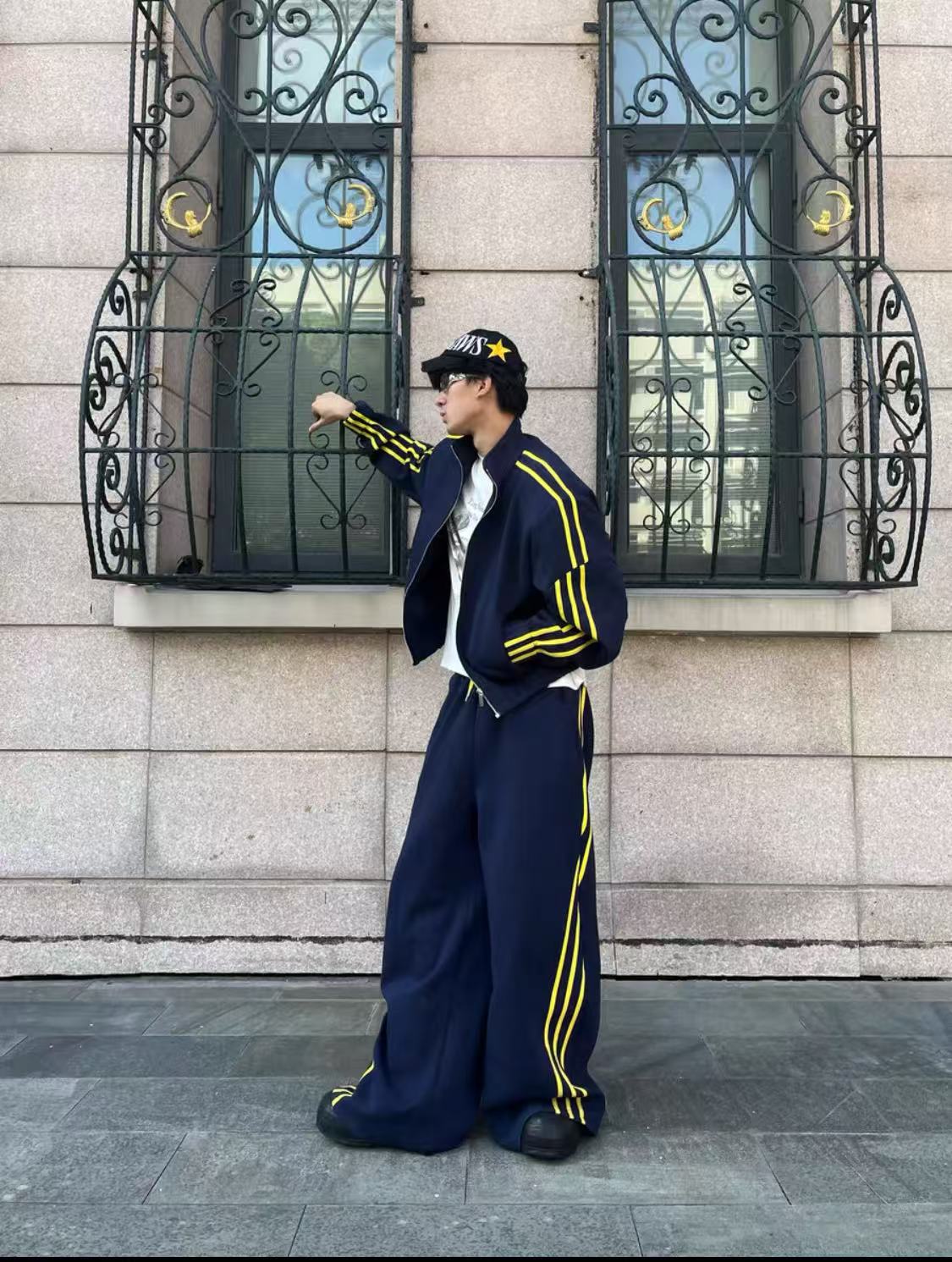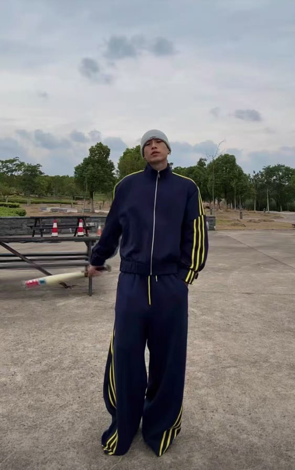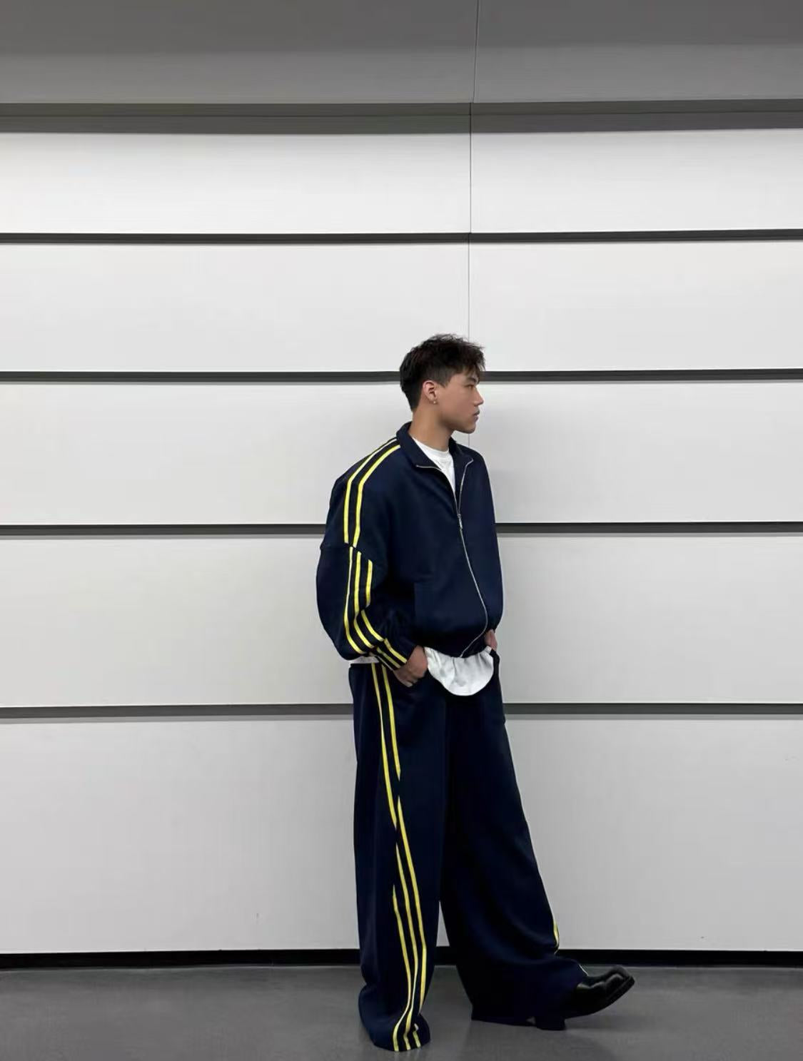 Oversized navy blue tracksuit set with bold yellow side stripes. Features classic three-stripe detailing, zip-up jacket with raglan sleeves, wide-leg pants, and detachable shoulder pads for an elevated streetwear silhouette.