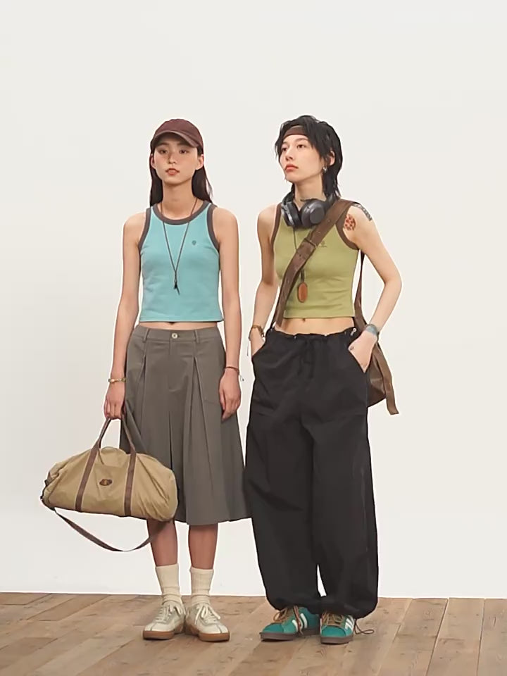 This slightly elastic, contrast-color fitted racerback tank top is incredibly slimming. It perfectly divides body proportions, offering effortless summer color coordination. The matching embroidery colors add a playful touch. Available in four color options.