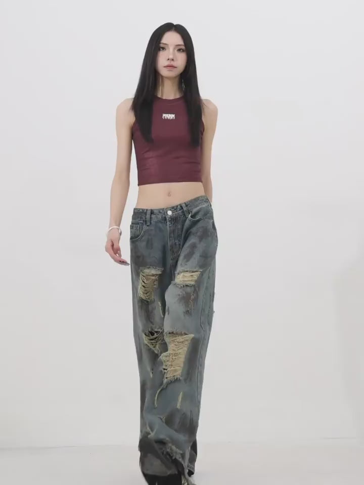 Retro Tie-Dye Distressed Wide-Leg Jeans With Washed Effect And Draping Fit