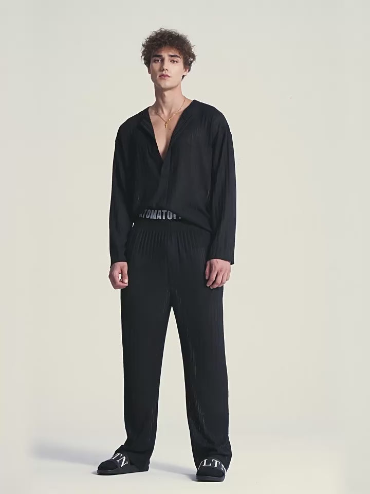 Crafted from a custom stripe woven fabric (94% Polyester, 6% Spandex), this 210g jumpsuit offers a soft, comfortable feel while maintaining a firm, shaped structure. The ribbed texture adds a touch of elegance to your relaxed look.