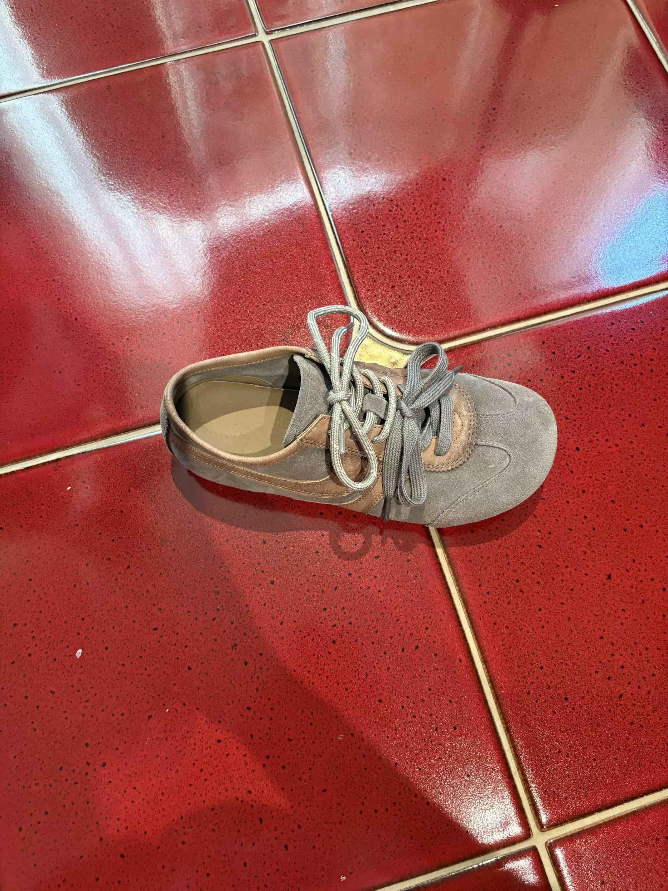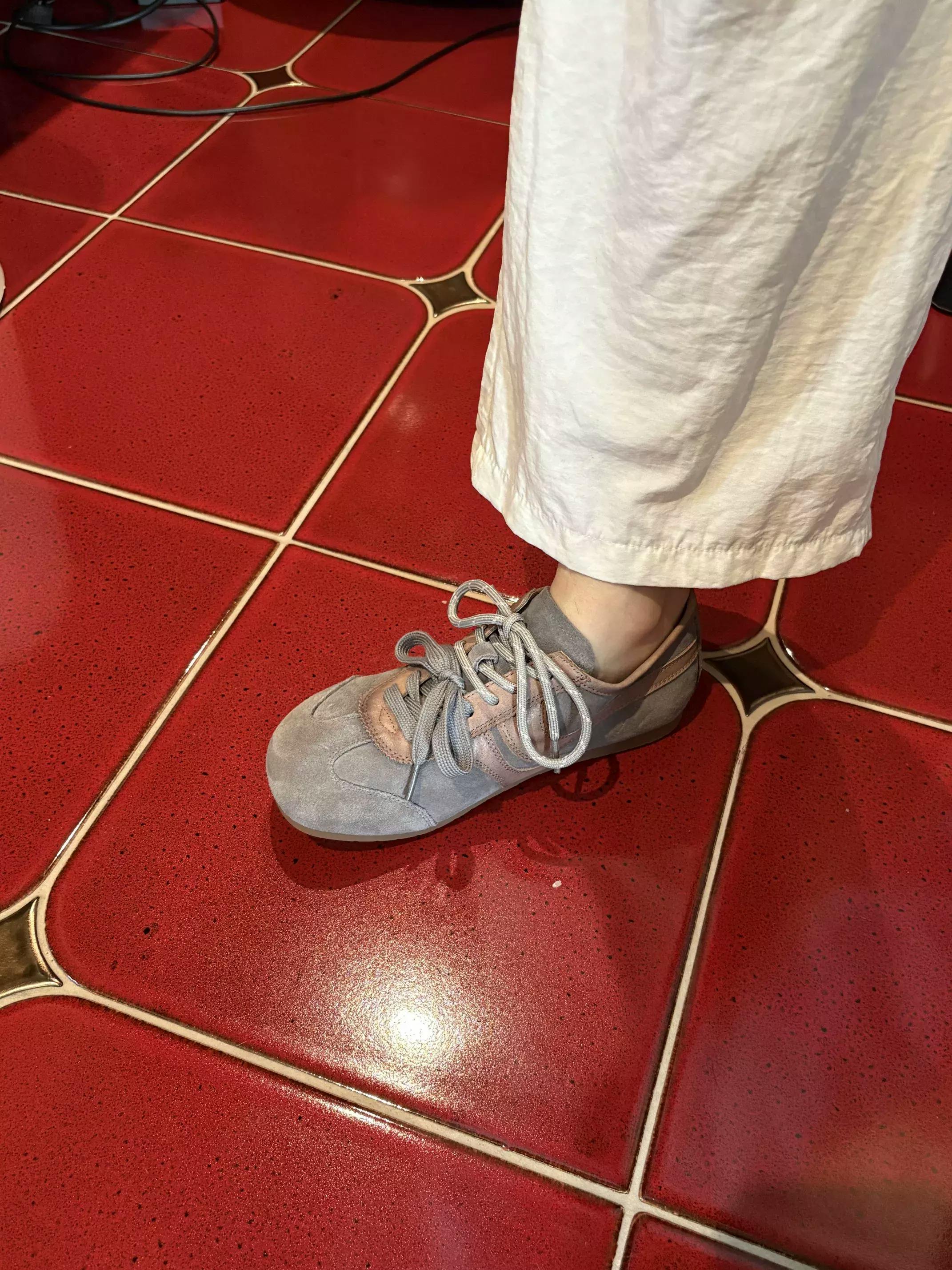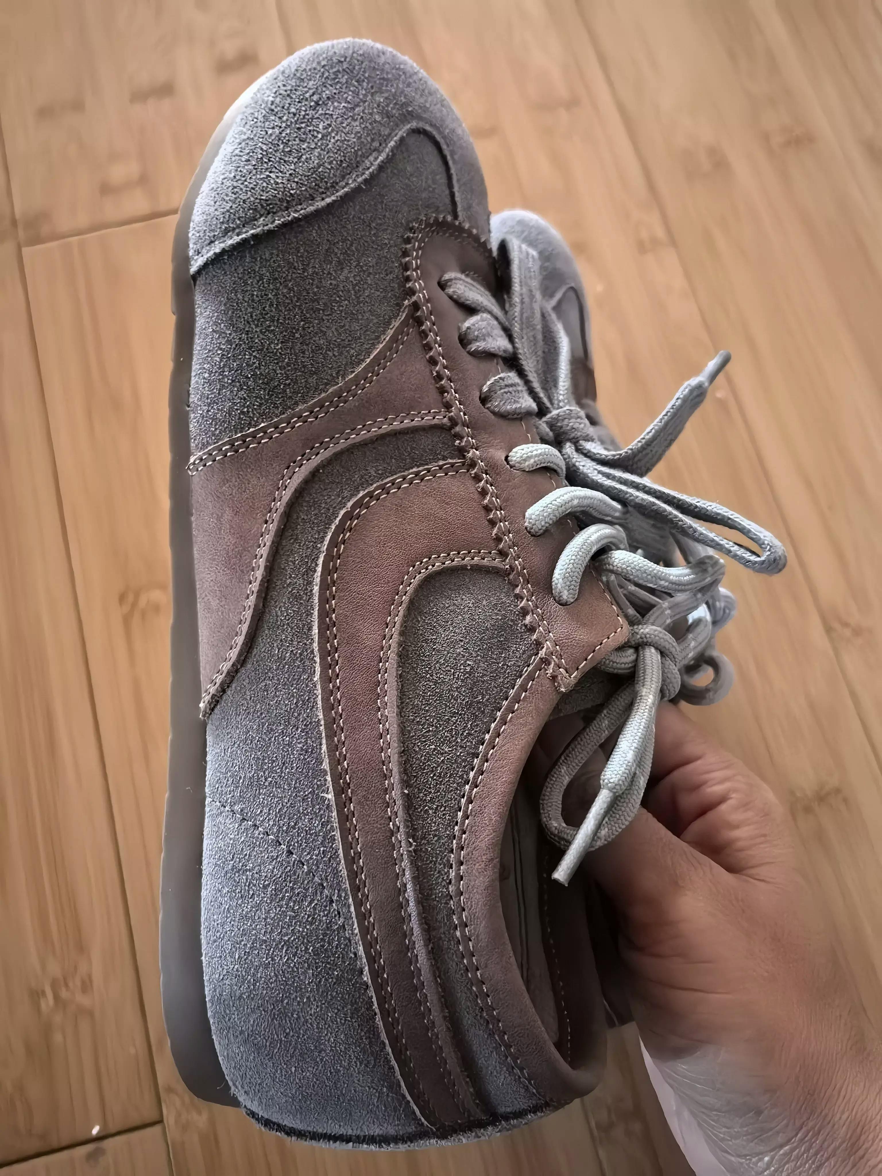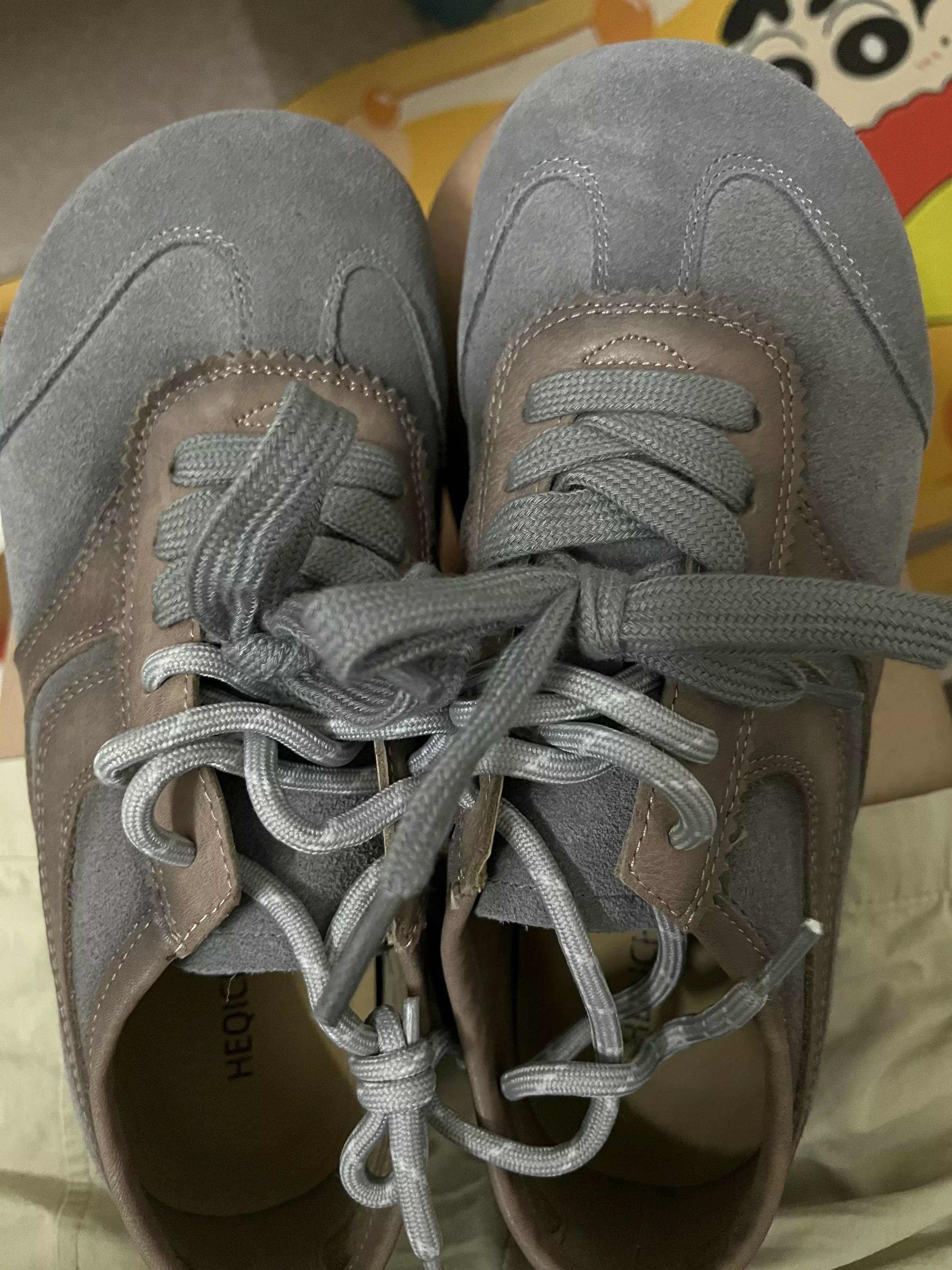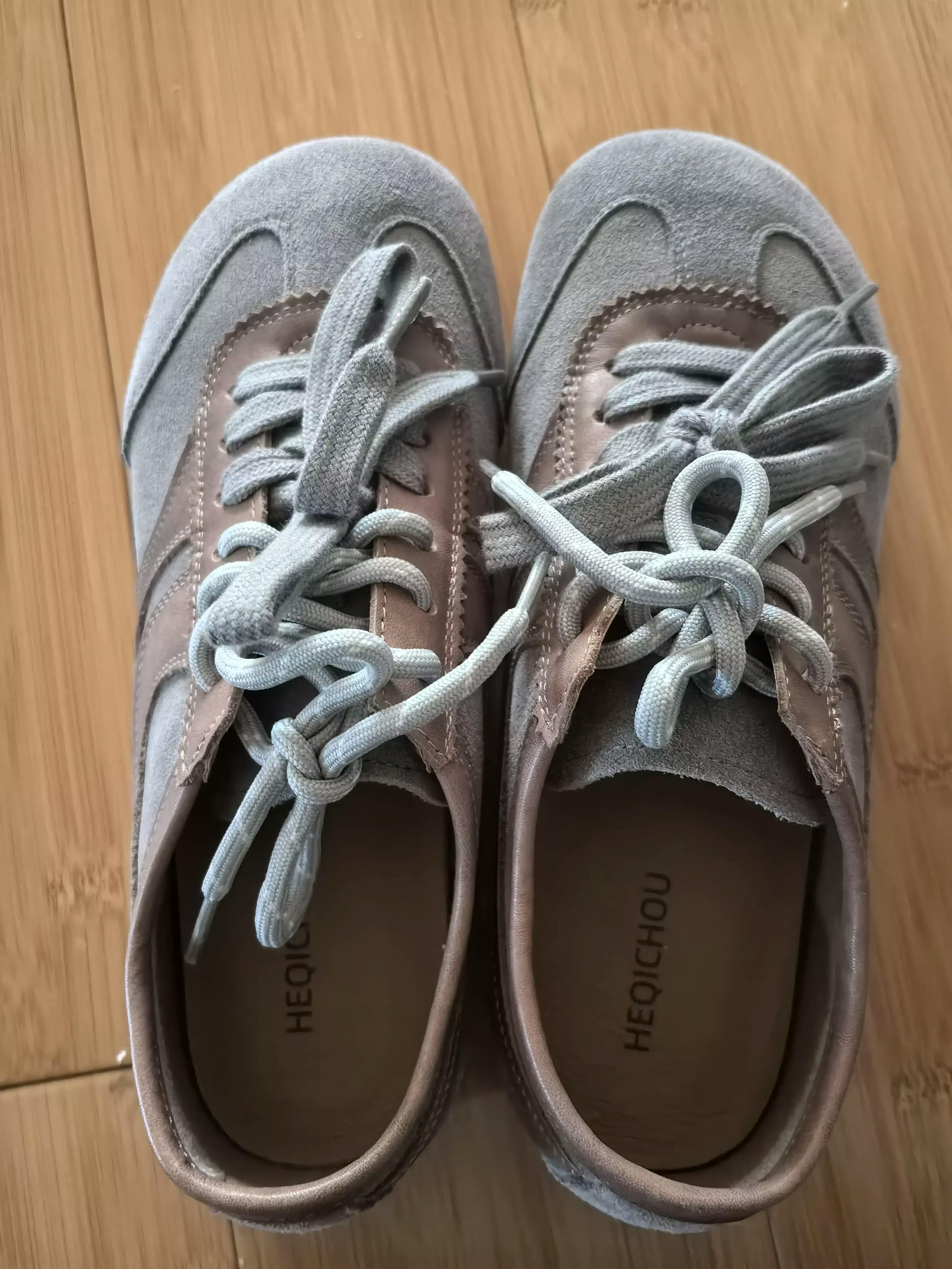 This features a pair of grey lace-up sneakers with a soft, rounded silhouette and contrasting brown details. The upper is made from cowhide leather, while the insole uses top layer pigskin for added comfort. With a 2.5cm sole height and no inner lining, these sneakers are designed for breathable, everyday wear.