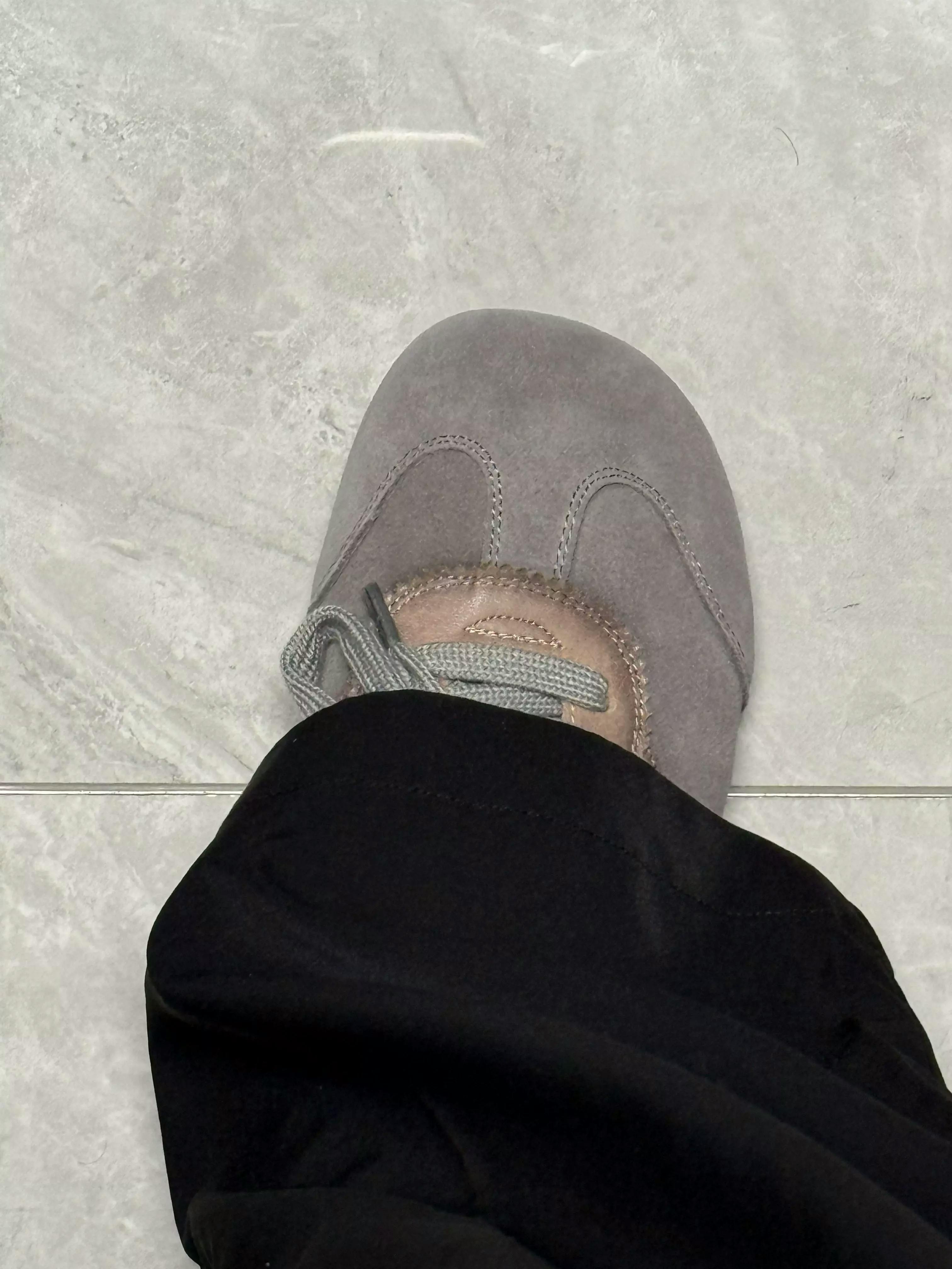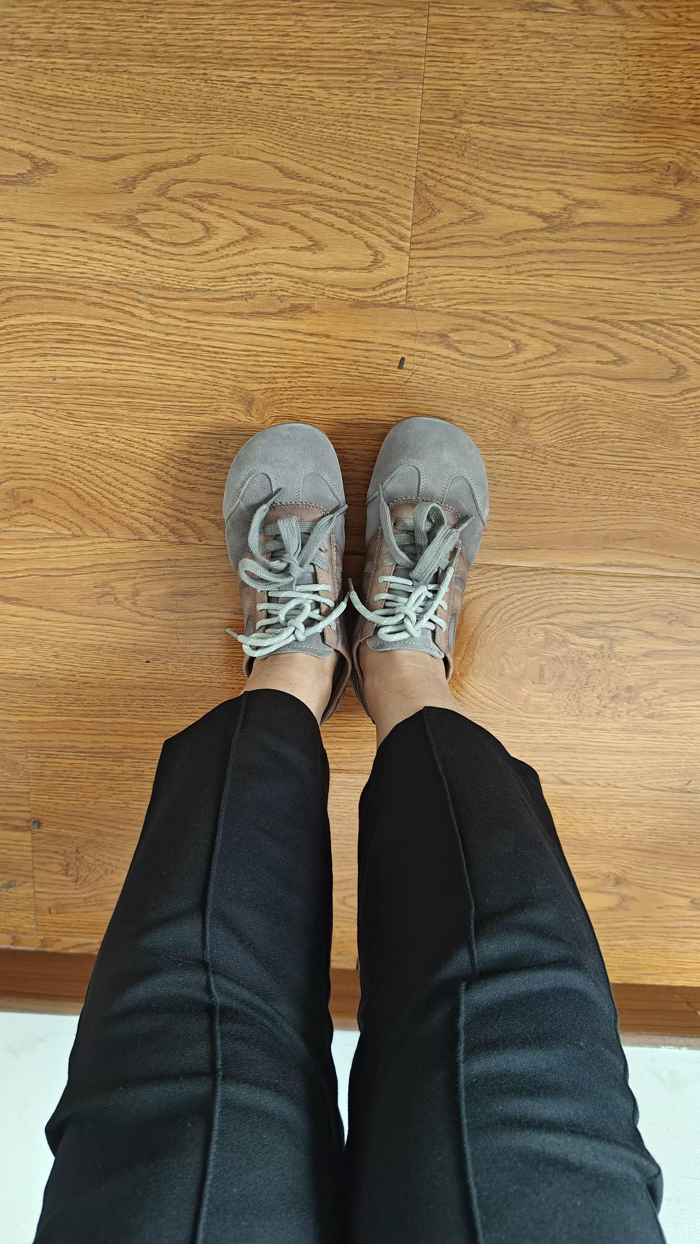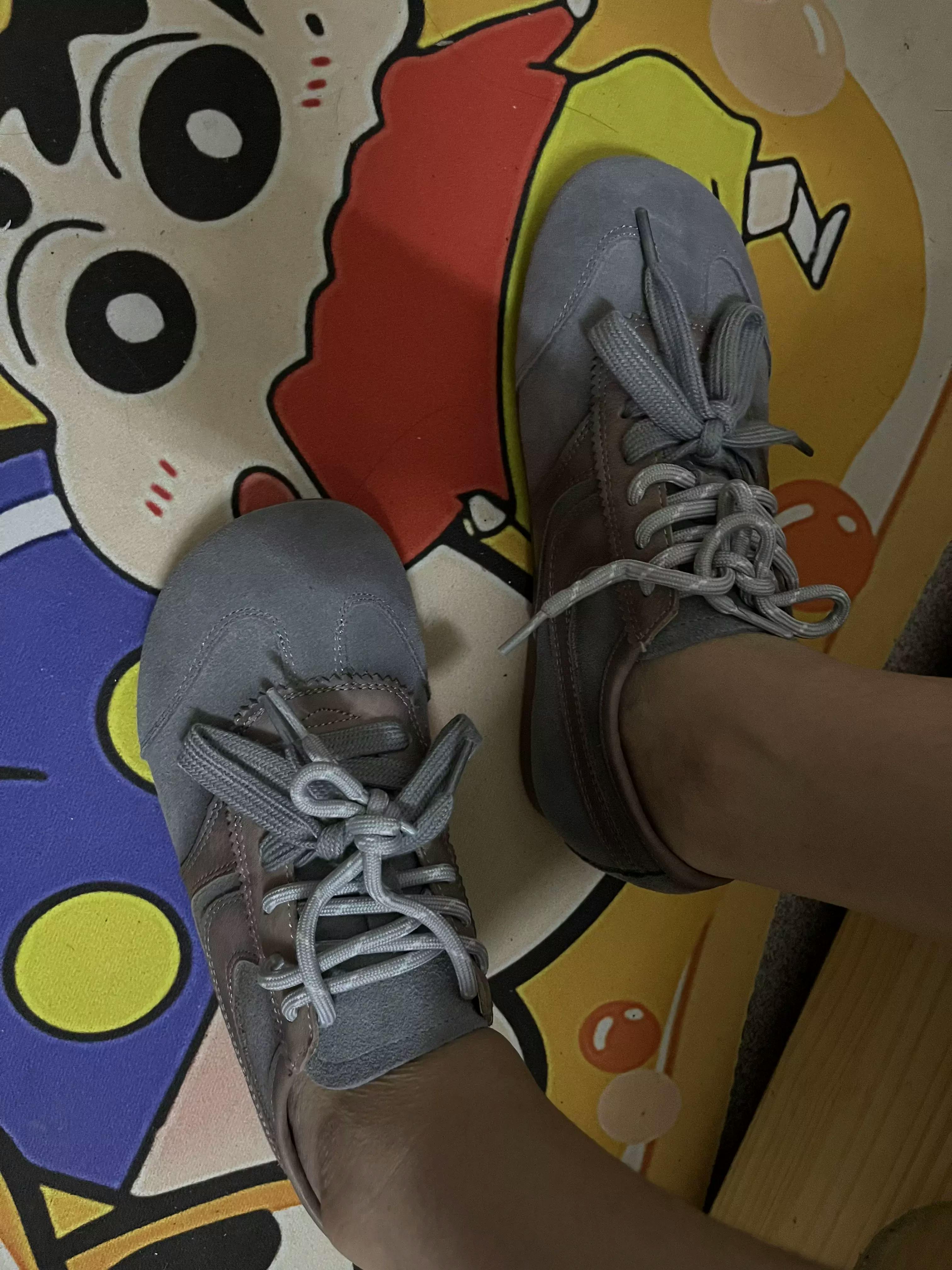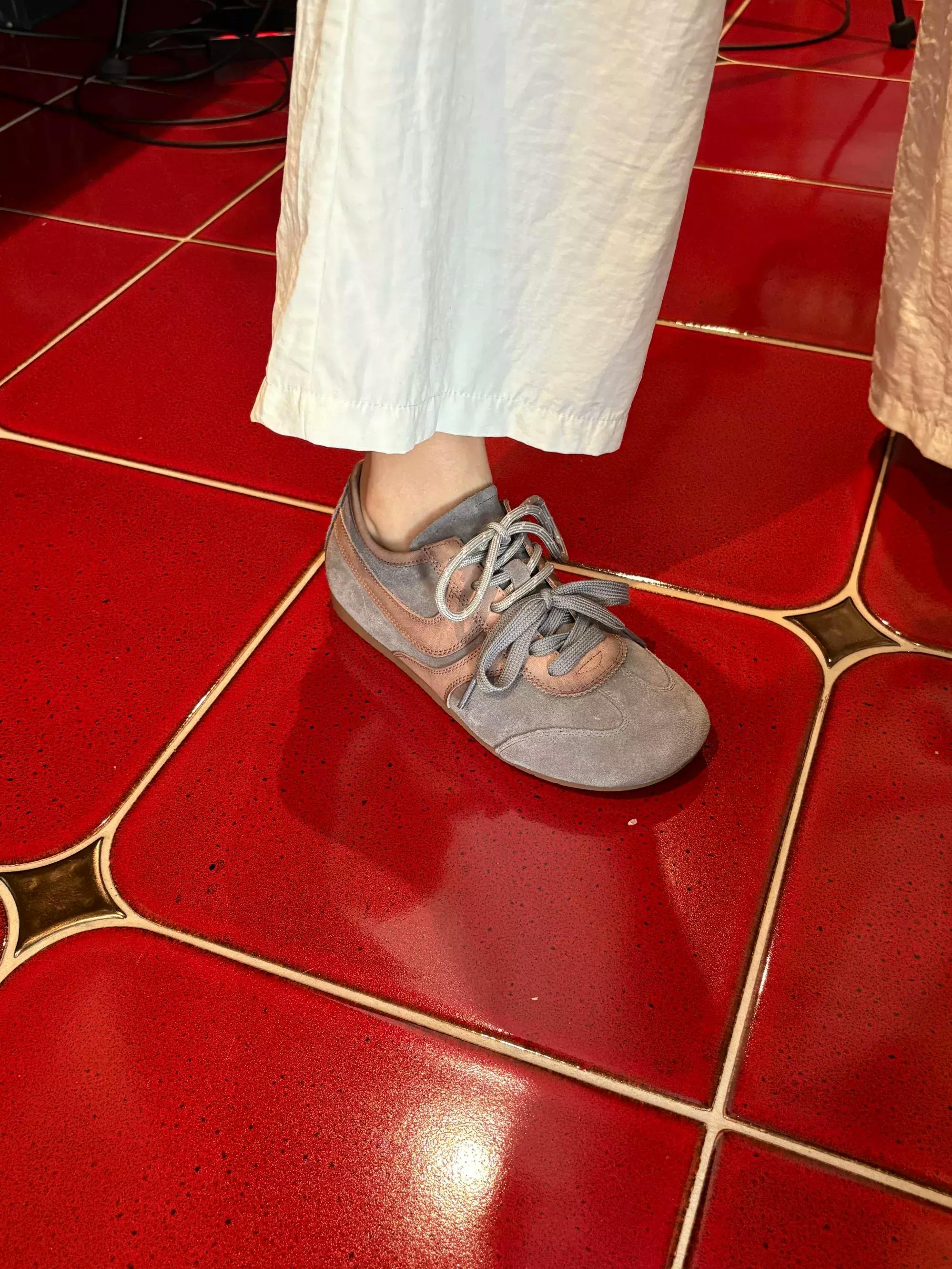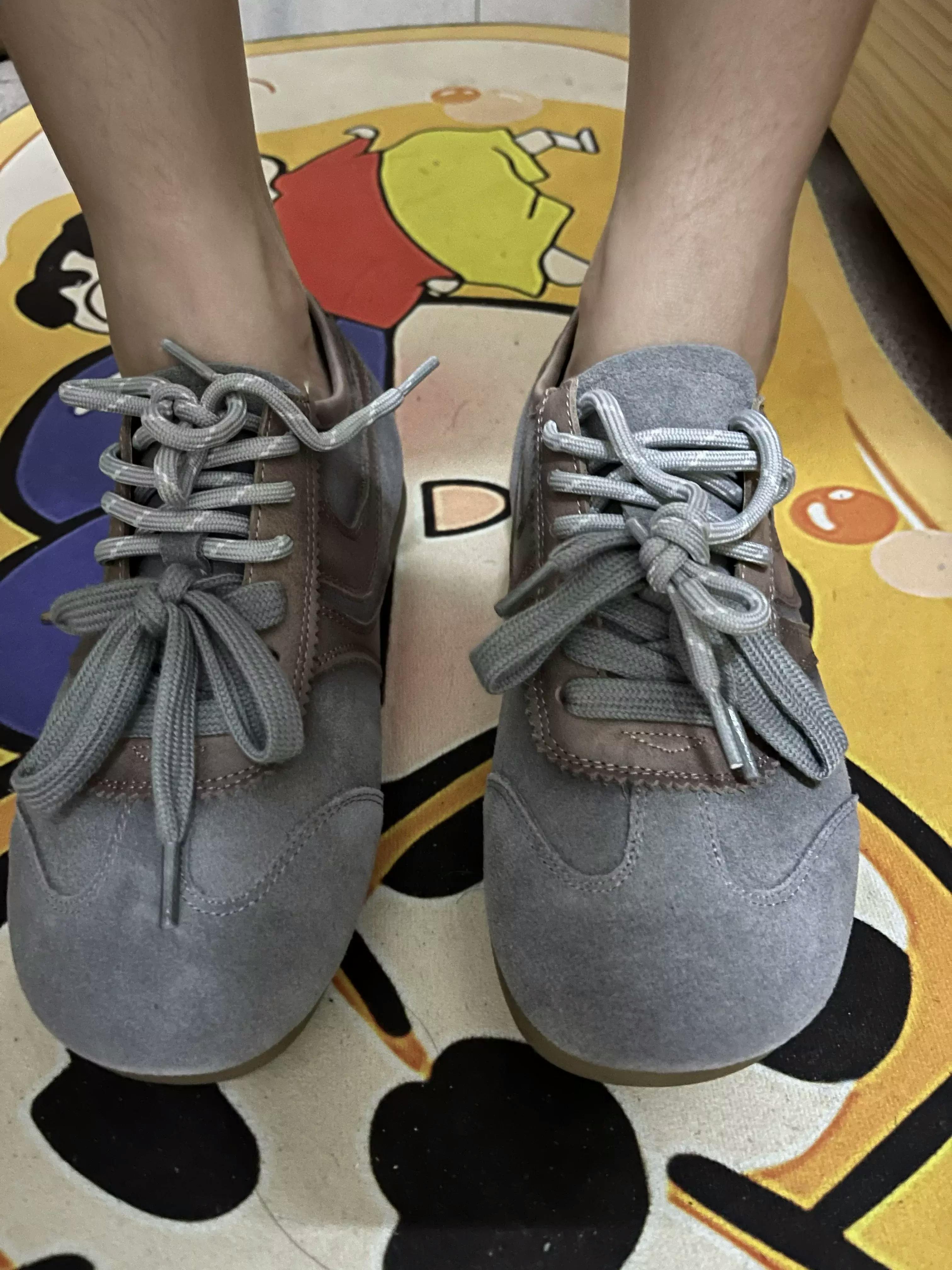 This features a pair of grey lace-up sneakers with a soft, rounded silhouette and contrasting brown details. The upper is made from cowhide leather, while the insole uses top layer pigskin for added comfort. With a 2.5cm sole height and no inner lining, these sneakers are designed for breathable, everyday wear.