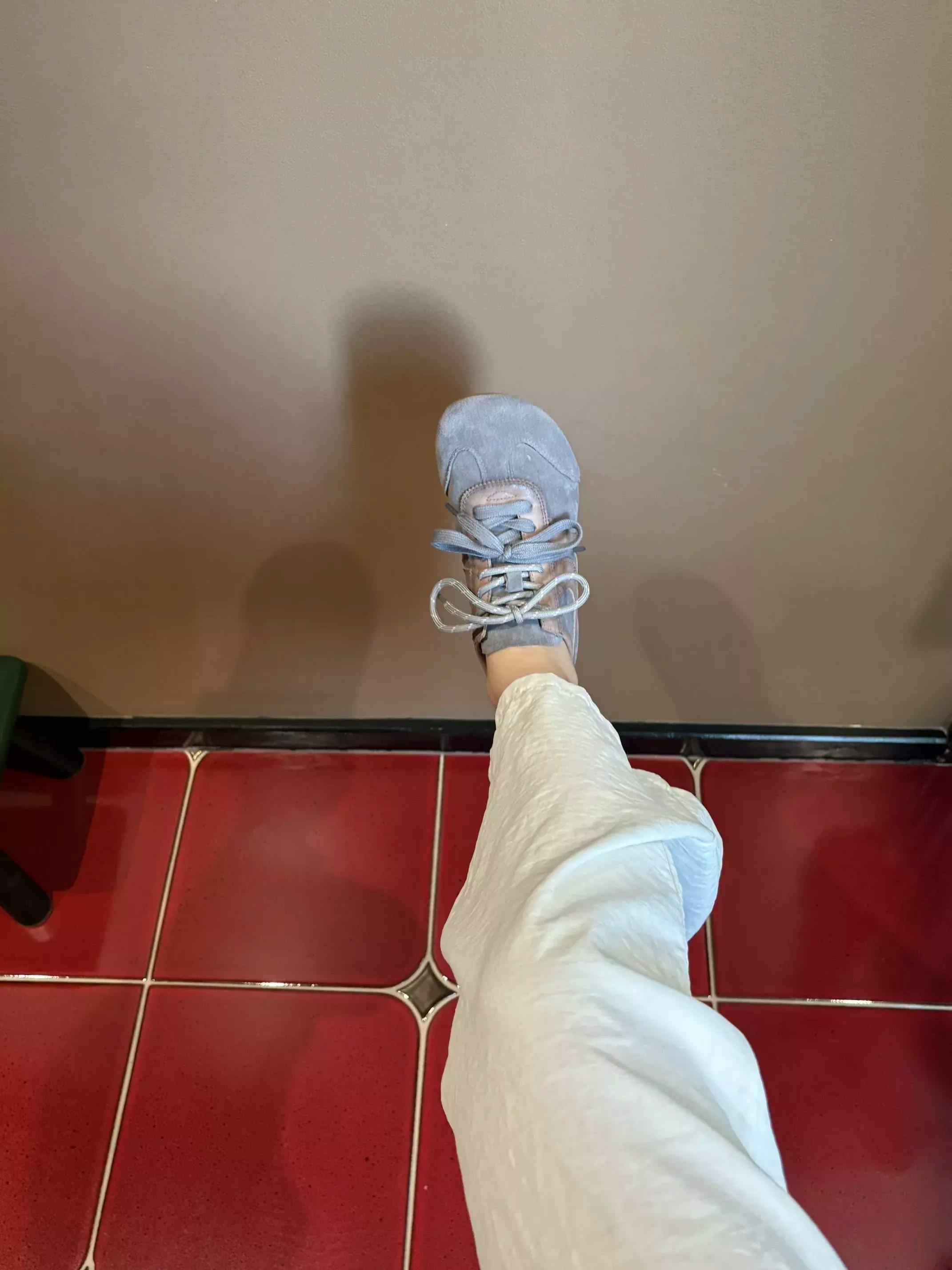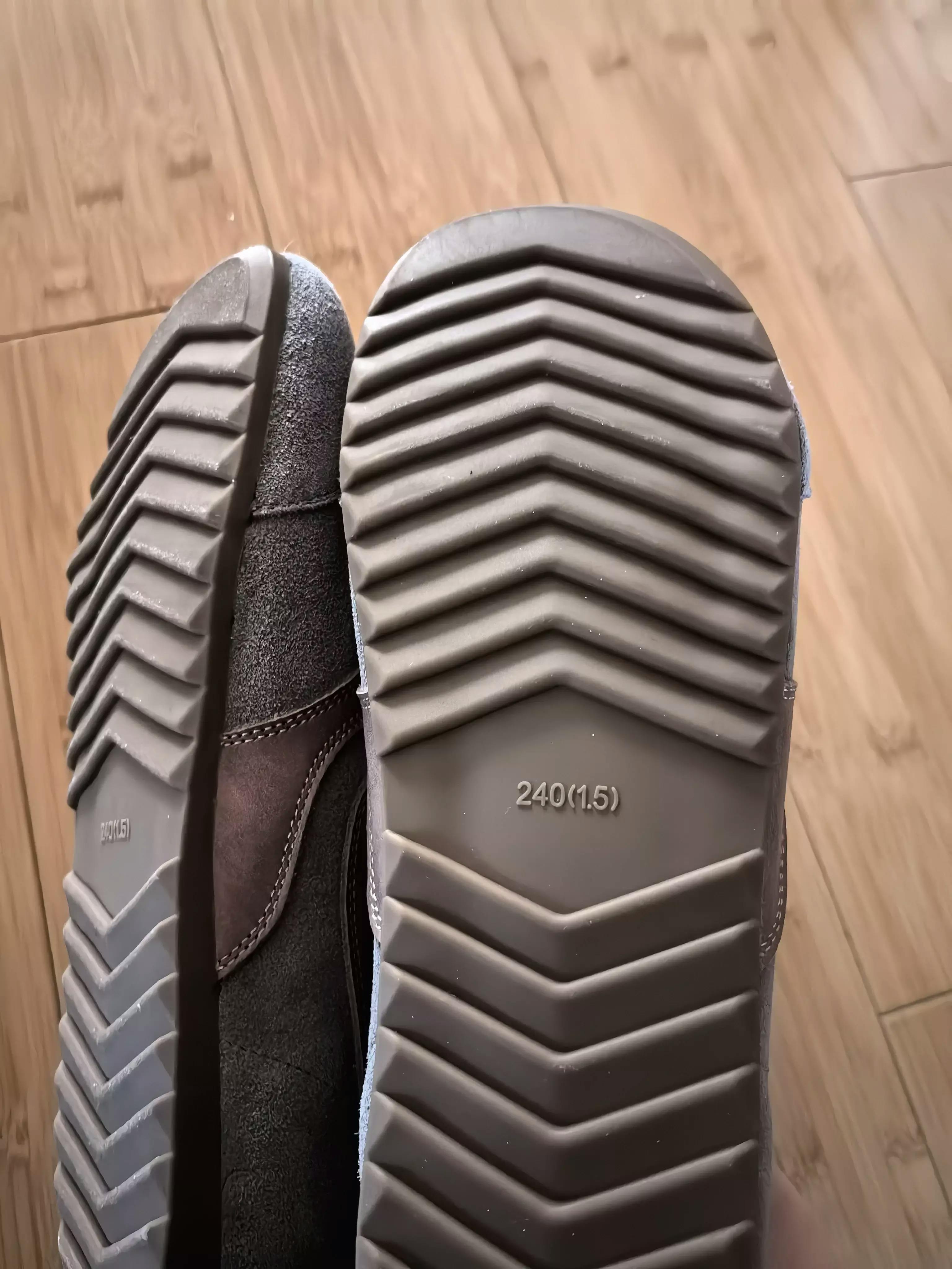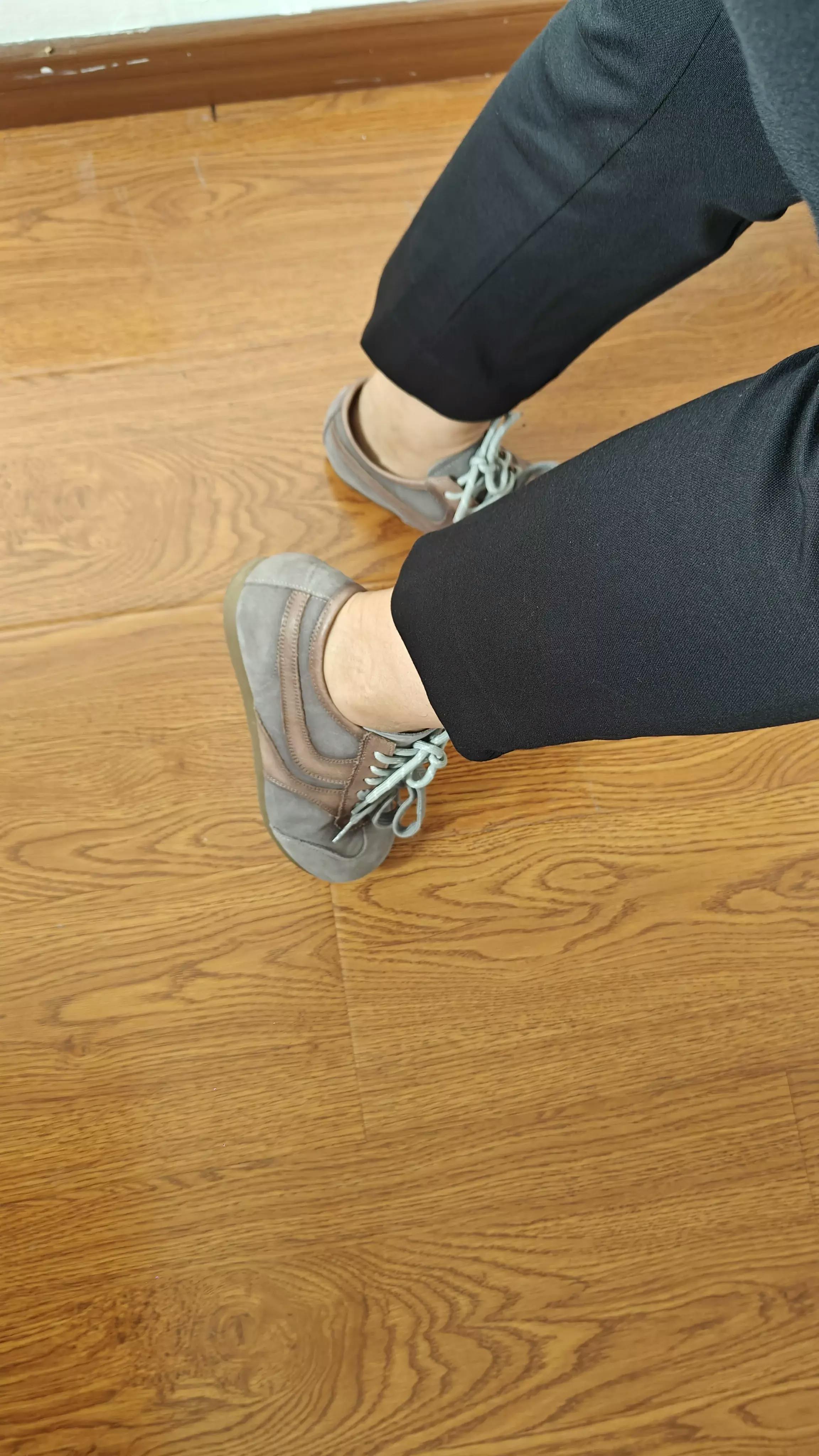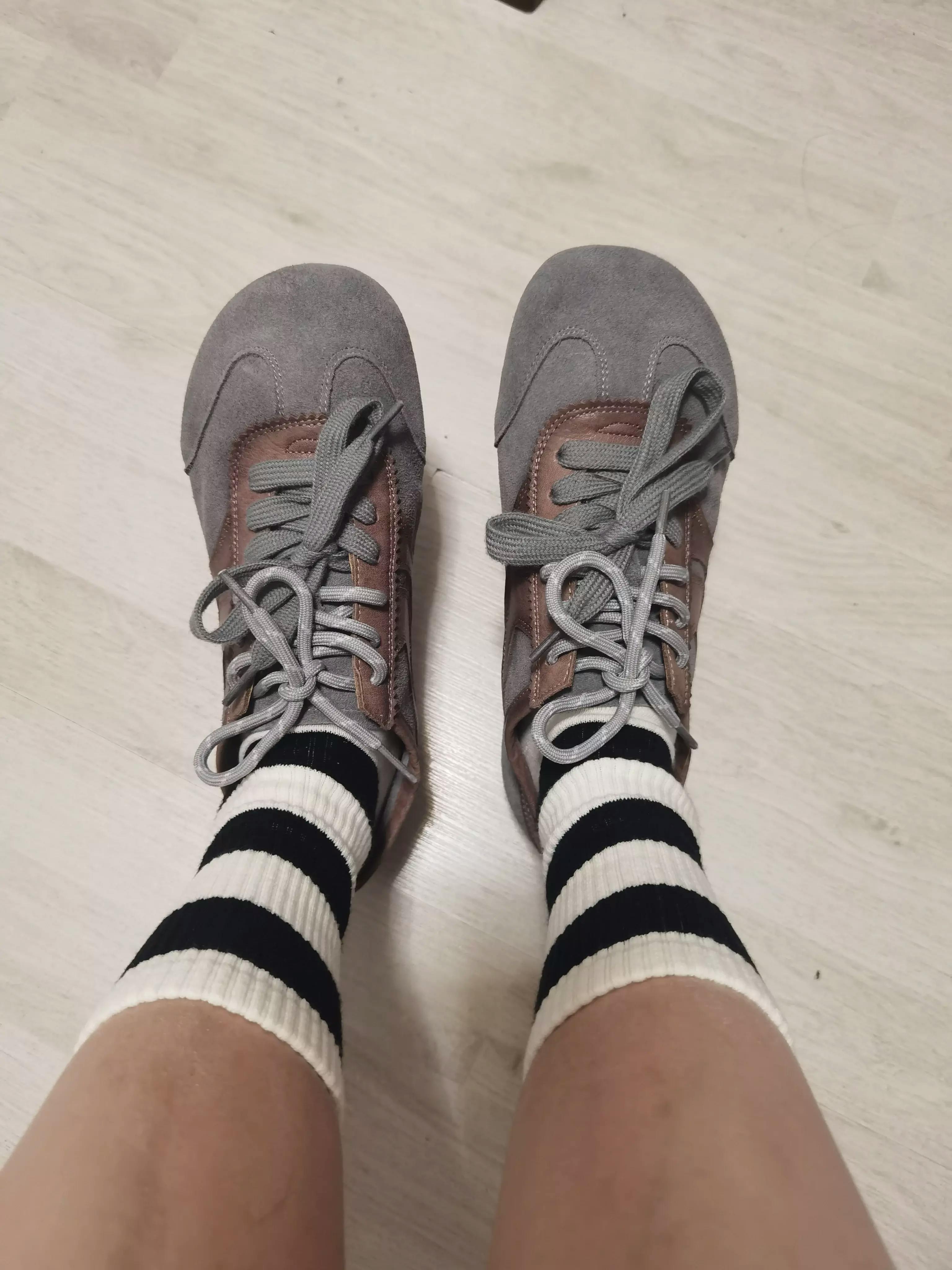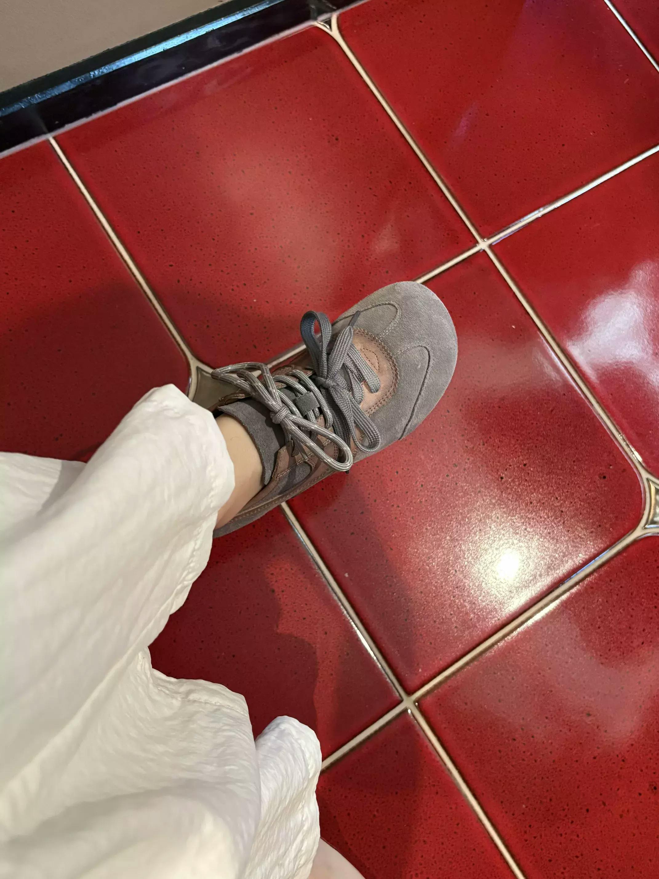 This features a pair of grey lace-up sneakers with a soft, rounded silhouette and contrasting brown details. The upper is made from cowhide leather, while the insole uses top layer pigskin for added comfort. With a 2.5cm sole height and no inner lining, these sneakers are designed for breathable, everyday wear.