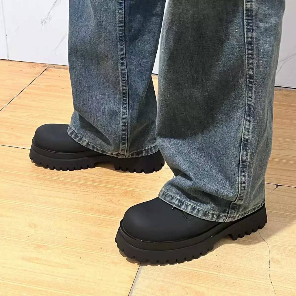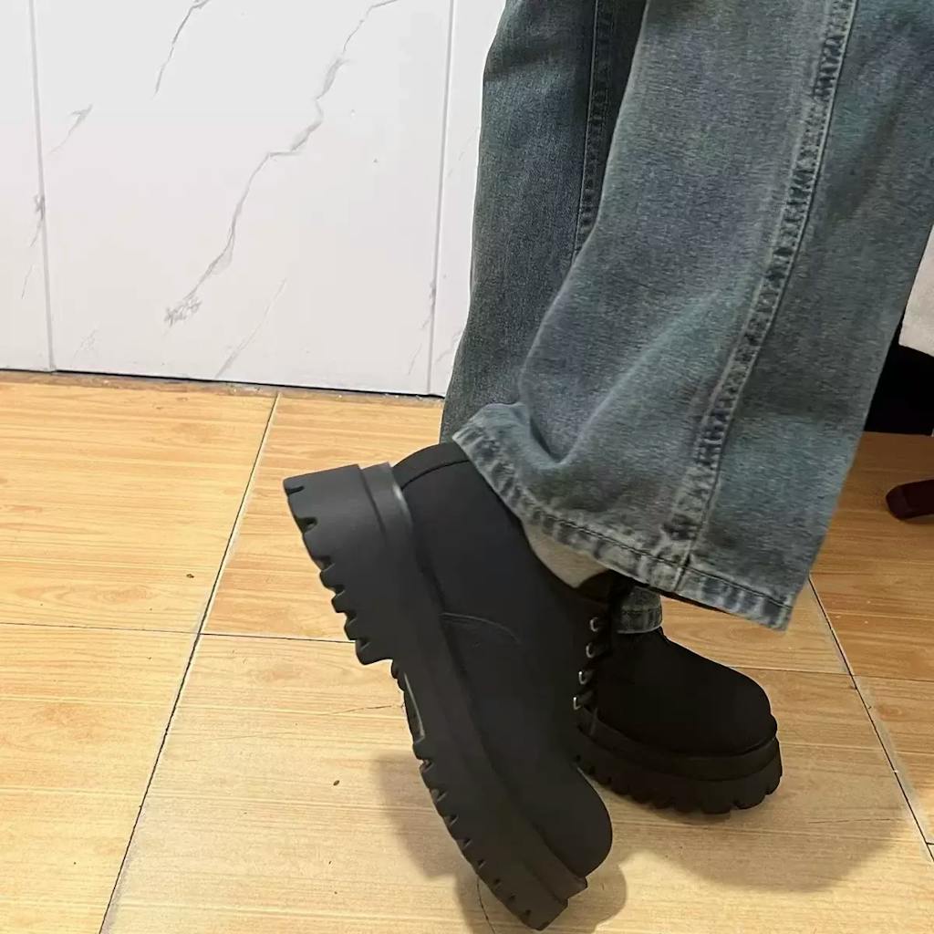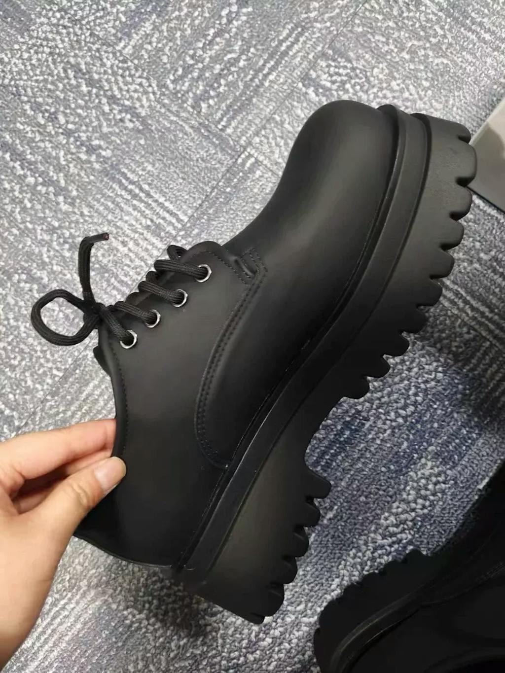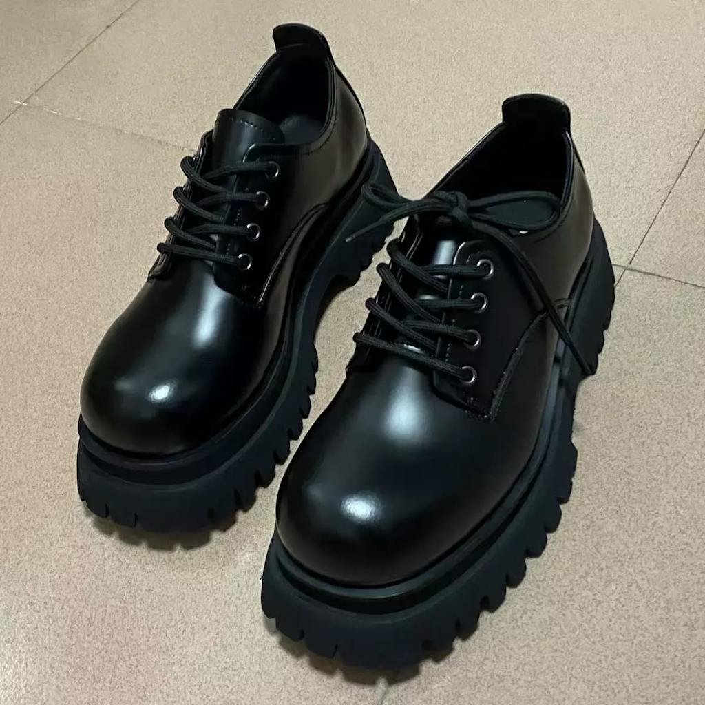 These shoes are a bold, modern take on classic British-style casual leather shoes, designed to stand out with a chunky, thick-soled silhouette. The upper is made from synthetic leathe, providing a sleek, contemporary look, while the inside features a comfortable PU lining and insole. With a round toe, lace-up closure, and a high-traction rubber sole, these shoes offer both style and a noticeable height boost. Perfect for youth, they’re suitable for spring and autumn daily wear and are available in matte or glossy black finishes.