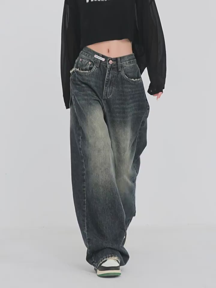 Vintage High Street Deep Blue Wide-Leg Denim Pants
