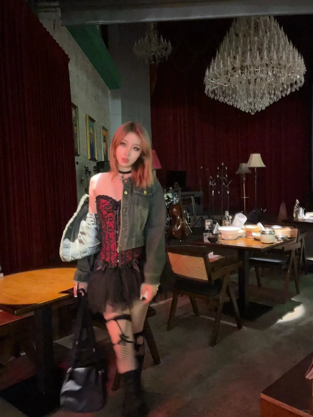 The wannathis Gothic Lace-Up Corset is a striking bustier featuring a red and black floral brocade pattern with ruffle trim. This corset combines the elegance of floral brocade with the edgy appeal of a lace-up design, creating a bold and fashionable look. The ruffle trim adds a touch of romantic charm, making it perfect for gothic-inspired outfits.