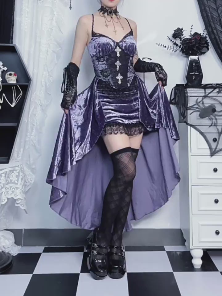 The wannathis Gothic Velvet Corset Dress Set is a stunning ensemble featuring a purple high-low gown with lace trim and a black lace bolero. This set combines the opulent texture of velvet with delicate lace details, creating a dramatic and elegant gothic look. The corset-style bodice offers a flattering fit, while the high-low hem adds a touch of modern sophistication. The black lace bolero completes the ensemble with a vintage-inspired charm. .